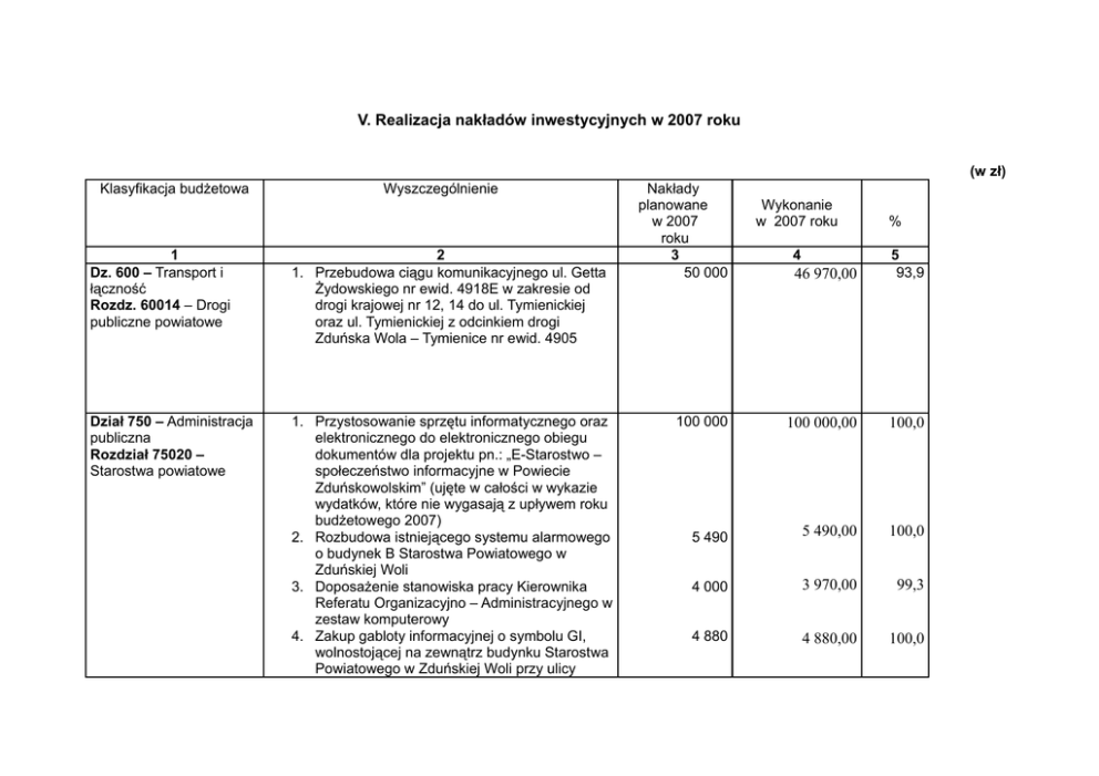 V. Realizacja nakładów inwestycyjnych w 2007 roku (w zł) Klasyfikacja budżetowa Wyszczególnienie 1 Dz. 600 – Transport i łączność Rozdz. 60014 – Drogi publiczne powiatowe 2 1. Przebudowa ciągu komunikacyjnego ul. Getta Żydowskiego nr ewid. 4918E w zakresie od drogi krajowej nr 12, 14 do ul. Tymienickiej oraz ul. Tymienickiej z odcinkiem drogi Zduńska Wola – Tymienice nr ewid. 4905 Dział 750 – Administracja publiczna Rozdział 75020 – Starostwa powiatowe 1. Przystosowanie sprzętu informatycznego oraz elektronicznego do elektronicznego obiegu dokumentów dla projektu pn.: „E-Starostwo – społeczeństwo informacyjne w Powiecie Zduńskowolskim” (ujęte w całości w wykazie wydatków, które nie wygasają z upływem roku budżetowego 2007) 2. Rozbudowa istniejącego systemu alarmowego o budynek B Starostwa Powiatowego w Zduńskiej Woli 3. Doposażenie stanowiska pracy Kierownika Referatu Organizacyjno – Administracyjnego w zestaw komputerowy 4. Zakup gabloty informacyjnej o symbolu GI, wolnostojącej na zewnątrz budynku Starostwa Powiatowego w Zduńskiej Woli przy ulicy Nakłady planowane w 2007 roku 3 50 000 Wykonanie w 2007 roku 4 % 46 970,00 5 93,9 100 000 100 000,00 100,0 5 490 5 490,00 100,0 4 000 3 970,00 99,3 4 880 4 880,00 100,0 Złotnickiego 25 (w wysokości 2 440 zł przewidziane do realizacji jako wydatki, które nie wygasają z upływem roku budżetowego 2007) Dział 750 – Administracja publiczna Rozdział 75045 – Komisje poborowe Dział 754 – Bezpieczeństwo publiczne i ochrona przeciwpożarowa, Rozdział 75405 – Komendy powiatowe Policji Dział 754 – Bezpieczeństwo publiczne i ochrona przeciwpożarowa Rozdział 75411 – Komendy powiatowe Państwowej Straży Pożarnej (w tym 285 000 zł w ramach planu dochodów własnych jednostki) Dział 801 – Oświata i wychowanie Rozdział 80130 – Szkoły zawodowe 1. Zakup sprzętu komputerowego dla potrzeb Powiatowej Komisji Lekarskiej 4 000 3 970,00 99,3 1. Dofinansowanie zakupu nieoznakowanego radiowozu policyjnego dla potrzeb służby kryminalnej Komendy Powiatowej Policji 2. Dofinansowanie dokumentacji projektowej nowego budynku Komendy Powiatowej Policji 10 000 10 000,00 100,0 100 000 100 000,00 100,0 17 000 17 000,00 100,0 1 332 580 1 200 022,00 90,1 28 900 28 900,00 100,0 17 000 17 000,00 100,0 1. Zakup sprzętu transportowego, pożarniczego oraz kwatermistrzowskiego na potrzeby Komendy 2. Dofinansowanie zakupu ciężkiego samochodu ratowniczo – gaśniczego oraz samochodu operacyjnego i zestawu hydraulicznego (w tym, ze środków rachunku dochodów własnych – 285 000 zł - plan). 1. Zakup samochodu służbowego na potrzeby Zespołu Szkół Rolnicze Centrum Kształcenia Ustawicznego w Wojsławicach 2. Zakup trzech pomp zapasowych typu: WILO TOP-F80/1-10, WILO I L658110-3/2, WILO TOP S 40/7, niezbędnych do prawidłowego funkcjonowania kotłowni w Zespole Szkół Rolnicze Centrum Kształcenia Ustawicznego Dział 801 – Oświata i wychowanie Rozdział 80195 – Pozostała działalność Dział 851 – Ochrona zdrowia Rozdział 85111 – Szpitale ogólne Dział 852 – Pomoc społeczna Rozdział 85202 – Domy pomocy społecznej Dział 852 – Pomoc społeczna Rozdział 85203 – Ośrodki wsparcia w Wojsławicach (zadania ujęte zostały w całości w wykazie wydatków, które nie wygasają z upływem roku budżetowego 2007) 1. Nowoczesna szkoła a regionalny rynek pracy – częściowa wymiana stolarki okiennej i drzwiowej w budynku I Liceum Ogólnokształcącego im. Kazimierza Wielkiego w Zduńskiej Woli 1. Modernizacja apteki SPZOZ – wykonanie dokumentacji technicznej 2. Doposażenie Oddziału i Działu Rehabilitacji w SPZOZ w Zduńskiej Woli, ul. Królewska 29 3. Zakup ambulansu dla Samodzielnego Publicznego Zespołu Opieki Zdrowotnej w Zduńskiej Woli 1. Instalacja oświetlenia awaryjnego zgodnie z zaleceniami pokontrolnymi w Domu Pomocy Społecznej w Zduńskiej Woli 1. Zakup samochodu osobowego dla przewozu osób niepełnosprawnych dla potrzeb Środowiskowego Domu Samopomocy w Przatówku (w wysokości 19 000 zł przewidziane do realizacji jako wydatki, które nie wygasają z upływem roku budżetowego 2007 – zgodnie z uchwałą Rady Powiatu, natomiast kwota 200 000 zł zgłoszona została do wykazu wydatków budżetu państwa, które nie wygasają z upływem roku budżetowego 2007) 784 000 227 392,99 29,0 20 000 0,00 0 144 362 144 347,24 100,0 330 000 329 996,11 100,0 20 000 19 260,00 96,3 219 000 19 000,00 8,7 Dział 900 – Gospodarka komunalna i ochrona środowiska Rozdział 90011 – Fundusz Ochrony Środowiska i Gospodarki Wodnej (50 000 zł) Dział 801 – Oświata i wychowanie, Rozdział 80130 – Szkoły zawodowe (3 964 790 zł - plan) Razem 1. Modernizacja systemu ciepłowniczego, wraz z termomodernizacją budynków Zespołu Szkół Rolnicze Centrum Kształcenia Ustawicznego w Wojsławicach (w tym ze środków Powiatowego Funduszu Ochrony Środowiska i Gospodarki Wodnej – 50 000 zł). 4 014 790 3 862 658,04 96,2 7 206 002 6 140 856,38 85,2