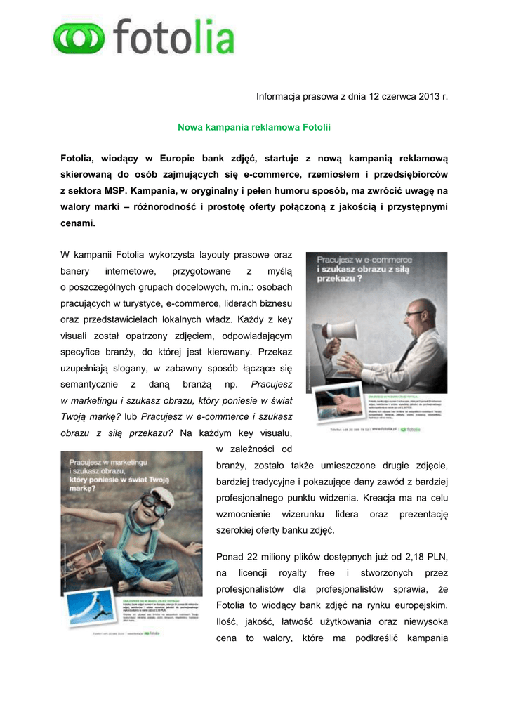 Informacja prasowa z dnia 12 czerwca 2013 r. Nowa kampania reklamowa Fotolii Fotolia, wiodący w Europie bank zdjęć, startuje z nową kampanią reklamową skierowaną do osób zajmujących się e-commerce, rzemiosłem i przedsiębiorców z sektora MSP. Kampania, w oryginalny i pełen humoru sposób, ma zwrócić uwagę na walory marki – różnorodność i prostotę oferty połączoną z jakością i przystępnymi cenami. W kampanii Fotolia wykorzysta layouty prasowe oraz banery internetowe, przygotowane z myślą o poszczególnych grupach docelowych, m.in.: osobach pracujących w turystyce, e-commerce, liderach biznesu oraz przedstawicielach lokalnych władz. Każdy z key visuali został opatrzony zdjęciem, odpowiadającym specyfice branży, do której jest kierowany. Przekaz uzupełniają slogany, w zabawny sposób łączące się semantycznie z daną branżą np. Pracujesz w marketingu i szukasz obrazu, który poniesie w świat Twoją markę? lub Pracujesz w e-commerce i szukasz obrazu z siłą przekazu? Na każdym key visualu, w zależności od branży, zostało także umieszczone drugie zdjęcie, bardziej tradycyjne i pokazujące dany zawód z bardziej profesjonalnego punktu widzenia. Kreacja ma na celu wzmocnienie wizerunku lidera oraz prezentację szerokiej oferty banku zdjęć. Ponad 22 miliony plików dostępnych już od 2,18 PLN, na licencji royalty profesjonalistów dla free i stworzonych profesjonalistów przez sprawia, że Fotolia to wiodący bank zdjęć na rynku europejskim. Ilość, jakość, łatwość użytkowania oraz niewysoka cena to walory, które ma podkreślić kampania skierowana do wybranych grup docelowych, zwłaszcza gdy na rynku ceni się przystępną, dobrą jakościowo oraz wyróżniającą komunikację wizualną. Kampania o zasięgu międzynarodowym, została zrealizowana przez agencję Editialis Factory. Działania w internecie oraz prasie branżowej pojawią się na przełomie maja i czerwca i potrwają kilka miesięcy. Dodatkowe informacje oraz zdjęcia można znaleźć na stronie http://pl.fotolia.com *** Informacje dodatkowe o banku zdjęć Fotolia Fotolia, wiodący w Europie bank zdjęć typu microstock, z siedzibą w Nowym Yorku, dostarcza swoje usługi dla klientów 23 krajów i regionów, w 13 różnych językach. Posiadając w swoich zasobach wybór ponad 22 milionów obrazów cyfrowych i klipów wideo, Fotolia oferuje jedną z największych na świecie baz obrazów cyfrowych wysokiej jakości. Ponad 4 miliony osób wybiera serwis Fotolia jako źródło zdjęć, ilustracji, grafik wektorowych i wideo HD royalty-free w przystępnej cenie. Wraz z pojawieniem się Kolekcji Infinite, Fotolia stała się pierwszym ogólnoświatowym microstockiem oferującym obrazy pochodzące od profesjonalnych agencji, jak i artystów niezależnych. Przywództwo serwisu Fotolia w sektorze obrazów cyfrowych jest rozpoznawalne poprzez szeroką współpracę, m.in. z Associated Press.