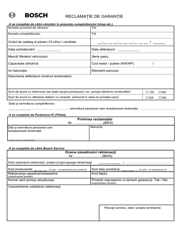 RECLAMAȚIE DE GARANȚIE A se completa de către vânzător în prezența cumpărătorului (shop etc.) Numele punctului de vânzare: Tel. Numele cumpărătorului: Tel. Codul de catalog al piesei (10 cifre) / cantitate Data achiziționării: . : : : Data defecțiunii: . . / . Marcă/ Modelul vehiculului: Serie șasiu: Capacitate cilindrică: Cod motor / putere (KW/HP): An fabricație: Kilometrii parcurși: / Descrierea defecțiunii (motivul reclamației): Sunt de acord cu intervenții sau teste asupra produsului ( ex. pompe electrice combustibil) Sunt de acord cu utilizarea datelor cu caracter personal în ceea ce privește cazul □ DA □ NU □ DA □ NU Data și semnătura cumpărătorului . _ ……………………………… semnătura persoanei care recepționeză reclamația …………………………….. . A se completa de Partenerul IC (Filiala) Primirea reclamației Nr ……………………..(BWS) Data și semnătura persoanei care recepționează reclamația . . Stampila ………………………… A se completa de către Bosch Service Ocena zasadności reklamacji Nr ……………………..(BWS) Data wpłynięcia reklamacji / podpis przyjmującego reklamację Kod producenta: (3 cyfry – na opakowaniu lub produkcie) Reklamacja zasadna/niezasadna _ ._ . _ / …………………………………….. Kod daty produkcji: produkcie) Kod błędu: (3 cyfry – na opakowaniu lub (niepotrzebne skreślić) Numer serii pompy wtryskowej: Produkt naprawiono w ramach gwarancji: Tak / Nie (niepotrzebne skreślić) Uzasadnienie oddalenia reklamacji: Pieczęć serwisu, data i podpis serwisanta