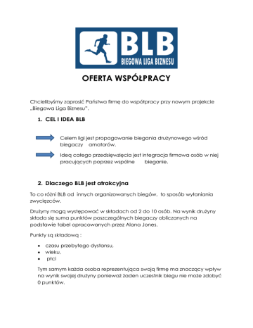 OFERTA WSPÓŁPRACY Chcielibyśmy zaprosić Państwa firmę do współpracy przy nowym projekcie „Biegowa Liga Biznesu”. 1. CEL I IDEA BLB Celem ligi jest propagowanie biegania drużynowego wśród biegaczy amatorów. Ideą całego przedsięwzięcia jest integracja firmowa osób w niej pracujących poprzez wspólne bieganie. 2. Dlaczego BLB jest atrakcyjna To co różni BLB od innych organizowanych biegów, to sposób wyłaniania zwycięzców. Drużyny mogą występować w składach od 2 do 10 osób. Na wynik drużyny składa się suma punktów poszczególnych biegaczy obliczanych na podstawie tabel opracowanych przez Alana Jones. Punkty są składową : czasu przebytego dystansu, wieku, płci Tym samym każda osoba reprezentująca swoją firmę ma znaczący wpływ na wynik swojej drużyny ponieważ żaden uczestnik biegu nie może zdobyć 0 punktów. BLB to przede wszystkim: Zespołowość Integracja Współodpowiedzialność Zdrowie a nie indywidualny wynik Startując w BLB liczy się przede wszystkim udział. . 3. Założenia ilości uczestników, Harmonogram BLB, System Grand Prix Założeniem BLB jest udział min. 15 drużyn reprezentujących wielkopolskie firmy, co oznacza min. 150 uczestników biegających. Minimum, dlatego, że zgłoszonych do udziału w BLB może być większa ilość. Pierwsza Edycja BLB składać się będzie z 4 biegów zaplanowanych w miesiącach kwiecień – maj 2017 roku (www. blb.org.pl/terminarz ). I Edycja BLB przeprowadzona jest w systemie Grand Prix także zwycięzcę poznamy po ostatnim 4 biegu. Suma punktów zdobytych w 4 biegach jest wynikiem końcowym drużyny. 4. Miejsce, Atrakcje dodatkowe dla dzieci i rodzin Start i Meta BLB znajduje się na terenie Parku Linowego Pyrland, który położony jest w parku jeziora maltańskiego. Założeniem BLB jest integracja przez bieganie. Nie zapominamy również o rodzinach zawodników startujących w BLB. Kibice przybyli na miejsce zawodów również będą mogli aktywnie i miło spędzić czas. Wyścigi dla najmłodszych. Dzieci również wystartują w swojej dziecięcej lidze. Dystanse biegów dostosowane będą do wieku uczestników. Strefa Be Harmony Miejsce, w którym będzie można zjeść zdrowe śniadanie, wypić zdrową kawę oraz dużo dowiedzieć się o zdrowym odżywianiu. Pyrland Miejsce Rozrywki dla każdego. Kibice, dzieci, zawodnicy będą mogli również w trakcie zawodów skorzystać z szerokiej oferty Parku Linowego Pyrland 5. Patronat medialny I. SPONSOR STRATEGICZNY -Pakiet Złoty 10 000 zł netto Umieszczenie znaku firmowego Sponsora na głównym panelu strony internetowej BLB jako „Sponsor strategiczny” wraz z łączami do wskazanej strony internetowej, Umieszczenie znaku firmowego Sponsora w materiałach promocyjnych wydarzenia (plakaty, broszury), Umieszczenie znaku firmowego Sponsora w materiałach reklamującej BLB wysyłanych drogą elektroniczną do 2000 wielkopolskich firm, Umieszczenie znaku firmowego firmy na medalach i pucharach dla zwycięzców BLB, dołączenie gadżetów i materiałów promocyjnych sponsora do nagród dla uczestników BLB, informacja o sponsorowaniu głównych nagród, o ile Sponsor je ufunduje, możliwość wywieszenia banerów reklamowych sponsora w ilości 5 szt. na mecie i starcie biegów, Możliwość wystawienie stoiska reklamowego firmy podczas trwania zawodów, Możliwość wystawienie drużyny w BLB w ramach sponsoringu Możliwość organizacji eventu firmowego dla 50 osób w Parku Linowym Pyrland z atrakcjami oraz cateringiem w ramach sponsoringu II. Sponsor - Pakiet Srebrny 5000 zł netto Umieszczenie znaku firmowego Sponsora na stronie internetowej BLB jako „Sponsor” wraz z łączami do wskazanej strony internetowej, Umieszczenie znaku firmowego Sponsora w materiałach promocyjnych wydarzenia (plakaty, broszury), dołączenie gadżetów i materiałów promocyjnych sponsora do nagród dla uczestników BLB, informacja o sponsorowaniu głównych nagród, o ile Sponsor je ufunduje, możliwość wywieszenia banerów reklamowych sponsora w ilości 2 szt. na mecie i starcie biegów, Możliwość wystawienie stoiska reklamowego firmy podczas trwania zawodów, Możliwość wystawienie drużyny w BLB w ramach sponsoringu III. Partner 2000 zł netto Umieszczenie znaku firmowego Sponsora na stronie internetowej BLB jako „Partner” wraz z łączami do wskazanej strony internetowej, Umieszczenie znaku firmowego Sponsora w materiałach promocyjnych wydarzenia (plakaty, broszury), informacja o sponsorowaniu głównych nagród, o ile Sponsor je ufunduje, możliwość wywieszenia banerów reklamowych sponsora w ilości 1 szt. na mecie i starcie biegów, Możliwość wystawienie stoiska reklamowego firmy podczas trwania zawodów, Możliwość rozliczenia kwoty barterem w przypadku materialnego lub merytorycznego wkładu w uatrakcyjnienie BLB.