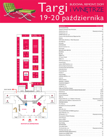 Nazwa firmy AG Grzejniki Design Akademia Wolnego Czasu Horticolor Alutherm Sp. z o.o. Archeton Sp. z o.o. Numer stoiska 5 21 Ekspozycja zewnętrzna 2 CEMEX Polska Sp. z o.o. 67 Centrum Informacji Branżowej Małgorzata Klos 43 Danfoss 70 DDD Dobre Dla Domu - Mińsk Mazowiecki 48 DecoMania.pl E DemoNet C DOMADOOR 69 Domek Invest Sp. z o.o. 32 Domowy.pl A EBS EURO-BUD-SERVICE 60 ECOMAX 65 Eko-Plus 42 FERRO S.A. HT Home Textile IDEAL S.C. IFTM Internorm Sp. z o.o. 9 22 66 44,49 Interpromotor 57 Izodom 2000 Polska Sp. z o.o. 68 Kaminoo Systemy Kominowe 45 Kowalczyk Materiały Budowlane 45 Kozłowski Drzwi 63,64 Krzysztof Jarocki 21 Kwadra-T 17 Kwiek Podłogi LIFEWELLNESS Sp. z o.o. Lupus.eu Media Creations D 16 6 11 MELROSE - SWEDEN 7 MURATOR PROJEKTY 47 MURATOR S.A. 31 nioART Sp. z o.o. Odkurzacz PHU Piotr Kubacki OGÓLNOPOLSKIE STOWARZYSZENIE PARKIECIARZY 3 61 58,59 Parketthome 24,29 Parkiety Jabłoński 23, 30 Parkiety Wiśniewski 63,64 PEBE S.C. Peugeot Polska Sp. z o.o. Oddział w Warszawie Polskie Górnictwo Naftowe i Gazownictwo S.A. PREMIERE DESIGN Pro-Wellness Przedsiębiorstwo Drzewne JAWOR 63,64 Ekspozycja zewnętrzna 25,26,27,28 8 12 23, 30 Rigello 36 Sanito Sp. z o.o. 70 SkutecznaIZOLACJA ICYNENE Icypol Sp. k. 46 Sopro Polska Sp. z o.o. Steinberg Sp. z o.o. Stowarzyszenie Polska Wentylacja C Ekspozycja zewnętrzna 50 Strefa Wnętrza 4 System LOOX 33 ŚWIAT KOMINKÓW Świat Podłóg TECHSOURCE Thermofloc Polska Tim Kominki Sp. z o.o. Villa Glass Studio Sp. z o.o. 10 23, 30 60 62 Ekspozycja zewnętrzna 1 WINDOOR PAWEŁ REDESTOWICZ 51 Wydawnictwo DOBRY DOM 14 Wydawnictwo MaxMedia 13 19 października, sobota SALA „A” 10:45-11:45 „Szkoła przetrwania - dam radę kuchni i łazience” Wykład poprowadzi przedstawiciel firmy Premiere Design 12:00-13:00 „Kolor - jego magia i moc w życiu i projektowaniu wnętrz.” Wykład poprowadzi Agnieszka Kaszyńska – Akademia Wnętrz i Ogrodów 13:15-14:45 „Dostępny dom Pasywny” • CF – technologia budowy domów energooszczędnych i pasywnych. Izodom 2000 Polska • Odpowiedni dobór technologii i systemów w domu pasywnym - Projekt firmy oszczednyDOM.org.pl • Jak uzyskać dopłatę do kredytu na budowę domu pasywnego i energooszczędnego? Kancelaria Niezależnych Doradców Finansowych 15.00-16.00 „Zmysły i piękno w ogrodzie.” Wykład poprowadzi Agnieszka Kaszyńska – Akademia Wnętrz i Ogrodów SALA „B” 11:00-12:00 „Wentylacja mechaniczna z odzyskiem ciepła (rekuperacja) – wytyczne dla instalacji.” Wykład poprowadzi przedstawiciel Stowarzyszenia Polska Wentylacja. 12:15-13:15 „Domy energooszczędne – więcej niż standard” Wykład poprowadzi arch. Elżbieta Rogowska przedstawiciel firmy Archeton 13:30-15:00 „Stan obecny i perspektywy rozwoju rynku okien w Polsce oraz nowe przepisy prawa budowlanego – co się zmieni dla producentów, handlowców, a co dla montażystów?” Wykład poprowadzi Robert Klos. SALA „C” 11:00-11:30 „Nowoczesne projektowanie - wykorzystanie innowacyjnych technologii, nowoczesnych form i materiałów w ujęciu aktualnych trendów (wykład dla architektów i projektantów wnętrz)” Wykład poprowadzi przedstawiciel firmy ArtCada 11:45-13:15 „Jak skutecznie zaprezentować swoją firmę w Internecie i dotrzeć z ofertą do grupy docelowej (architektów wnętrz) Szkolenie poprowadzi przedstawiciel firmy ArtCada 13:30-15:00 „Nowe Prawo budowlane, czy na pewno szybciej i prościej?” Debatę poprowadzi Marek Wielgo, dziennikarz Gazety Wyborczej. Udział wezmą: • Michał Orczyk, naczelnik wydziału procesu inwestycyjnego w departamencie gospodarki przestrzennej i budownictwa Ministerstwa Transportu, Budownictwa i Gospodarki Morskiej; • Michał Leszczyński, główny specjalista w departamencie gospodarki przestrzennej i budownictwa Ministerstwa Transportu, Budownictwa i Gospodarki Morskiej; • Marek Poddany, wiceprezes Polskiego Związku Firm Deweloperskich; • Przemysław Kucharski, starszy prawnik CMS Cameron McKenna 20 października, niedziela SALA „A” 12:00–13:00 „Kolor - jego magia i moc w życiu i projektowaniu wnętrz.” Wykład poprowadzi Agnieszka Kaszyńska – Akademia Wnętrz i Ogrodów 13:15-14:45 „Dostępny dom Pasywny” • ICF – technologia budowy domów energooszczędnych i pasywnych. Izodom 2000 Polska • Odpowiedni dobór technologii i systemów w domu pasywnym - Projekt firmy oszczednyDOM.org.pl • Jak uzyskać dopłatę do kredytu na budowę domu pasywnego i energooszczędnego? Kancelaria Niezależnych Doradców Finansowych SALA „B” 12:00–13:30 „Projekt i co dalej? Jakie dokumenty należy złożyć z wnioskiem o pozwolenie na budowę. Jakie rozwiązania w projekcie są trudne do wykonania, drogie... ładne” Wykład poprowadzi architekt Anna Kukawska. SALA „C” 11:00-12:00 „Zasady funkcjonalnego urządzania wnętrz mieszkalnych.” Wykład poprowadzi przedstawiciel firmy Premiere Design 12:15-13:15 „Zmysły i piękno w ogrodzie.” Wykład poprowadzi Agnieszka Kaszyńska – Akademia Wnętrz i Ogrodów