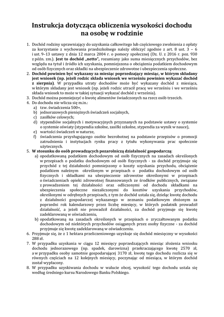 Instrukcja dotycząca obliczenia wysokości dochodu na osobę w rodzinie 1. Dochód rodziny uprawniający do uzyskania całkowitego lub częściowego zwolnienia z opłaty za korzystanie z wychowania przedszkolnego należy obliczyć zgodnie z art. 8 ust. 3 – 6 i ust. 9–13 ustawy z dnia 12 marca 2004 r. o pomocy społecznej (Dz. U. z 2016 r. poz. 930 z późn. zm.). Jest to dochód „netto”, rozumiany jako suma miesięcznych przychodów, bez względu na tytuł i źródło ich uzyskania, pomniejszona o obciążenia podatkiem dochodowym od osób fizycznych oraz składki na ubezpieczenie zdrowotne i ubezpieczenia społeczne. 2. Dochód powinien być wykazany za miesiąc poprzedzający miesiąc, w którym składany jest wniosek (np. jeżeli rodzic składa wniosek we wrześniu powinien wykazać dochód z sierpnia). W przypadku utraty dochodów może być wykazany dochód z miesiąca, w którym składany jest wniosek (np. jeżeli rodzic utracił pracę we wrześniu i we wrześniu składa wniosek to może w takiej sytuacji wykazać dochód z września). 3. Dochód można pomniejszyć o kwotę alimentów świadczonych na rzecz osób trzecich. 4. Do dochodu nie wlicza się m.in.: a) tzw. świadczenia 500+, b) jednorazowych pieniężnych świadczeń socjalnych, c) zasiłków celowych; d) stypendiów socjalnych i motywacyjnych przyznanych na podstawie ustawy o systemie o systemie oświaty (stypendia szkolne, zasiłki szkolne, stypendia za wynik w nauce), e) wartości świadczeń w naturze, f) świadczenia przysługującego osobie bezrobotnej na podstawie przepisów o promocji zatrudnienia i instytucjach rynku pracy z tytułu wykonywania prac społecznie użytecznych. 5. W stosunku do osób prowadzących pozarolniczą działalność gospodarczą: a) opodatkowaną podatkiem dochodowym od osób fizycznych na zasadach określonych w przepisach o podatku dochodowym od osób fizycznych - za dochód przyjmuje się przychód z tej działalności pomniejszony o koszty uzyskania przychodu, obciążenie podatkiem należnym określonym w przepisach o podatku dochodowym od osób fizycznych i składkami na ubezpieczenie zdrowotne określonymi w przepisach o świadczeniach opieki zdrowotnej finansowanych ze środków publicznych, związane z prowadzeniem tej działalności oraz odliczonymi od dochodu składkami na ubezpieczenia społeczne niezaliczonymi do kosztów uzyskania przychodów, określonymi w odrębnych przepisach, z tym że dochód ustala się, dzieląc kwotę dochodu z działalności gospodarczej wykazanego w zeznaniu podatkowym złożonym za poprzedni rok kalendarzowy przez liczbę miesięcy, w których podatnik prowadził działalność, a jeżeli nie prowadził działalności, za dochód przyjmuje się kwotę zadeklarowaną w oświadczeniu, b) opodatkowaną na zasadach określonych w przepisach o zryczałtowanym podatku dochodowym od niektórych przychodów osiąganych przez osoby fizyczne - za dochód przyjmuje się kwotę zadeklarowaną w oświadczeniu. 6. Przyjmuje się, że z 1 hektara przeliczeniowego uzyskuje się dochód miesięczny w wysokości 288 zł. 7. W przypadku uzyskania w ciągu 12 miesięcy poprzedzających miesiąc złożenia wniosku dochodu jednorazowego (np. spadek, darowizna) przekraczającego kwotę 2570 zł, a w przypadku osoby samotnie gospodarującej 3170 zł, kwotę tego dochodu rozlicza się w równych częściach na 12 kolejnych miesięcy, poczynając od miesiąca, w którym dochód został wypłacony. 8. W przypadku uzyskiwania dochodu w walucie obcej, wysokość tego dochodu ustala się według średniego kursu Narodowego Banku Polskiego.