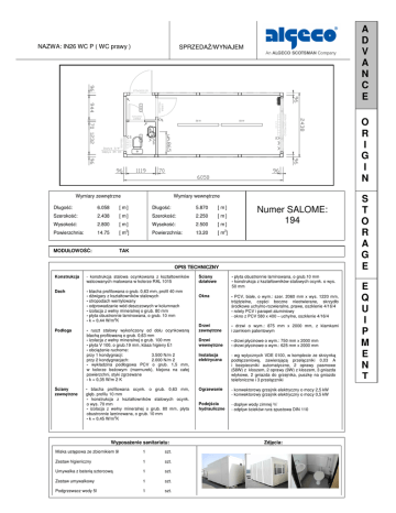 NAZWA: IN26 WC P ( WC prawy ) A D V A N C E SPRZEDAŻ/WYNAJEM O R I G I N Wymiary zewnętrzne Wymiary wewnętrzne Długość: 6.058 [ m] Długość: 5.870 [ m] Szerokość: 2.438 [ m] Szerokość: 2.250 [ m] Wysokość: 2.800 [ m] Wysokość: 2.500 [ m] Powierzchnia: 14.75 [ m2] Powierzchnia: 13.20 [ m2] MODUŁOWOŚĆ: Numer SALOME: 194 TAK OPIS TECHNICZNY Konstrukcja - konstrukcja stalowa ocynkowana z kształtowników walcowanych malowana w kolorze RAL 1015 Dach - blacha profilowana o grub. 0,63 mm, profil 40 mm - dźwigary z kształtowników stalowych - stropodach wentylowany - odprowadzanie wód deszczowych w kolumnach - izolacja z wełny mineralnej o grub. 80 mm - płyta obustronnie laminowana, o grub. 10 mm - k = 0,44 W/m 2K Podłoga Ściany zewnętrzne - ruszt stalowy wykończony od dołu ocynkowaną blachą profilowaną o grub. 0,63 mm - izolacja z wełny mineralnej o grub. 100 mm - płyta V 100, o grub.19 mm, klasa higieny E1 - obciążenie ruchome: przy 1 kondygnacji: 3.500 N/m 2 przy 2 kondygnacjach: 2.000 N/m 2 - wykładzina podłogowa PCV o grub. 1,5 mm, w kolorze beżowym (marmurek), klejona na całej powierzchni, styki zgrzewane - k = 0,35 W/m 2 K - blacha profilowana ocynk. o grub. 0,63 mm, głęb. profilu 10 mm - konstrukcja z kształtowników stalowych ocynk. o wys. 70 mm - izolacja z wełny mineralnej o grub. 80 mm, płyta obustronnie laminowana, o grub. 10 mm - k = 0,45 W/m 2K Wyposażenie sanitariatu: Miska ustępowa ze zbiornikiem 9l 1 szt. Zestaw higieniczny 1 szt. Umywalka z baterią sztorcową 1 szt. Zestaw umywalkowy 1 szt. Podgrzewacz wody 5l 1 szt. Ściany działowe - płyta obustronnie laminowana, o grub.10 mm - konstrukcja z kształtowników stalowych ocynk. o wys. 50 mm Okna - PCV, białe, o wym.: szer. 2060 mm x wys. 1220 mm, trójdzielne, części boczne nieotwierane, skrzydło środkowe uchylno-rozwieralne, prawe, oszklenie 4/16/4 - rolety PCV i parapet aluminiowy - okno z PCV 580 x 400 – uchylne, oszklenie 4/16/4 Drzwi zewnętrzne - drzwi o wym.: 875 mm x 2000 mm, z klamkami i zamkiem patentowym Drzwi wewnętrzne - drzwi płycinowe o wym.: 750 mm x 2000 mm - drzwi płycinowe o wym.: 625 mm x 2000 mm Instalacja elektryczna - wg wytycznych VDE 0100, w komplecie ze skrzynką podłączeniową, zawierającą przełączniki 0,03 A i bezpieczniki automatyczne, 2 oprawy pasmowe (58W) z kloszem, 2 oprawy (9W) z kloszem, 3 gniazda wtykowe, 2 gniazda do grzejnika, puszkę na gniazdo telefoniczne i 3 przełączniki Ogrzewanie - konwektorowy grzejnik elektryczny o mocy 2,5 kW - konwektorowy grzejnik elektryczny o mocy 0,5 kW Podejścia hydrauliczne - dopływ wody zimnej ¾’ - odpływ ścieków rura spustowa DIN 110 Zdjęcia: S T O R A G E E Q U I P M E N T