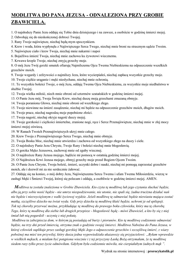 MODLITWA DO PANA JEZUSA - ODNALEZIONA PRZY GROBIE ZBAWICIELA. 1. O najsłodszy Panie Jezu oddaję się Tobie dnia dzisiejszego i na zawsze, a osobiście w godzinę śmierci mojej. 2. Odwołuję się do nieskończonej dobroci Twojej. 3. Rany Twoje najświętsze, niechaj będą mym spoczynkiem. 4. Krew i woda, która wypłynęła z Najświętszego Serca Twego, niechaj mnie broni na strasznym sądzie Twoim. 5. Najświętsze ciało i krew Twoja, niechaj mnie nakarmi i napoi 6. Bojaźliwa śmierć Twoja, niechaj mnie zachowa ku żywotowi wiecznemu. 7. Krwawe krople Twoje, niechaj zmyją grzechy moje. 8. O mój Jezu Twój gorzki smutek ofiaruję Najmilszemu Ojcu Twemu Niebieskiemu na odpuszczenie wszelkich grzechów moich. 9. Twoje wzgardy i zelżywości o najmilszy Jezu, które wycierpiałeś, niechaj zapłacą wszystkie grzechy moje. 10. Twoje ciężkie urąganie i męki niesłychane, niechaj mnie ochronią. 11. Te wszystkie boleści Twoje, o mój Jezu, oddaję Twemu Ojcu Niebieskiemu, za wszystkie moje niedbalstwa w służbie Twojej. 12. Twoja wielka miłość, niech mnie obroni od sztormów szatańskich w godzinę śmierci mojej. 13. O Panie Jezu mój, Twoja Święta Krew, niechaj duszę moją grzechami zmazaną obmyje. 14. Twoja poraniona Głowa, niechaj mnie obroni od wszelkiego złego. 15. Twoje niewinne na śmierć zasądzenie, niechaj mi będzie na odpuszczenie grzechów moich, długów moich. 16. Twoje prace, niechaj nagrodzą moje popełnione złości. 17. Twoja nagość, niechaj okryje nagość duszy mojej. 18. Twoje gorzkości i ciężkości śmiertelne, zranione nogi, ręce i Serce Przenajświętsze, niechaj mnie w złej mocy śmierci mojej oświecą. 19. W Ranach Twoich Przenajświętszych ukryj mnie całego. 20. Krew Twoja z Przenajświętszego Serca Twego, niechaj mnie obmyje. 21. Twoja Boska Moc, niechaj mnie utwierdza i zachowa od wszystkiego złego na duszy i ciele. 22. O najsłodszy Panie Jezu Chryste, Twoje Rany i boleści niechaj mnie błogosławią. 23. O gorzka Męko Jezusowa, zachowaj mnie od zguby wiecznej. 24. O najdroższe Rany Jezusa mojego, bądźcie mi pomocą w ostatnią godzinę śmierci mojej. 25. O Najdroższa Krwi Jezusa mojego, obmyj grzechy moje przed Bogiem Ojcem Twoim. 26. O Panie Jezu Chryste, Twoja boleść, śmierć, uczynki dobre i nauki, niechaj mi pomogą zaprzestać grzechów moich, ale i dozwól mi za nie serdecznie żałować. 27. Oddaję się na koniec, o mój dobry Jezu, Najświętszemu Sercu Twemu i ufam Twemu Miłosierdziu, wierzę w zasługi Męki i Śmierci Twojej, której się polecam i oddaję, a osobliwie w godzinę śmierci mojej. AMEN. Modlitwa ta została znaleziona w Grobie Zbawiciela. Kto czyta tę modlitwę lub jego czytania słuchać będzie, albo ją przy sobie nosić będzie - nie umrze niespodziewanie, nie utonie, nie spali się, żadna trucizna działać nań nie będzie i niezwyciężonym z walki życiowej wyjdzie. Jeżeli modlitwę tę odmawiać będzie niewiasta mająca zostać matką, szczęśliwe dziecko na świat wyda. Gdy przy dziecku tę modlitwę kłaść będzie, uchroni je od epilepsji. Tok tej choroby przerwać można, przykładając tę modlitwę do prawego boku człowieka, który ma tę chorobę. Tego, który tę modlitwę dla siebie lub drugich przepisze - błogosławić będę - mówi Zbawiciel, a kto by się z niej śmiał lub nią pogardził - uczynię z niej pokutę. Modlitwa ta zabezpiecza dom, w którym ją posiadają od burzy i piorunów. Kto tę modlitwę codziennie odmawiać będzie, na trzy dni przed śmiercią, otrzyma znak o godzinie swojej śmierci. Modlitwa Nabożna do Pana Jezusa, w której człowiek suplikuje przez zasługi gorzkiej Męki Jego o odpuszczenie grzechów i szczęśliwą śmierć, z wiary pobożnej ma mieć ten przywilej, który dusza jedna wypowiedziała ukazawszy się przyjacielowi: „Byłam wprawdzie w wielkich mękach, a miałam być potępiona wiecznie i z tej przyczyny Łaskę Bożą otrzymałam, że tę modlitwę siedem razy tylko przez życie odmówiłam. Gdybym była codziennie mówiła, nie cierpiałabym żadnych mąk ”. Wydruk na stronie internetowej : prorocykatolik.pl