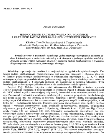PR ZE G . E PID ., 1996, 50, 4 Janusz Furmaniuk JEDNOCZESNE ZACHOROWANIA NA WŁOŚNICĘ I ZATRUCIE JADEM KIEŁBASIANYM CZTERECH CHORYCH Klinika Chorób Pasożytniczych i Tropikalnych Akademii Medycznej im. K. Marcinkowskiego w Poznaniu Kierownik: Prof. dr hab. med. Z.S. Pawłowski Przedstawiono 4 przypadki rzadkiego jednoczesnego wystąpienia zatrucia ja dem kiełbasianym i zakażenia włośnicą u 4 chorych z jednego ogniska włośnicy. Zwraca uwagę różne nasilenie objawów zatrucia jadem kiełbasianym i trudności diagnostyczne zwłaszcza u pierwszego chorego. Włośnicę ropoznaje się rzadko i to najczęściej w ogniskach epidemicznych. Za trucie jadem kiełbasianym rozpoznawane jest również nieczęsto i obecnie głównie w formie pojedynczego zachorowania o różnorakim przebiegu (1, 2, 3, 4). Stąd celowym wydaje się przedstawienie jednoczesnego wystąpienia włośnicy oraz zatrucia jadem kiełbasianym u 4 chorych spośród 25 pacjentów z ogniska włośnicy. Tym bardziej, że w dostępnym piśmiennictwie nie znaleziono takich opisów. Pacjent P.Q. 36-letni inżynier został skierowany do Kliniki w końcu stycznia 1994 r. z innego oddziału z podejrzeniem o włośnicę. Przed 5 dniami zagorączkował do 39°C wśród szybko narastającej adynamii, duszności oraz obrzęku powiek i twa rzy. Zauważył trudności w czytaniu, miał chrypkę i znaczne pragnienie. Ambulatoryj nie przez kilka dni był leczony z powodu biegunki i grypy (dieta, sulfaguanidyna, salicylany). Od kilkunastu lat rozpoznawano u pacjenta zespół drażliwego jelita, a od kilku lat - nadciśnienie tętnicze. Podczas przyjęcia stwierdzono: stan ogólny bardzo ciężki - wstrząs: zamroczony, silna duszność spoczynkowa, znaczna, uogólniona adynamia, gorączka 40,5°C, tętno 116/minutę, ciśnienie krwi 115/80 mm Hg. Chory otyły (waga 130 kg, wzrost 180 cm). Objawów uszkodzenia centralnego ani ob wodowego układu nerwowego nie stwierdzono. Twarz obrzęknięta, obrzęk i opada nie górnych powiek, krwotoki podspojówkowe, źrenice średnio szerokie, reakcja na światło sprawna, czyta z trudem, język podsychający, chrypka. Poza tym stwierdzono tachykardię, niedodmę segmentów przypodstawnych płuc oraz wzdęcie brzucha. W badaniach pracownianych stwierdzono: leukocytozę 11,0 G/l w tym krwinek kwasochłonnych 0,1 G/l oraz wysoką aktywność we krwi: CPK (ponad 4000 U/l), LDH (1060 U/l), HBDH (630 U/l), AspAT (173 U/l). Wdrożono natychmiast postępo wanie przeciwwstrząsowe oraz włączono leczenie przeciwpasożytnicze i objawowe. Po 444 J. Furm aniuk Nr 4 tygodniu chory przestał gorączkować; natomiast adynamia ustępowała stopniowo. Rozpoznano włośnicę na podstawie zespołu klinicznego potwierdzoną również do datnim odczynem serologicznym z antygenem włośnia i zwiększoną ilością IgE (561 U /l). W później wykonanym badaniu bioptycznym mięśnia stwierdzono poje dyncze otarbiające się larwy włośnia i zmiany histopatologiczne odpowiadające włoś nicy. Podejrzewano jednoczesne zatrucie jadem kiełbasianym. Zostało to potwier dzone próbą biologiczną, w której wykazano obecność jadu kiełbasianego - typB. Badanie wykonano w WSSE w Poznaniu. W trakcie obserwacji klinicznej wykluczo no: posocznicę, dur i inne salmonelozy, zapalenie CUN, miastenię, niewydolność nerek, kolagenozy, choroby nowotworowe, zaburzenia hormonalne, wirusowe zapa lenie wątroby i cytomegalię. W międzyczasie udało się ustalić, że 3 tygodnie przed wystąpieniem gorączki chory zjadł około kilograma szynki podwędzanej zakupionej w okolicy, gdzie później stwierdzono większe ognisko włośnicy. Po 4 tygodniach hospitalizacji wypisany ze znaczną poprawą. W kontrolnym badaniu nie stwierdzano jadu kiełbasianego w krwi. Rozpoznanie końcowe - Trichinellosis. Botulismus-typus B. Shock. Hypertonia arterialis IF . Obesitas. W trakcie obserwacji ambulatoryjnej stwierdzano utrzymujące się kilka miesięcy osłabienie siły mięśniowej (przy prawidłowym EMG), eozynofilię i nadal podwyż szoną aktywność enzymów CPK, LDH i AspAT. Pacjentka B.S. 56-letnia rolniczka, skierowana do Kliniki z oddziału wewnętrz nego szpitala rejonowego z powodu ciężkiego przebiegu włośnicy powikłanej zapale niem płuc. Leczyła się również z powodu nadciśnienia tętniczego i otyłości. Podczas przyjęcia stwierdzono obrzęki powiek i twarzy, bóle i bolesność mięśni, zwłaszcza powysiłkowe oraz znaczną adynamię, suchość śluzówek, osłabienie perystaltyki, które sugerowały współistnienie włośnicy i zatrucia jadem kiełbasianym. Rozpoz nanie włośnicy potwierdzono badaniem serologicznym. Wykonano również próbę biologiczną i wykazano obecność jadu kiełbasianego-typ B. Rozpoznano: Trichinellosis. Botulismus-typus B. Bronchopneumonia bilateralis. Hypertonia arterialis 1Г. Obesitas. Wypisana po 5 tygodniach hospitalizacji w stanie dość dobrym. Pacjent S.S. 45-letni rencista, skierowany przez lekarza rejonowego z podejrze niem włośnicy. Miał przez kilka dni obrzęki powiek, stany gorączkowe, bóle mięśni oraz mierną leukocytozę i eozynofilię. Dotąd leczył się systematycznie z powodu nadciśnienia tętniczego, cukrzycy, spastycznego zapalenia oskrzeli, zwyrodnienia krę gosłupa i otyłości. Podczas leczenia w Klinice stwierdzono jedynie niewielkie osłabie nie siły mięśniowej kończyn oraz suchość śluzówek jamy ustnej. Podejrzenie włośnicy potwierdzono badaniem serologicznym. Wykonana, podobnie jak u innych pacjen tów, próba biologiczna wykazała obecność jadu kiełbasianego w surowicy - typ B. Przebieg kliniczny włośnicy i zatrucia jadem kiełbasianym bez powikłań. Pacjentka S.J. Do Kliniki skierowano również żonę pacjenta S.S. 55-letnią rencistkę (zapalenie mózgowia w wywiadzie). Spożywała ona mięso podejrzane o obecność w nim włośni, a poza przelotnymi pobolewaniami mięśni i suchością w jamie ustnej, nie miała innych dolegliwości.