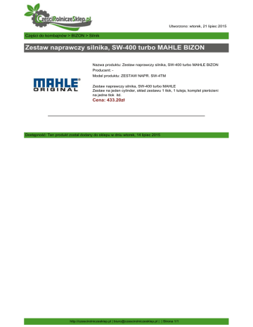 Utworzono: wtorek, 21 lipiec 2015 Części do kombajnów > BIZON > Silnik Zestaw naprawczy silnika, SW-400 turbo MAHLE BIZON Nazwa produktu: Zestaw naprawczy silnika, SW-400 turbo MAHLE BIZON Producent: Model produktu: ZESTAW NAPR. SW-4TM Zestaw naprawczy silnika, SW-400 turbo MAHLE Zestaw na jeden cylinder, skład zestawu 1 tłok, 1 tuleja, komplet pierścieni na jedne tłok itd. Cena: 433.20zł Dostępność: Ten produkt został dodany do sklepu w dniu wtorek, 14 lipiec 2015 http://czescirolniczesklep.pl | [email protected] | | Strona 1/1