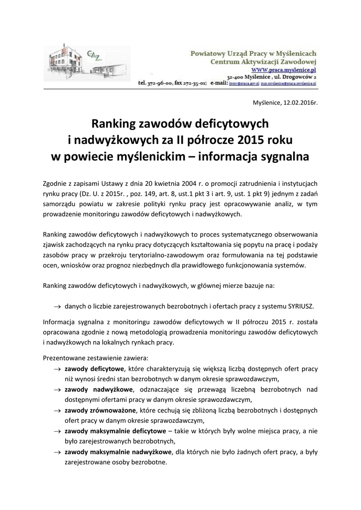 Myślenice, 12.02.2016r. Ranking zawodów deficytowych i nadwyżkowych za II półrocze 2015 roku w powiecie myślenickim – informacja sygnalna Zgodnie z zapisami Ustawy z dnia 20 kwietnia 2004 r. o promocji zatrudnienia i instytucjach rynku pracy (Dz. U. z 2015r. , poz. 149, art. 8, ust.1 pkt 3 i art. 9, ust. 1 pkt 9) jednym z zadao samorządu powiatu w zakresie polityki rynku pracy jest opracowywanie analiz, w tym prowadzenie monitoringu zawodów deficytowych i nadwyżkowych. Ranking zawodów deficytowych i nadwyżkowych to proces systematycznego obserwowania zjawisk zachodzących na rynku pracy dotyczących kształtowania się popytu na pracę i podaży zasobów pracy w przekroju terytorialno-zawodowym oraz formułowania na tej podstawie ocen, wniosków oraz prognoz niezbędnych dla prawidłowego funkcjonowania systemów. Ranking zawodów deficytowych i nadwyżkowych, w głównej mierze bazuje na: danych o liczbie zarejestrowanych bezrobotnych i ofertach pracy z systemu SYRIUSZ. Informacja sygnalna z monitoringu zawodów deficytowych w II półroczu 2015 r. została opracowana zgodnie z nową metodologią prowadzenia monitoringu zawodów deficytowych i nadwyżkowych na lokalnych rynkach pracy. Prezentowane zestawienie zawiera: zawody deficytowe, które charakteryzują się większą liczbą dostępnych ofert pracy niż wynosi średni stan bezrobotnych w danym okresie sprawozdawczym, zawody nadwyżkowe, odznaczające się przewagą liczebną bezrobotnych nad dostępnymi ofertami pracy w danym okresie sprawozdawczym, zawody zrównoważone, które cechują się zbliżoną liczbą bezrobotnych i dostępnych ofert pracy w danym okresie sprawozdawczym, zawody maksymalnie deficytowe – takie w których były wolne miejsca pracy, a nie było zarejestrowanych bezrobotnych, zawody maksymalnie nadwyżkowe, dla których nie było żadnych ofert pracy, a były zarejestrowane osoby bezrobotne. Zawód zgodnie z Klasyfikacją Zawodów i Specjalności (KZiS) definiowany jest jako przynoszący dochód zbiór zadao wyodrębnionych w wyniku społecznego podziału pracy, wykonywanych stale lub z niewielkimi zmianami przez poszczególne osoby i wymagających odpowiednich kwalifikacji (wiedzy i umiejętności), zdobytych w wyniku kształcenia lub praktyki. Zawód może dzielid się na specjalności. Umiejętności określono jako zdolnośd wykonywania odpowiedniej klasy zadao w ramach zawodu np. obsługa komputera i wykorzystanie Internetu. Uprawnienia to dodatkowe kwalifikacje zawodowe zdobywane w drodze procesu certyfikacji, dodatkowych szkoleo, egzaminów lub często także po udowodnieniu przebycia wymaganej praktyki. Kwalifikacje to układ wiedzy, umiejętności i uprawnieo przydatnych do realizacji składowych zadao zawodowych. Oferta pracy to zgłoszenie przez pracodawcę do powiatowego urzędu pracy lub umieszczenie w internetowych serwisach rekrutacyjnych oraz w Biuletynie Informacji Publicznej, co najmniej jednego wolnego miejsca zatrudnienia lub innej pracy zarobkowej w określonym zawodzie lub specjalności w celu znalezienia odpowiedniego pracownika. W niniejszej metodologii przez ofertę pracy rozumie się jedno wolne miejsce pracy lub miejsce aktywizacji zawodowej. Przez długotrwale bezrobotnych należy rozumied pozostających bez pracy powyżej 12-stu miesięcy od dnia zarejestrowania się. Bezrobotny absolwent rozumiany jest jako bezrobotny do upływu 12-stu miesięcy od dnia określonego w dyplomie, świadectwie czy innym dokumencie potwierdzającym ukooczenie szkoły lub zaświadczenie o ukooczeniu kursu. Jako lokalny rynek pracy przyjęto powiatowy rynek pracy. Na podstawie powyższego, zgodnie z nowymi założeniami metodologicznymi, dla powiatu myślenickiego, system wygenerował następującą informację sygnalną za II półrocze 2015 r. ZAWODY DEFICYTOWE I NADWYŻKOWE Powiat myślenicki INFORMACJA SYGNALNA II PÓŁROCZE 2015 R. Sekcja Zaklasyfikowanie Grupa elementarna Robotnicy czyszczący konstrukcje budowlane i pokrewni zawód maksymalnie deficytowy Lektorzy języków obcych Programiści aplikacji DEFICYT Sortowacze odpadów Inżynierowie do spraw przemysłu i produkcji Robotnicy budowy dróg zawód deficytowy Ręczni pakowacze i znakowacze Agenci sprzedaży bezpośredniej RÓWNOWAGA Operatorzy maszyn do produkcji wyrobów z tworzyw sztucznych Robotnicy budowlani robót wykooczeniowych i pokrewni gdzie indziej niesklasyfikowani zawód zrównoważony Średni personel w zakresie działalności artystycznej i kulturalnej gdzie indziej niesklasyfikowany Spawacze i pokrewni Technicy nauk chemicznych, fizycznych i pokrewni Specjaliści do spraw zarządzania zasobami ludzkimi Pomoce domowe i sprzątaczki Dyrektorzy generalni i zarządzający zawód nadwyżkowy Operatorzy maszyn i urządzeo do produkcji wyrobów cementowych, kamiennych i pokrewni Bukmacherzy, krupierzy i pokrewni Tynkarze i pokrewni Sprzedawcy (konsultanci) w centrach sprzedaży telefonicznej / internetowej Asystenci nauczycieli Ustawiacze i operatorzy maszyn do obróbki i produkcji wyrobów z drewna NADWYŻKA Specjaliści do spraw administracji i rozwoju Filozofowie, historycy i politolodzy Biolodzy i pokrewni Specjaliści nauk o Ziemi Pośrednicy usług biznesowych gdzie indziej niesklasyfikowani Specjaliści do spraw społecznych zawód maksymalnie nadwyżkowy Matematycy, aktuariusze i statystycy Monterzy budownictwa wodnego Średni personel ochrony środowiska, medycyny pracy i bhp Kierownicy do spraw finansowych Muzycy i pokrewni Rolnicy upraw polowych Rybacy i zbieracze pracujący na własne potrzeby Aktorzy Opiekunowie zwierząt domowych i pracownicy zajmujący się zwierzętami * Powyższa informacja pochodzi ze strony http://mz.praca.gov.pl, na której ponadto można znaleźd informacje na temat sytuacji zawodów w kraju, poszczególnych województwach i powiatach.