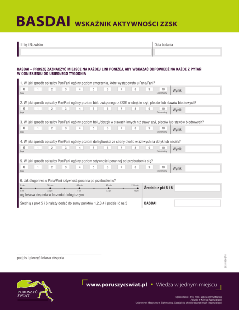 BASDAI Wskaźnik aktywności ZZSK Imię i Nazwisko Data badania BASDAI – PROSZĘ ZAZNACZYĆ MIEJSCE NA KAŻDEJ LINI PONIŻEJ, ABY WSKAZAĆ ODPOWIEDŹ NA KAŻDE Z PYTAŃ W ODNIESIENIU DO UBIEGŁEGO TYGODNIA 1. W jaki sposób opisałby Pan/Pani ogólny poziom zmęczenia, które występowało u Pana/Pani? 0 1 2 3 4 5 6 7 8 9 10 Ekstremalny Brak Wynik 2. W jaki sposób opisałby Pan/Pani ogólny poziom bólu związanego z ZZSK w obrębie szyi, pleców lub stawów biodrowych? 0 1 2 3 4 5 6 7 8 9 10 Ekstremalny Brak Wynik 3. W jaki sposób opisałby Pan/Pani ogólny poziom bólu/obrzęk w stawach innych niż stawy szyi, pleców lub stawów biodrowych? 0 1 2 3 4 5 6 7 8 9 10 Ekstremalny Brak Wynik 4. W jaki sposób opisałby Pan/Pani ogólny poziom dolegliwości ze strony okolic wrażliwych na dotyk lub nacisk? 0 1 2 3 4 5 6 7 8 9 10 Ekstremalny Brak Wynik 5. W jaki sposób opisałby Pan/Pani ogólny poziom sztywności porannej od przebudzenia się? 0 1 2 3 4 5 6 7 8 9 10 Ekstremalny Brak Wynik 6. Jak długo trwa u Pana/Pani sztywność poranna po przebudzeniu? 0 min 30 min 60 min 90 min 120 min 0 pkt 2,5 pkt 5 pkt 7,5 pkt 10 pkt Średnia z pkt 5 i 6 wg lekarza eksperta w leczeniu biologicznym Średnią z pnkt 5 i 6 należy dodać do sumy punktów 1,2,3,4 i podzielić na 5 BASDAI 2012-11-EDU-2714 podpis i pieczęć lekarza eksperta www.poruszycswiat.pl Wiedza w jednym miejscu Opracowanie: dr n. med. Izabela Domysławska Adiunkt w Klinice Reumatologii Uniwersytet Medyczny w Białymstoku, Specjalista chorób wewnętrznych i reumatologii