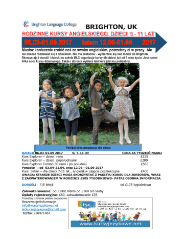 BRIGHTON, UK Musisz koniecznie zrobić coś ze swoim angielskim, potrzebny ci w pracy. Ale nie chcesz rozstawać się z dzieckiem. Nie ma problemu - wybierzcie się nad morze do Brighton. Skorzystają i dorośli i dzieci, bo szkoła BLC organizuje kursy dla dzieci już od 5 roku życia. Jest nawet kilka opcji kursu dziecięcego. Także i dorosły wybiera taki kurs jaki mu potrzebny. Poniżej kilka propozycji dla dzieci DZIECI: 06.03-01.09 2017 4/ 5-11 lat Kurs Explorer – dzieci rano Kurs Explorer – dzieci popołudniami Kurs Explorer Combo 30 rano i po południu Ponadto : od 03.04-21.04. oraz 12.06 - 01.09 2017 Kurs Safari – dla dzieci 7-11 lat , angielski+ zajęcia pozalekcyjne CENA ZA TYDZIEŃ NAUKI £255 £200 £565 £400 UWAGA: STARSZE DZIECI MOGĄ SKORZYSTAĆ Z PAKIETU KURSU DLA JUNIORÓW, WRAZ Z ZAKWATEROWANIEM W RODZINIE £505 TYGODNIOWO- PATRZ OSOBNA INFORMACJA. DOROŚLI: /15 lekcji Zakwaterowanie: od £140/ latem od £160 od osoby Opłaty rejestracyjne: £60, zakwaterowanie £35 Transfery z lotnisk płatne dodatkowo Rezerwacje/informacje [email protected] [email protected] tel/fax 228471487 od £175 tygodniowo