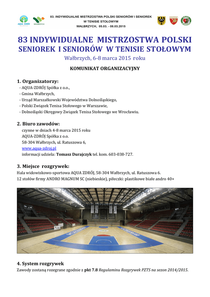 83 INDYWIDUALNE MISTRZOSTWA POLSKI SENIOREK I SENIORÓW W TENISIE STOŁOWYM Wałbrzych, 6-8 marca 2015 roku KOMUNIKAT ORGANIZACYJNY 1. Organizatorzy: - AQUA-ZDRÓJ Spółka z o.o., - Gmina Wałbrzych, - Urząd Marszałkowski Województwa Dolnośląskiego, - Polski Związek Tenisa Stołowego w Warszawie, - Dolnośląski Okręgowy Związek Tenisa Stołowego we Wrocławiu. 2. Biuro zawodów: czynne w dniach 4-8 marca 2015 roku AQUA-ZDRÓJ Spółka z o.o. 58-304 Wałbrzych, ul. Ratuszowa 6, www.aqua-zdroj.pl informacji udziela: Tomasz Durajczyk tel. kom. 603-038-727. 3. Miejsce rozgrywek: Hala widowiskowo-sportowa AQUA ZDRÓJ, 58-304 Wałbrzych, ul. Ratuszowa 6. 12 stołów firmy ANDRO MAGNUM SC (niebieskie), piłeczki: plastikowe białe andro 40+ 4. System rozgrywek Zawody zostaną rozegrane zgodnie z pkt 7.8 Regulaminu Rozgrywek PZTS na sezon 2014/2015. 5. Ramowy program Mistrzostw: - wtorek 3 marca godz. 21:00 - koniec przyjmowania zgłoszeń; - czwartek 5 marca od godz. 18:00 - trening i dobrowolna kontrola rakietek; - piątek 6 marca od godz. 9:00 - gra pojedyncza kobiet i mężczyzn - turnieje główne; - piątek 6 marca godz. 15:00 - ceremonia otwarcia Mistrzostw, - piątek 6 marca godz. 12:00 - zakończenie przyjmowania zgłoszeń do turniejów gier podwójnych i mieszanych; - piątek 6 marca od godz. 15:00 - gra podwójna kobiet i mężczyzn oraz gra mieszana - turnieje główne; - sobota 7 marca od godz. 9:00 - gra pojedyncza kobiet i mężczyzn, gra podwójna kobiet i mężczyzn oraz gra mieszana - dalszy ciąg turniejów głównych; - niedziela 8 marca od godz. 9:00 - gra mieszana, gra podwójna kobiet i mężczyzn oraz gra pojedyncza kobiet i mężczyzn - gry finałowe. 6. Zgłoszenia Zgłoszenia do Mistrzostw należy dokonać wypełniając formularz zgłoszeniowy oraz przesyłając go w nieprzekraczalnym terminie do 3 marca 2015 roku do godz. 21:00 na adresy e-mailowe: [email protected] oraz [email protected] wraz z potwierdzeniem dokonania opłaty wpisowego 120 zł od zawodniczki lub zawodnika na konto: nr konta 96 1020 3668 0000 5402 0382 0719 Spółka Celowa Wałbrzyskie Centrum Sportowo-Rekreacyjne „AQUA-ZDRÓJ” Spółka z o.o. 58-304 Wałbrzych, ul. Ratuszowa 6 7. Zakwaterowanie i wyżywienie Organizator gwarantuje 100 miejsc noclegowych w HOTELU AQUA-ZDRÓJ (miejsce rozgrywania turnieju) ze śniadaniem oraz wyżywieniem dla osób, które jako pierwsze dokonają rezerwacji (ilość miejsc ograniczona). Kolejne ekipy, które będą się zgłaszać po wyczerpaniu miejsc w hotelu AQUA ZDRÓJ, będą kwaterowane w Hotelu QUBUS (400 m od Hali). Rezerwacje noclegów należy przesyłać na wypełnionym formularzu rezerwacyjnym zawierającym nazwiska zawodniczek, zawodników, trenerów oraz osób towarzyszących, którzy będą uczestniczyć w turnieju wraz z zaznaczeniem rezerwacji zakwaterowania i wyżywienia. Rezerwacja noclegów i wyżywienia: e-mail: [email protected] tel. 539-973-875 Hotel AQUA ZDRÓJ, 58-304 Wałbrzych, ul. Ratuszowa 6, Hotel AQUA ZDRÓJ Koszt noclegu i wyżywienia: Pokój 2-osobowy – 160 zł (ze śniadaniem) Pokój dla 1 osoby – 130 zł (ze śniadaniem) Obiad – 30 zł Kolacja – 25 zł Hotel QUBUS Koszt noclegu i wyżywienia: Pokój 2-osobowy – 160 zł (ze śniadaniem) Pokój dla 1 osoby – 130 zł (ze śniadaniem) Opłaty za noclegi oraz wyżywienie będą płatne gotówką lub karta płatniczą w Hotelu – (recepcja) w trakcie przyjmowania ekip (dotyczy rezerwacji w Hotelu AQUA ZDRÓJ i QUBUS). Parking dla Gości hotelowych w Hotelu AQUA ZDRÓJ jest bezpłatny, w Hotelu QUBUS opłata wynosi 10 zł. Rezerwacje można zgłaszać w terminie do 28 lutego 2015 roku. W przypadku otrzymania późniejszych zgłoszeń lub braku rezerwacji organizatorzy nie gwarantują zakwaterowania i wyżywienia. Opłaty za noclegi oraz wyżywienie będą płatne gotówką lub karta płatniczą w Hotelu Aqua Zdrój – (recepcja) w trakcie przyjmowania ekip (dotyczy rezerwacji w Hotelu AQUA ZDRÓJ i QUBUS). Uwaga! Wszyscy goście hotelowi Aqua Zdroju ora Hotelu QUBUS będą mogli nieodpłatnie skorzystać z Parku Wodnego. 8. Zasady finansowania Koszty organizacyjne pokrywają organizatorzy. Koszty uczestnictwa pokrywają uczestnicy. 8. Nagrody Zawodniczki i zawodnicy, którzy zajęli 1, 2 i 3-4 miejsce w turnieju głównym otrzymują medale, puchary, nagrody finansowe o łącznej wartości 30.000 zł oraz dyplomy. Tomasz DURAJCZYK Menadżer Sportu AQUA ZDRÓJ Wałbrzych tel. kom. 603 038 727