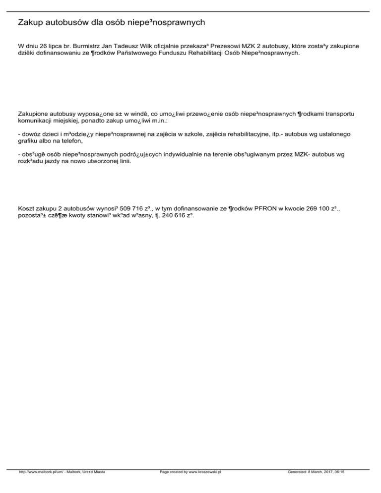 Zakup autobusów dla osób niepe³nosprawnych W dniu 26 lipca br. Burmistrz Jan Tadeusz Wilk oficjalnie przekaza³ Prezesowi MZK 2 autobusy, które zosta³y zakupione dziêki dofinansowaniu ze ¶rodków Pañstwowego Funduszu Rehabilitacji Osób Niepe³nosprawnych. Zakupione autobusy wyposa¿one s± w windê, co umo¿liwi przewo¿enie osób niepe³nosprawnych ¶rodkami transportu komunikacji miejskiej, ponadto zakup umo¿liwi m.in.: - dowóz dzieci i m³odzie¿y niepe³nosprawnej na zajêcia w szkole, zajêcia rehabilitacyjne, itp.- autobus wg ustalonego grafiku albo na telefon, - obs³ugê osób niepe³nosprawnych podró¿uj±cych indywidualnie na terenie obs³ugiwanym przez MZK- autobus wg rozk³adu jazdy na nowo utworzonej linii. Koszt zakupu 2 autobusów wynosi³ 509 716 z³., w tym dofinansowanie ze ¶rodków PFRON w kwocie 269 100 z³., pozosta³± czê¶æ kwoty stanowi³ wk³ad w³asny, tj. 240 616 z³. http://www.malbork.pl/um/ - Malbork, Urz±d Miasta Page created by www.kraszewski.pl Generated: 8 March, 2017, 06:15