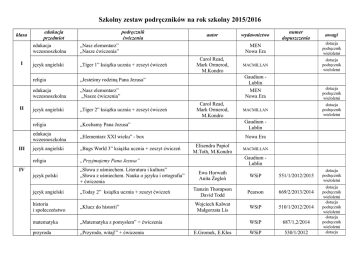 Szkolny zestaw podręczników na rok szkolny 2015/2016 klasa I II III edukacja przedmiot edukacja wczesnoszkolna podręcznik ćwiczenia „Nasz elementarz” „Nasze ćwiczenia” język angielski „Tiger 1” książka ucznia + zeszyt ćwiczeń religia „Jesteśmy rodziną Pana Jezusa” edukacja wczesnoszkolna „Nasz elementarz” „Nasze ćwiczenia” autor Carol Read, Mark Ormerod, M.Kondro wydawnictwo dotacja podręcznik wieloletni MACMILLAN dotacja podręcznik wieloletni Gaudium Lublin MEN Nowa Era Carol Read, Mark Ormerod, M.Kondro „Tiger 2” książka ucznia + zeszyt ćwiczeń religia „Kochamy Pana Jezusa” Gaudium Lublin edukacja wczesnoszkolna „Elementarz XXI wieku” - box Nowa Era język angielski „Bugs World 3” książka ucznia + zeszyt ćwiczeń religia „Przyjmujemy Pana Jezusa” język polski „Słowa z uśmiechem. Literatura i kultura” „Słowa z uśmiechem. Nauka o języku i ortografia” + ćwiczenia język angielski „Today 2” książka ucznia + zeszyt ćwiczeń historia i społeczeństwo „Klucz do historii” matematyka „Matematyka z pomysłem” + ćwiczenia przyroda „Przyrodo, witaj!” + ćwiczenia Elisendra Papiol M.Toth, M.Kondro uwagi MEN Nowa Era język angielski IV numer dopuszczenia dotacja podręcznik wieloletni dotacja podręcznik wieloletni MACMILLAN MACMILLAN Gaudium Lublin Ewa Horwath Anita Żegleń WSiP 551/1/2012/2015 Tamzin Thompson David Todd Pearson 669/2/2013/2014 Wojciech Kalwat Małgorzata Lis WSiP 510/1/2012/2014 WSiP 687/1,2/2014 WSiP 530/1/2012 E.Gromek, E.Kłos dotacja podręcznik wieloletni dotacja podręcznik wieloletni dotacja podręcznik wieloletni dotacja podręcznik wieloletni dotacja W.Kofta, A.Melson E.Laskowska zajęcia komputerowe „Z nowym bitem” zajęcia techniczne „Technika na co dzień” plastyka „Plastyka” muzyka „Lekcja muzyki” religia „Jestem chrześcijaninem” język polski „Między nami” podręcznik + zeszyt ćwiczeń język angielski „Today 3” książka ucznia + zeszyt ćwiczeń historia i społeczeństwo „Wczoraj i dziś” matematyka „Łatwa matematyka” podręcznik + zeszyt ćwiczeń przyroda „Przyrodo, witaj!” + zeszyt ćwiczeń zajęcia komputerowe „Zajęcia komputerowe dla szkoły podstawowej” klasy IV-VI „Karta rowerowa – zajęcia techniczne w klasach IV-VI szkoły podstawowej” V zajęcia techniczne VI plastyka „Plastyka” muzyka „Lekcja muzyki” religia „Wierzę w Boga” język polski „Między nami” podręcznik + zeszyt ćwiczeń Grażyna Koba Ewa Bubak, Ewa Królicka, Marcin Duda Stanisław Stopczyk Barbara Neubart Monika Gromek Grażyna Kilbach Migra 740/1/2015 WSiP 496/2,3/2012/201 5 WSiP 440/1/2012 Nowa Era podręcznik wieloletni dotacja podręcznik wieloletni dotacja podręcznik wieloletni dotacja podręcznik wieloletni dotacja podręcznik wieloletni Gaudium Lublin A.Łuczak, A.Murdzek Erika Stiles Sandy Zervas G.Wojciechowski Katarzyna Makowska E.Gromek, E.Kłos W.Kofta, A.Melson E.Laskowska G.Koba B.Stanecka, Cz.Stanecki Stanisław Stopczyk Barbara Neubart Monika Gromek Grażyna Kilbach A.Łuczak, GWO Pearson 669/3/2015 Nowa Era Wiking WSiP 530/1/2012 MiGra STANPOL 321/1/2011/z1 WSiP 440/1/2012 Nowa Era Gaudium Lublin GWO kupują rodzice kupują rodzice kupują rodzice kupują rodzice kupują rodzice kupują rodzice kupują rodzice kupują rodzice kupują rodzice kupują rodzice język angielski „New English Zone 3” książka ucznia + zeszyt ćwiczeń „ LONGMAN Repetytorium szóstoklasisty” historia i społeczeństwo „Wczoraj i dziś” matematyka „Łatwa matematyka” podręcznik + zeszyt ćwiczeń przyroda „Przyrodo, witaj!” + zeszyt ćwiczeń zajęcia komputerowe „Zajęcia komputerowe dla szkoły podstawowej” klasy IV-VI Zajęcia techniczne cz.2 – podręcznik z ćwiczeniami zajęcia techniczne plastyka „Plastyka” muzyka „Lekcja muzyki” religia „Wierzę w Kościół” A.Murdzek R. Nolasco, A.Lois D.Newbold, J.Penn C.Bright , L.Kilbey Pearson G.Wojciechowski Nowa Era Katarzyna Makowska E.Gromek, E.Kłos W.Kofta, A.Melson E.Laskowska G.Koba B.Stanecka, Cz.Stanecki Stanisław Stopczyk Barbara Neubart Monika Gromek Grażyna Kilbach Oxford 13/07 Wiking WSiP 530/1/2012 MiGra STANPOL WSiP Nowa Era Gaudium Lublin 440/1/2012