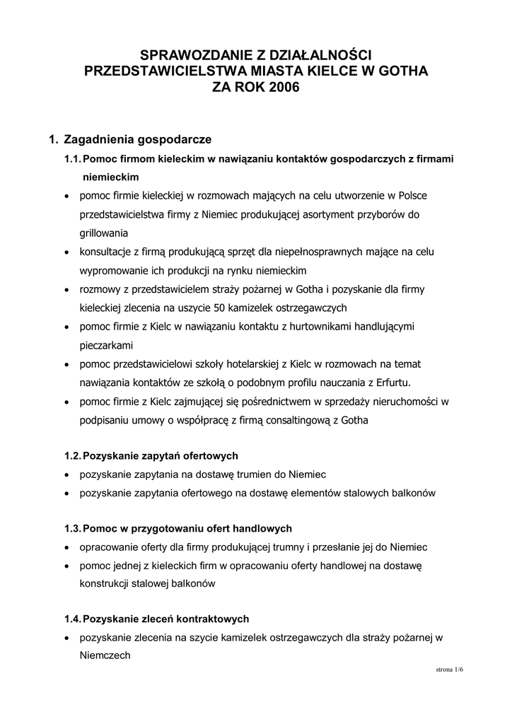 SPRAWOZDANIE Z DZIAŁALNOŚCI PRZEDSTAWICIELSTWA MIASTA KIELCE W GOTHA ZA ROK 2006 1. Zagadnienia gospodarcze 1.1. Pomoc firmom kieleckim w nawiązaniu kontaktów gospodarczych z firmami niemieckim • pomoc firmie kieleckiej w rozmowach mających na celu utworzenie w Polsce przedstawicielstwa firmy z Niemiec produkującej asortyment przyborów do grillowania • konsultacje z firmą produkującą sprzęt dla niepełnosprawnych mające na celu wypromowanie ich produkcji na rynku niemieckim • rozmowy z przedstawicielem straży pożarnej w Gotha i pozyskanie dla firmy kieleckiej zlecenia na uszycie 50 kamizelek ostrzegawczych • pomoc firmie z Kielc w nawiązaniu kontaktu z hurtownikami handlującymi pieczarkami • pomoc przedstawicielowi szkoły hotelarskiej z Kielc w rozmowach na temat nawiązania kontaktów ze szkołą o podobnym profilu nauczania z Erfurtu. • pomoc firmie z Kielc zajmującej się pośrednictwem w sprzedaży nieruchomości w podpisaniu umowy o współpracę z firmą consaltingową z Gotha 1.2. Pozyskanie zapytań ofertowych • pozyskanie zapytania na dostawę trumien do Niemiec • pozyskanie zapytania ofertowego na dostawę elementów stalowych balkonów 1.3. Pomoc w przygotowaniu ofert handlowych • opracowanie oferty dla firmy produkującej trumny i przesłanie jej do Niemiec • pomoc jednej z kieleckich firm w opracowaniu oferty handlowej na dostawę konstrukcji stalowej balkonów 1.4. Pozyskanie zleceń kontraktowych • pozyskanie zlecenia na szycie kamizelek ostrzegawczych dla straży pożarnej w Niemczech strona 1/6 • pozyskanie zlecenia na dostawę elementów stalowych do kostrukcji schodow stalowych 1.5. Pomoc w negocjacjach kontraktowych • pomoc firmie kieleckiej w wynegocjowaniu i zredagowaniu kontraktu na przedstawicielstwo firmy Thüros w Polsce • pomoc firmie produkującej sprzęt do wyposażenia studiów fotograficznych w negocjacjach kontraktowych dotyczących utworzenia przedstawicielstwa w Gotha 1.6. Pomoc w trakcie realizacji kontraktu • pomoc firmie z Kielc w zrealizowaniu kontraktu na dostawę elementów do konstrukcji schodów stalowych dla firmy HEPA • pomoc firmie z Kielc w uzyskaniu zaświadczenia niezbędnego do otrzymania wsparcia z funduszy unijnych – wymiana korespondencji z firmą niemiecką 1.7. Obsługa merytoryczna inwestorów • rozeznanie możliwości pozyskania w Kielcach działki pod budowę sklepu dla jednej z sieci handlowych • zorganizowanie pobytu w Kielcach przedstawiciela firmy consaltingowej pragnącego zapoznać się z możliwością pozyskania terenów inwestycyjnych dla sieci handlowych • zorganizowanie pobytu w Kielcach przedstawiciela firmy consaltingowej prowadzącego na zlecenie dużego koncernu metalowego rozeznanie możliwości przeniesienia produkcji do Kielc 1.8. Rozmowy, korespondencja i spotkania gospodarcze • prowadzenie rozmów na temat handlu gazem skroplonym, grot solnych, produktów firmy Thüros, • rozmowy z przedstawicielem firmy produkującej elektryczne podgrzewacze wody na temat jej promocji na rynku niemieckim - przekazanie adresów firm, do których przedstawicielstwo wysłało pisma akwizycyjne • przygotowanie pisma akwizycyjnego dla firmy kieleckiej produkującej sprzęt rehabilitacyjny i przekazanie jej adresów firm niemieckich celem nawiązania współpracy strona 2/6 • spotkanie w firmie AnchorLamina celem omówienia zasad współpracy z firmami z Kielc zajmującymi się obróbką metali na tokarkach sterowanych numerycznie • rozmowy w szkole Staatliche Fachschule für Bau, Wirtschaft und Verkehr Gotha.na temat nawiązania współpracy z Wyższą Szkołą Zarządzania Gospodarką Regionalną i Turystyką w Kielcach 2. Imprezy i spotkania kulturalne, sportowe i edukacyjne 2.1. Uczestniczenie w imprezach i spotkaniach kulturalnych • uczestniczenie w spotkaniu pożegnalnych nadburmistrza Volkera Doenitz w Gotha • uczestniczenie w spotkaniu powitalnym nowo obranego nadburmistrza w Gotha 2.2. Współorganizowanie imprez kulturalnych i sportowych • Pomoc jednemu z producentów skrzypiec w zorganizowaniu i sfinansowaniu wystawy w Paryżu w dniach 17-19.03.2006 w czasie Targów Musicora.przygotowanie umowy na promocję miasta • rozmowy na temat zorganizowania wystawy obrazów jednego z malarzy kieleckich w galerii niemieckiej • zorganizowanie pobytu drużyny bokserskiej z Gotha w czasie turnieju bokserskiego im Zygmunta Sikory • współpraca z Konsulatem Generalnym RFN w Krakowie przy organizowaniu bankietu z okazji święta narodowego Niemiec • współpraca przy organizowaniu Dni Miast Partnerskich w Gotha 2.3. Uczestniczenie w konferencjach i szkoleniach • uczestnictwo w sympozjum w Lipsku na temat wzajemnych stosunków handlowych polsko-niemieckich w branży budowlanej • uczestnictwo w konferencji Samorządów Miast Partnerskich Trójkąta Weimarskiego w Krakowie • uczestniczenie w konferencji w Dreźnie dotyczącej omówienia stosunków polskoniemieckich w dwa lata po przystąpieniu Polski do Unii – rozmowy z przedstawicielami samorządów miast polskich i niemieckich strona 3/6 3. Współpraca szkół, organizacji młodzieżowych i innych jednostek organizacyjnych • zorganizowanie wyjazdu młodzieży z VI LO im J.Słowackiego na międzynarodowy obóz młodzieży w Salzgitter • rozmowy z klubami w Niemczech i Gotha na temat zorganizowani turnieju piłkarskiego dziewcząt w Kielcach • zorganizowanie imprezy w Kielcach o nazwie "Kucharz w podróży” z udziałem młodzieży na leżącej do francuskiego stowarzyszenia gastronomicznego oraz jednej ze szkół kieleckich • pomoc w nawiązaniu kontaktu pomiędzy Targami Kielce a Oddziałem Targów Lipskich w Warszawie • zorganizowanie wyjazdu do Salzgitter uczniów z VI LO. im. J.Słowackiego na międzynarodowy obóz młodzieży • pomoc w zorganizowaniu wyjazdu na obóz do Hümpreshausen młodzieży z Ochotniczych Straży Pożarnych • zorganizowanie pobytu w Kielcach redaktora Rundfun