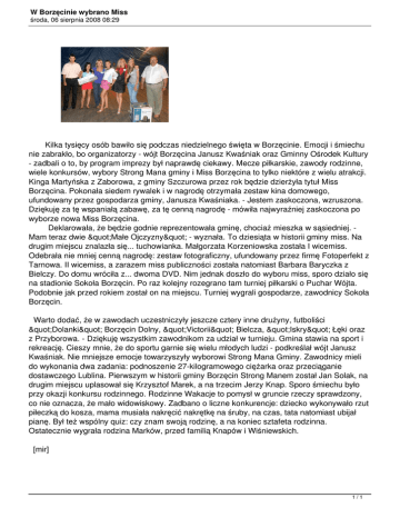 W Borzęcinie wybrano Miss środa, 06 sierpnia 2008 08:29 Kilka tysięcy osób bawiło się podczas niedzielnego święta w Borzęcinie. Emocji i śmiechu nie zabrakło, bo organizatorzy - wójt Borzęcina Janusz Kwaśniak oraz Gminny Ośrodek Kultury - zadbali o to, by program imprezy był naprawdę ciekawy. Mecze piłkarskie, zawody rodzinne, wiele konkursów, wybory Strong Mana gminy i Miss Borzęcina to tylko niektóre z wielu atrakcji. Kinga Martyńska z Zaborowa, z gminy Szczurowa przez rok będzie dzierżyła tytuł Miss Borzęcina. Pokonała siedem rywalek i w nagrodę otrzymała zestaw kina domowego, ufundowany przez gospodarza gminy, Janusza Kwaśniaka. - Jestem zaskoczona, wzruszona. Dziękuję za tę wspaniałą zabawę, za tę cenną nagrodę - mówiła najwyraźniej zaskoczona po wyborze nowa Miss Borzęcina. Deklarowała, że będzie godnie reprezentowała gminę, chociaż mieszka w sąsiedniej. Mam teraz dwie "Małe Ojczyzny" - wyznała. To dziesiąta w historii gminy miss. Na drugim miejscu znalazła się... tuchowianka. Małgorzata Korzeniowska została I wicemiss. Odebrała nie mniej cenną nagrodę: zestaw fotograficzny, ufundowany przez firmę Fotoperfekt z Tarnowa. II wicemiss, a zarazem miss publiczności została natomiast Barbara Baryczka z Bielczy. Do domu wróciła z... dwoma DVD. Nim jednak doszło do wyboru miss, sporo działo się na stadionie Sokoła Borzęcin. Po raz kolejny rozegrano tam turniej piłkarski o Puchar Wójta. Podobnie jak przed rokiem został on na miejscu. Turniej wygrali gospodarze, zawodnicy Sokoła Borzęcin. Warto dodać, że w zawodach uczestniczyły jeszcze cztery inne drużyny, futboliści "Dolanki" Borzęcin Dolny, "Victorii" Bielcza, "Iskry" Łęki oraz z Przyborowa. - Dziękuję wszystkim zawodnikom za udział w turnieju. Gmina stawia na sport i rekreację. Cieszy mnie, że do sportu garnie się wielu młodych ludzi - podkreślał wójt Janusz Kwaśniak. Nie mniejsze emocje towarzyszyły wyborowi Strong Mana Gminy. Zawodnicy mieli do wykonania dwa zadania: podnoszenie 27-kilogramowego ciężarka oraz przeciąganie dostawczego Lublina. Pierwszym w historii gminy Borzęcin Strong Manem został Jan Solak, na drugim miejscu uplasował się Krzysztof Marek, a na trzecim Jerzy Knap. Sporo śmiechu było przy okazji konkursu rodzinnego. Rodzinne Wakacje to pomysł w gruncie rzeczy sprawdzony, co nie oznacza, że mało widowiskowy. Zadbano o liczne konkurencje: dziecko wykonywało rzut piłeczką do kosza, mama musiała nakręcić nakrętkę na śruby, na czas, tata natomiast ubijał pianę. Był też wspólny quiz: czy znam swoją rodzinę, a na koniec sztafeta rodzinna. Ostatecznie wygrała rodzina Marków, przed familią Knapów i Wiśniewskich. [mir] 1/1