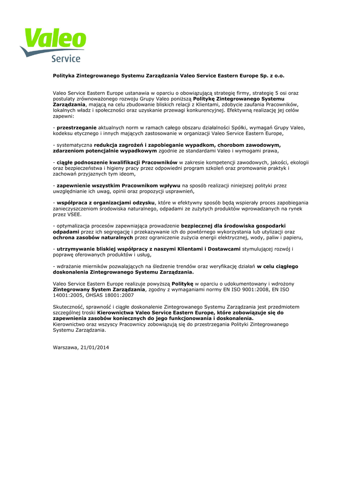 Polityka Zintegrowanego Systemu Zarządzania Valeo Service Eastern Europe Sp. z o.o. Valeo Service Eastern Europe ustanawia w oparciu o obowiązującą strategię firmy, strategię 5 osi oraz postulaty zrównoważonego rozwoju Grupy Valeo poniższą Politykę Zintegrowanego Systemu Zarządzania, mającą na celu zbudowanie bliskich relacji z Klientami, zdobycie zaufania Pracowników, lokalnych władz i społeczności oraz uzyskanie przewagi konkurencyjnej. Efektywną realizację jej celów zapewni: - przestrzeganie aktualnych norm w ramach całego obszaru działalności Spółki, wymagań Grupy Valeo, kodeksu etycznego i innych mających zastosowanie w organizacji Valeo Service Eastern Europe, - systematyczna redukcja zagrożeń i zapobieganie wypadkom, chorobom zawodowym, zdarzeniom potencjalnie wypadkowym zgodnie ze standardami Valeo i wymogami prawa, - ciągłe podnoszenie kwalifikacji Pracowników w zakresie kompetencji zawodowych, jakości, ekologii oraz bezpieczeństwa i higieny pracy przez odpowiedni program szkoleń oraz promowanie praktyk i zachowań przyjaznych tym ideom, - zapewnienie wszystkim Pracownikom wpływu na sposób realizacji niniejszej polityki przez uwzględnianie ich uwag, opinii oraz propozycji usprawnień, - współpraca z organizacjami odzysku, które w efektywny sposób będą wspierały proces zapobiegania zanieczyszczeniom środowiska naturalnego, odpadami ze zużytych produktów wprowadzanych na rynek przez VSEE. - optymalizacja procesów zapewniająca prowadzenie bezpiecznej dla środowiska gospodarki odpadami przez ich segregację i przekazywanie ich do powtórnego wykorzystania lub utylizacji oraz ochrona zasobów naturalnych przez ograniczenie zużycia energii elektrycznej, wody, paliw i papieru, - utrzymywanie bliskiej współpracy z naszymi Klientami i Dostawcami stymulującej rozwój i poprawę oferowanych produktów i usług, - wdrażanie mierników pozwalających na śledzenie trendów oraz weryfikację działań w celu ciągłego doskonalenia Zintegrowanego Systemu Zarządzania. Valeo Service Eastern Europe realizuje powyższą Politykę w oparciu o udokumentowany i wdrożony Zintegrowany System Zarządzania, zgodny z wymaganiami normy EN ISO 9001:2008, EN ISO 14001:2005, OHSAS 18001:2007 Skuteczność, sprawność i ciągłe doskonalenie Zintegrowanego Systemu Zarządzania jest przedmiotem szczególnej troski Kierownictwa Valeo Service Eastern Europe, które zobowiązuje się do zapewnienia zasobów koniecznych do jego funkcjonowania i doskonalenia. Kierownictwo oraz wszyscy Pracownicy zobowiązują się do przestrzegania Polityki Zintegrowanego Systemu Zarządzania. Warszawa, 21/01/2014