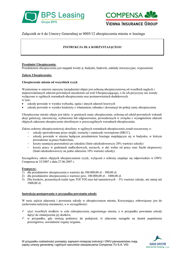 Załącznik nr 6 do Umowy Generalnej nr 0005/12 ubezpieczenia mienia w leasingu INSTRUKCJA DLA KORZYSTAJĄCEGO Przedmiot Ubezpieczenia: Przedmiotem ubezpieczenia jest majątek trwały tj. budynki, budowle, nakłady inwestycyjne, wyposażenie Zakres Ubezpieczenia: Ubezpieczenie mienia od wszystkich ryzyk Wymienione w umowie maszyny (urządzenia) objęte jest ochroną ubezpieczeniową od wszelkich nagłych i nieprzewidzianych zdarzeń powstałych niezależnie od woli Ubezpieczającego, o ile ich przyczyny nie zostały wyłączone w ogólnych warunkach ubezpieczenia oraz postanowieniach dodatkowych. w tym: szkody powstałe w wyniku wybuchu, ognia i innych zdarzeń losowych szkody powstałe w wyniku kradzieży z włamaniem, rabunku i dewastacji do pełnej sumy ubezpieczenia. Ubezpieczone mienie objęte jest także, w granicach sumy ubezpieczenia, ochroną od szkód powstałych wskutek akcji gaśniczej, ratowniczej, wyburzenia lub odgruzowania, prowadzonych w związku z wystąpieniem zdarzeń objętych zakresem ubezpieczenia określonym w poszczególnych warunkach ubezpieczenia. Zakres ochrony ubezpieczeniowej określony w ogólnych warunkach ubezpieczenia został rozszerzony o: szkody spowodowane przez strajki, rozruchy i zamieszki wewnętrzne (SRCC), szkody powstałe w mieniu będącym przedmiotem leasingu znajdującym się w budynku, w którym prowadzone są prace budowlane, koszty usunięcia pozostałości po szkodzie (limit odszkodowawczy 20% wartości szkody) koszty pracy w godzinach nadliczbowych, nocnych, w dni wolne od pracy oraz fracht ekspresowy (limit odszkodowawczy na jedno zdarzenie 10% wartości szkody). Szczegółowy zakres objętych ubezpieczeniem ryzyk, wyłączeń z ochrony znajduje się odpowiednio w OWU Compensa nr 33/2007 z dnia 27.06.2007 r. Franszyzy: 1) dla przedmiotów ubezpieczenia o wartości do 100.000,00 zł – 500,00 zł. 2) dla przedmiotów ubezpieczenia o wartości pow. 100.000,00 zł – 1000,00 zł. 3) Dla kiosków, przenośnych toalet typu TOI TOI oraz hal namiotowych – 5% wartości szkody, nie mniej niż 1000,00 zł. Instrukcja postępowania w przypadku powstania szkody W razie zajścia zdarzenia i powstania szkody w ubezpieczonym mieniu, Korzystający zobowiązany jest do zachowania należytej staranności, a w szczególności: użyć wszelkich środków w celu zabezpieczenia zagrożonego mienia, a w przypadku powstania szkody dążyć do zmniejszenia jej skutków, w przypadku, gdy istnieją podstawy do podejrzeń, iż zdarzenie nastąpiło na skutek popełnienia przestępstwa, zawiadomić organy ścigania, W przypadku rozbieżności pomiędzy zapisami niniejszej instrukcji i OWU pierwszeństwo mają zapisy umowy generalnej i ogólnych warunków ubezpieczenia Compensa TU S.A. VIG nie później niż w ciągu 3 dni roboczych od dnia uzyskania informacji o powstaniu szkody zgłosić powstanie szkody do: - Monika Szyszka (0-22) 318 81 16, Fax. 0-22 318 81 01 e-mail: [email protected] - Compensa TU S.A. Vienna Insurance Group Z ramienia Compensa TU S.A. Vienna Insurance Group, szkody będą likwidowane przez Departament Likwidacji Szkód w Warszawie. Osoby odpowiedzialne za likwidacje szkód: Danuta Skarżyńska, (0-22) 501-64-74 e-mail: [email protected] oraz przesłać wypełniony KWESTIONARIUSZ ZGŁOSZENIA SZKODY udzielać Compensa TU S.A. Vienna Insurance Group wyjaśnień i wszelkiej pomocy potrzebnej dla ustalenia okoliczności zdarzenia i rozmiarów szkody, a w szczególności umożliwić oględziny miejsca zdarzenia i przekazywać wszelkie dowody w sprawie, a w szczególności: a) opis szkody, uwzględniający istotne sprawy okoliczności i dowody, b) informacje policji o zaistniałym zdarzeniu kradzieży lub rabunku oraz postanowienia o wszczęciu postępowania lub umorzeniu dochodzenia, o ile mają zastosowanie, c) potwierdzenie zawiadomienia straży pożarnej w przypadku pożaru, d) wyliczenie poniesionych strat, zgodnie z ustaleniami protokołu szkodowego, e) cesję praw o ile ma zastosowanie, f) inne dokumenty potwierdzające rozpatrzenie roszczenia: fakturę zakupu sprzętu i dokument potwierdzający wniesienie opłat celnych, ofertę zakładu naprawczego z określeniem przewidywanego kosztu naprawy. pozostawić bez zmian miejsce szkody do czasu przybycia przedstawiciela Compensy w okresie 3 dni, chyba, że zmiana jest niezbędna w celu zabezpieczenia mienia pozostałego po szkodzie lub zmniejszenia szkody; niezwłocznie po otrzymaniu odpisów wszelkich pism, orzeczeń i aktów związanych z faktem zajścia zdarzenia i powstania szkody przesłać je do Compensa TU S.A. Vienna Insurance Group. Wypłata Odszkodowania: 1. 2. 3. 4. W przypadku szkody całkowitej, podstawą do kalkulacji będzie wartość odtworzeniowa przedmiotu ubezpieczenia Wysokość odszkodowania określa się w granicach sum ubezpieczenia określonych w umowie ubezpieczenia dla każdego przedmiotu ubezpieczenia oddzielnie według kosztów odbudowy w tym samym miejscu lub remontu z uwzględnieniem dotychczasowych wymiarów, materiałów, technologii i konstrukcji. Odszkodowanie zmniejsza się o wysokość franszyzy redukcyjnej. Suma ubezpieczenia przedmiotu ubezpieczenia nie ulega zmniejszeniu o wypłacone odszkodowania. W przypadku rozbieżności pomiędzy zapisami niniejszej instrukcji i OWU pierwszeństwo mają zapisy umowy generalnej i ogólnych warunków ubezpieczenia Compensa TU S.A. VIG