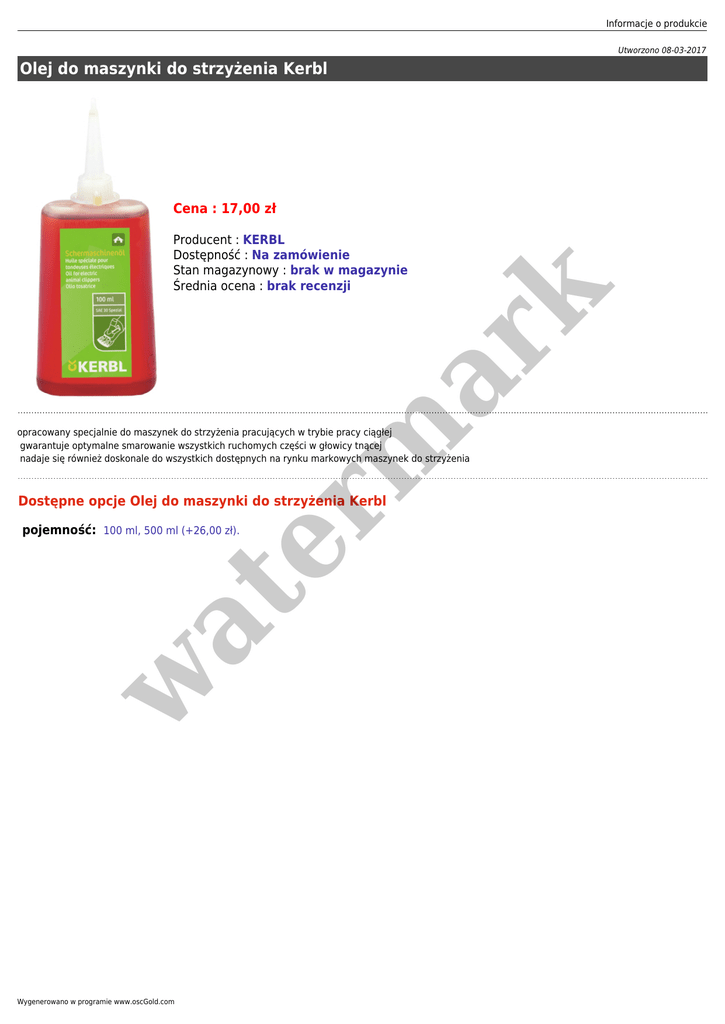 Informacje o produkcie Utworzono 08-03-2017 Olej do maszynki do strzyżenia Kerbl Cena : 17,00 zł er m ar k Producent : KERBL Dostępność : Na zamówienie Stan magazynowy : brak w magazynie Średnia ocena : brak recenzji opracowany specjalnie do maszynek do strzyżenia pracujących w trybie pracy ciągłej gwarantuje optymalne smarowanie wszystkich ruchomych części w głowicy tnącej nadaje się również doskonale do wszystkich dostępnych na rynku markowych maszynek do strzyżenia Dostępne opcje Olej do maszynki do strzyżenia Kerbl w at pojemność: 100 ml, 500 ml (+26,00 zł). Wygenerowano w programie www.oscGold.com