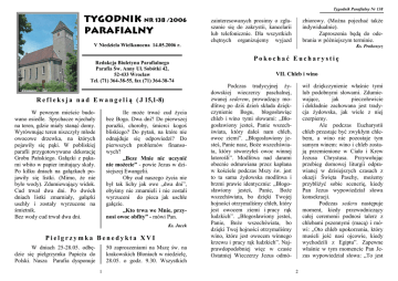 Tygodnik Parafialny Nr 138 TYGODNIK Nr 138 /2006 PARAFIALNY V Niedziela Wielkanocna 14.05.2006 r. Redakcja Biuletynu Parafialnego Parafia Św. Anny Ul. Sobótki 42, 52-433 Wrocław Tel. (71) 364-38-55, fax (71) 364-38-74 R e f l e k s j a n a d E w a n g e l i ą ( J 15,1-8) W pewnym mieście budowano osiedle. Spychacze wjechały na teren, gdzie miały stanąć domy. Wyrównując teren niszczyły młode owocowe drzewka, na których pojawiły się pąki. W pobliskiej parafii przygotowywano dekorację Grobu Pańskiego. Gałązki z pąkami wbito w papier imitujący skały. Po kilku dniach na gałązkach pojawiły się listki. (Mimo, Ŝe nie było wody). Zdumiewający widok. Cud trwał dwa dni. Po dwóch dniach listki zmarniały, gałązki uschły i zostały wyrzucone na śmietnik. Bez wody cud trwał dwa dni. Ile moŜe trwać cud Ŝycia bez Boga. Dwa dni? Do pierwszej poraŜki, choroby, śmierci kogoś bliskiego? Do pytań, na które nie odnajduje się odpowiedzi? Do pierwszych problemów finansowych? „Beze Mnie nic uczynić nie moŜecie” - powie Jezus w dzisiejszej Ewangelii. Oby cud naszego Ŝycia nie był tak lichy jak owe „dwa dni”, obyśmy nie zmarnieli i nie zostali wyrzuceni do pieca jak uschłe gałęzie. „Kto trwa we Mnie, przynosi owoc obfity” - mówi Pan. Ks. Jacek Pielgrzymka Benedykta XVI W dniach 25-28.05. odbędzie się pielgrzymka PapieŜa do Polski. Nasza Parafia dysponuje 50 zaproszeniami na Mszę św. na krakowskich Błoniach w niedzielę, 28.05. o godz. 9.30. Wszystkich 1 zainteresowanych prosimy o zgłaszanie się do zakrystii, kancelarii lub telefonicznie. Dla wszystkich chętnych organizujemy wyjazd zbiorowy. (MoŜna pojechać takŜe indywidualnie). Zaproszenia będą do odebrania w późniejszym terminie. Ks. Proboszcz Pokochać Eucharystię VII. Chleb i wino Podczas tradycyjnej Ŝydowskiej wieczerzy paschalnej, zwanej sederem, prowadzący modlitwę po dziś dzień składa dziękczynienie Bogu, błogosławiąc chleb i wino tymi słowami: „Błogosławiony jesteś, Panie wszechświata, który dałeś nam chleb, owoc ziemi”. „Błogosławiony jesteś, Panie nasz, BoŜe wszechświata, który stworzyłeś owoc winnej latorośli”. Modlitwa nad darami obecnie odmawiana przez kapłana w kościele podczas Mszy św. jest to ta sama Ŝydowska modlitwa i brzmi prawie identycznie: „Błogosławiony jesteś, Panie, BoŜe wszechświata, bo dzięki Twojej hojności otrzymaliśmy chleb, który jest owocem ziemi i pracy rąk ludzkich”. „Błogosławiony jesteś, Panie, BoŜe wszechświata, bo dzięki Twej hojności otrzymaliśmy wino, które jest owocem winnego krzewu i pracy rąk ludzkich”. Najprawdopodobniej więc w czasie Ostatniej Wieczerzy Jezus odmó- wił dziękczynienie właśnie tymi lub podobnymi słowami. Zdumiewające, jak pieczołowicie i dokładnie zachowana jest tradycja Ŝydowska, jak wiele z niej czerpiemy. Ale podczas Eucharystii chleb przestaje być zwykłym chlebem, a wino nie pozostaje tym samym winem: wino i chleb zostają przemienione w Ciało i Krew Jezusa Chrystusa. Przywołując przebieg domowej liturgii odprawianej w dzisiejszych czasach z okazji Święta Paschy, moŜemy przybliŜyć sobie scenerię, kiedy Pan Jezus wypowiedział słowa konsekracji. Podczas sederu następuje moment, kiedy przewodniczący całej ceremonii podnosi talerz z chlebami pszennymi (macą) i mówi: „Oto chleb upokorzenia, który musieli jeść nasi ojcowie, kiedy wychodzili z Egiptu”. Zapewne właśnie w tym momencie Pan Jezus wypowiedział słowa: „To jest 2 Tygodnik Parafialny Nr 138 Ciało moje”, napełniając nową treścią znak chleba. W ten sposób wypełnił obietnicę, Ŝe da swym uczniom chleb Ŝycia: „Chlebem, który Ja dam, jest moje ciało za Ŝycie świata” (J 6,51). W czasie tradycyjnej uczty paschalnej kaŜdy uczestnik wypija cztery kieliszki wina: trzeci po zakończeniu posiłku, kiedy otwiera się drzwi, aby zademonstrować, Ŝe jest to lejl szimurim, noc BoŜej łaski i opieki, i wypowiada się słowa Baruch ha-ba („Błogosławiony, który przybywa”). Czwarty kielich wypija się po odśpiewaniu Wielkiego Hallelu, czyli Psalmów 115-118 i 136. Tę tradycję wspomina zapewne Ewangelia w słowach: „Po odśpiewaniu hymnu wyszli w stronę Góry Oliwnej” (Mk 14,24). Zapewne nad trzecim lub czwartym obrzędowym kielichu wina, wypijanym po wieczerzy (Łk 22,20) Jezus wypowiedział słowa: „Ten kielich to Nowe Przymierze we Krwi mojej” (Łk 22,20). Jezus odwołuje się tu do ustanowienia przymierza na Synaju: „MojŜesz wziął krew i pokropił nią lud, mówiąc: «Oto krew przymierza, które Pan zawarł z wami […]»” (Wj 24,8). A moŜe był to kielich przeznaczony dla Eliasza, z którego nikt nie pił, a który stał na stole, obrazując nadzieje mesjańskie? Ustanawiając Eucharystię, Jezus nadał nowy i ostateczny sens starotestamentowemu znakowi chleba i wina. Aleksandra Kowal UWAGA! W tym tygodniu składamy dokumenty związane z rozbudową naszego kościoła. Proszę o szczególne wparcie i modlitwę. W związku ze zbliŜającą się rozbudową pragniemy ogłosić konkurs fotograficzny na najlepsze zdjęcie naszego kościoła. Zdjęcie (lub zdjęcia) prosimy składać do 10 czerwca. Najlepsze zdjęcia zostaną nagrodzone. Przy okazji dziękuję sponsorowi za ufundowanie nagród. Ks. Proboszcz Podajemy numer konta parafialnego, na które moŜna wpłacać na rozbudowę naszego kościoła 98 1020 5242 0000 2202 0029 1930 z dopiskiem „rozbudowa” Serdecznie dziękujemy za wszystkie wpłaty! 3 Z OGŁOSZEŃ PARAFIALNYCH Na naboŜeństwo majowe zapraszamy na godz. 18.15 oraz na godz. 20.30. przypominamy, Ŝe w dni powszednie naboŜeństwa majowe odbywają się bezpośrednio po Mszy św. wieczornej ok. godz. 18.30. oraz o godz. 20.30. Zachęcamy do licznego udziału i modlitwy. Przypominamy, Ŝe w piątki o godz. 19.15 odbywają się w domu parafialnym spotkania modlitewne wspólnoty oazowej Agalliasis. Na spotkania za