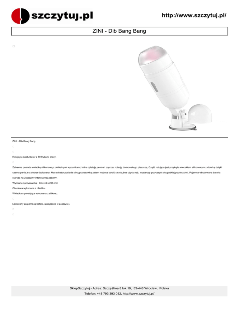 http://www.szczytuj.pl/ ZINI - Dib Bang Bang ZINI - Dib Bang Bang Rotujący masturbator z 50 trybami pracy. Zabawka posiada wkładkę silikonową z delikatnymi wypustkami, które oplatają penisa i poprzez rotację doskonale go pieszczą. Część rotująca jest przykryta wieczkiem silikonowym z dziurką dzięki czemu penis jest dobrze izolowany. Masturbator posiada silną przyssawkę zatem możesz bawić się nią bez użycia rąk, wystarczy przyczepić do gładkiej powierzchni. Pojemna wbudowana bateria starcza na 2 godziny intensywnej zabawy. Wymiary z przyssawką : 43 x 43 x 265 mm Obudowa wykonana z plastiku. Wkładka stymulująca wykonana z silikonu. Ładowany za pomocą baterii. (załączone w zestawie). SklepSzczytuj - Adres: Szczęśliwa 8 lok.19, 53-446 Wrocław, Polska Telefon: +48 793 393 082, http://www.szczytuj.pl/ http://www.szczytuj.pl/ SklepSzczytuj - Adres: Szczęśliwa 8 lok.19, 53-446 Wrocław, Polska Telefon: +48 793 393 082, http://www.szczytuj.pl/