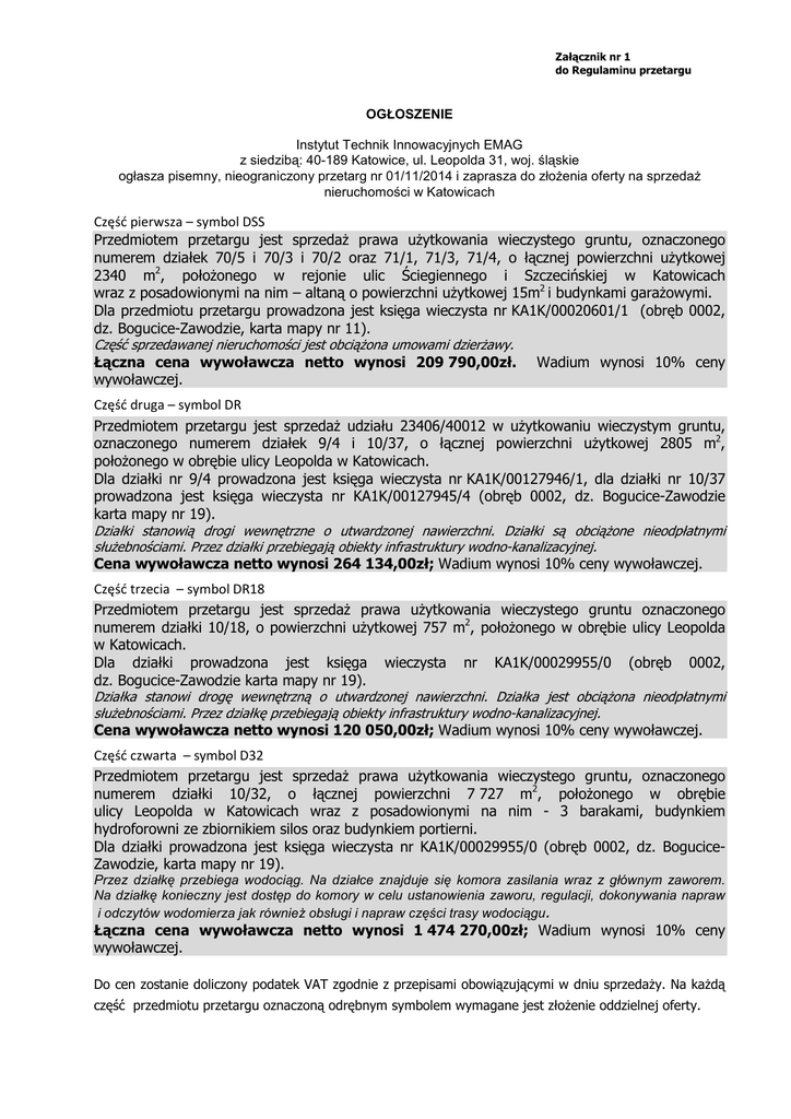 Załącznik nr 1 do Regulaminu przetargu OGŁOSZENIE Instytut Technik Innowacyjnych EMAG z siedzibą: 40-189 Katowice, ul. Leopolda 31, woj. śląskie ogłasza pisemny, nieograniczony przetarg nr 01/11/2014 i zaprasza do złoŜenia oferty na sprzedaŜ nieruchomości w Katowicach Część pierwsza – symbol DSS Przedmiotem przetargu jest sprzedaŜ prawa uŜytkowania wieczystego gruntu, oznaczonego numerem działek 70/5 i 70/3 i 70/2 oraz 71/1, 71/3, 71/4, o łącznej powierzchni uŜytkowej 2340 m2, połoŜonego w rejonie ulic Ściegiennego i Szczecińskiej w Katowicach wraz z posadowionymi na nim – altaną o powierzchni uŜytkowej 15m2 i budynkami garaŜowymi. Dla przedmiotu przetargu prowadzona jest księga wieczysta nr KA1K/00020601/1 (obręb 0002, dz. Bogucice-Zawodzie, karta mapy nr 11). Część sprzedawanej nieruchomości jest obciąŜona umowami dzierŜawy. Łączna cena wywoławcza netto wynosi 209 790,00zł. Wadium wynosi 10% ceny wywoławczej. Część druga – symbol DR Przedmiotem przetargu jest sprzedaŜ udziału 23406/40012 w uŜytkowaniu wieczystym gruntu, oznaczonego numerem działek 9/4 i 10/37, o łącznej powierzchni uŜytkowej 2805 m2, połoŜonego w obrębie ulicy Leopolda w Katowicach. Dla działki nr 9/4 prowadzona jest księga wieczysta nr KA1K/00127946/1, dla działki nr 10/37 prowadzona jest księga wieczysta nr KA1K/00127945/4 (obręb 0002, dz. Bogucice-Zawodzie karta mapy nr 19). Działki stanowią drogi wewnętrzne o utwardzonej nawierzchni. Działki są obciąŜone nieodpłatnymi słuŜebnościami. Przez działki przebiegają obiekty infrastruktury wodno-kanalizacyjnej. Cena wywoławcza netto wynosi 264 134,00zł; Wadium wynosi 10% ceny wywoławczej. Część trzecia – symbol DR18 Przedmiotem przetargu jest sprzedaŜ prawa uŜytkowania wieczystego gruntu oznaczonego numerem działki 10/18, o powierzchni uŜytkowej 757 m2, połoŜonego w obrębie ulicy Leopolda w Katowicach. Dla działki prowadzona jest księga wieczysta nr KA1K/00029955/0 (obręb 0002, dz. Bogucice-Zawodzie karta mapy nr 19). Działka stanowi drogę wewnętrzną o utwardzonej nawierzchni. Działka jest obciąŜona nieodpłatnymi słuŜebnościami. Przez działkę przebiegają obiekty infrastruktury wodno-kanalizacyjnej. Cena wywoławcza netto wynosi 120 050,00zł; Wadium wynosi 10% ceny wywoławczej. Część czwarta – symbol D32 Przedmiotem przetargu jest sprzedaŜ prawa uŜytkowania wieczystego gruntu, oznaczonego numerem działki 10/32, o łącznej powierzchni 7 727 m2, połoŜonego w obrębie ulicy Leopolda w Katowicach wraz z posadowionymi na nim - 3 barakami, budynkiem hydroforowni ze zbiornikiem silos oraz budynkiem portierni. Dla działki prowadzona jest księga wieczysta nr KA1K/00029955/0 (obręb 0002, dz. BoguciceZawodzie, karta mapy nr 19). Przez działkę przebiega wodociąg. Na działce znajduje się komora zasilania wraz z głównym zaworem. Na działkę konieczny jest dostęp do komory w celu ustanowienia zaworu, regulacji, dokonywania napraw i odczytów wodomierza jak równieŜ obsługi i napraw części trasy wodociągu. Łączna cena wywoławcza netto wynosi 1 474 270,00zł; Wadium wynosi 10% ceny wywoławczej. Do cen zostanie doliczony podatek VAT zgodnie z przepisami obowiązującymi w dniu sprzedaŜy. Na kaŜdą część przedmiotu przetargu oznaczoną odrębnym symbolem wymagane jest złoŜenie oddzielnej oferty. 1. Dodatkowe informacje dotyczące przetargu zawiera Regulamin, który jest dostępny w siedzibie sprzedającego oraz na stronie www.emag.pl zakładka Przetargi, nr postępowania 01/11/2014. 2. Przedmiot sprzedaŜy moŜna obejrzeć w dniach roboczych do dnia 20.11.2014 r. po uzgodnieniu dokładnej godziny – tel. 32 2007 611. 3. Warunkiem uczestniczenia w przetargu jest wpłata wadium (z opisem: wadium – sprzedaŜ nieruchomości – post. nr 01/11/2014 cz. ….) na konto bankowe sprzedającego - ING Bank Śląski O/Katowice nr 68 1050 1214 1000 0007 0000 5010 w terminie do dnia 20.11.2014 r. gdzie termin wpłaty oznacza termin uznania na rachunku sprzedającego, (dla cz. D32 dopuszcza się wniesienie wadium równieŜ w innej formie, na warunkach określonych w regulaminie) oraz dostarczenie oferty pod adres: Instytut Technik Innowacyjnych EMAG 40-189 Katowice, ul. Leopolda 31, woj. śląskie, w terminie do dnia 21.11.2014 r. do godz. 11:00, w zamkniętej kopercie z opisem OFERTA SPRZEDAś NIERUCHOMOŚCI W KATOWICACH – post. nr 01/11/2014 – SYMBOL… 4. Otwarcie ofert odbędzie się w siedzibie sprzedającego w dniu 21.11.2014 r. - dla cz. DSS o godz. 11:30 - dla cz. DR o godz. 12:00 - dla cz. DR18 o godz. 12:30 - dla cz. D32 o godz. 13:00. 5. W przypadku braku rozstrzygnięcia przetargu w cz. D32, spowodowanego zaoferowaniem przez kilku oferentów tej samej ceny, prowadzący przetarg kontynuuje przetarg w formie publicznej licytacji między tymi oferentami. Licytacja odbędzie się w dniu 21.11.2014 r. o godz. 13:30 6. Wadium przepada na rzecz sprzedającego, jeŜeli Ŝaden z uczestników przetargu nie zaoferuje ceny nabycia równej, co najmniej cenie wywoławczej lub jeŜeli oferent, którego oferta wygra, uchyli się od zawarcia umowy. 7. W razie kontynuacji przetargu z cz. D32 w formie licytacji wadium przepada na rzecz sprzedawcy, jeŜeli Ŝaden z uczestników licytacji nie zaoferuje ceny nabycia równej co najmniej cenie wywoławczej. 8. Wadium złoŜone przez oferentów, których oferty nie zostaną przyjęte, zostanie zwrócone bezpośrednio po dokonaniu wyboru oferty, a oferentowi, którego oferta została przyjęta, zostanie zarachowane na poczet ceny nabycia; jeŜeli wadium złoŜone przez nabywcę było w innej formie niŜ w gotówce, ulega zwrotowi po zapłaceniu ceny nabycia. 9. Warunkiem skutecznego nabycia nieruchomości, jeŜeli wartość rynkowa przedmiotu rozporządzenia przekracza równowartość w złotych kwoty 50 000 euro, obliczonej na podstawie średniego kursu ogłoszonego przez NBP według stanu z dnia wystąpienia o zgo