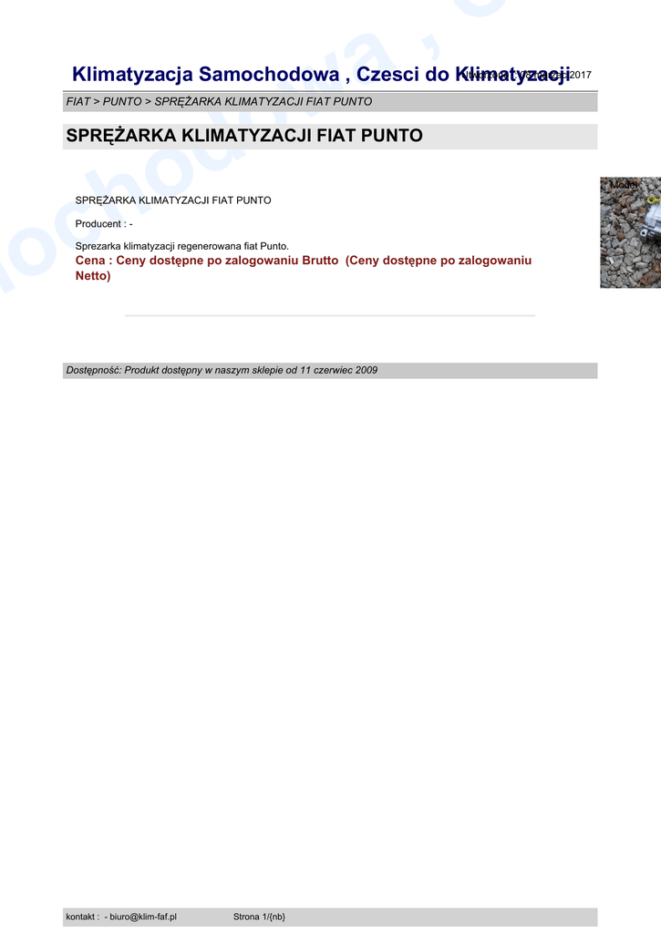 w o d o h , a Utworzono : 08 marzec 2017 Klimatyzacja Samochodowa , Czesci do Klimatyzacji FIAT > PUNTO > SPRĘŻARKA KLIMATYZACJI FIAT PUNTO SPRĘŻARKA KLIMATYZACJI FIAT PUNTO c o m SPRĘŻARKA KLIMATYZACJI FIAT PUNTO Producent : - Sprezarka klimatyzacji regenerowana fiat Punto. Cena : Ceny dostępne po zalogowaniu Brutto (Ceny dostępne po zalogowaniu Netto) Dostępność: Produkt dostępny w naszym sklepie od 11 czerwiec 2009 kontakt : - [email protected] Strona 1/{nb} Model : -