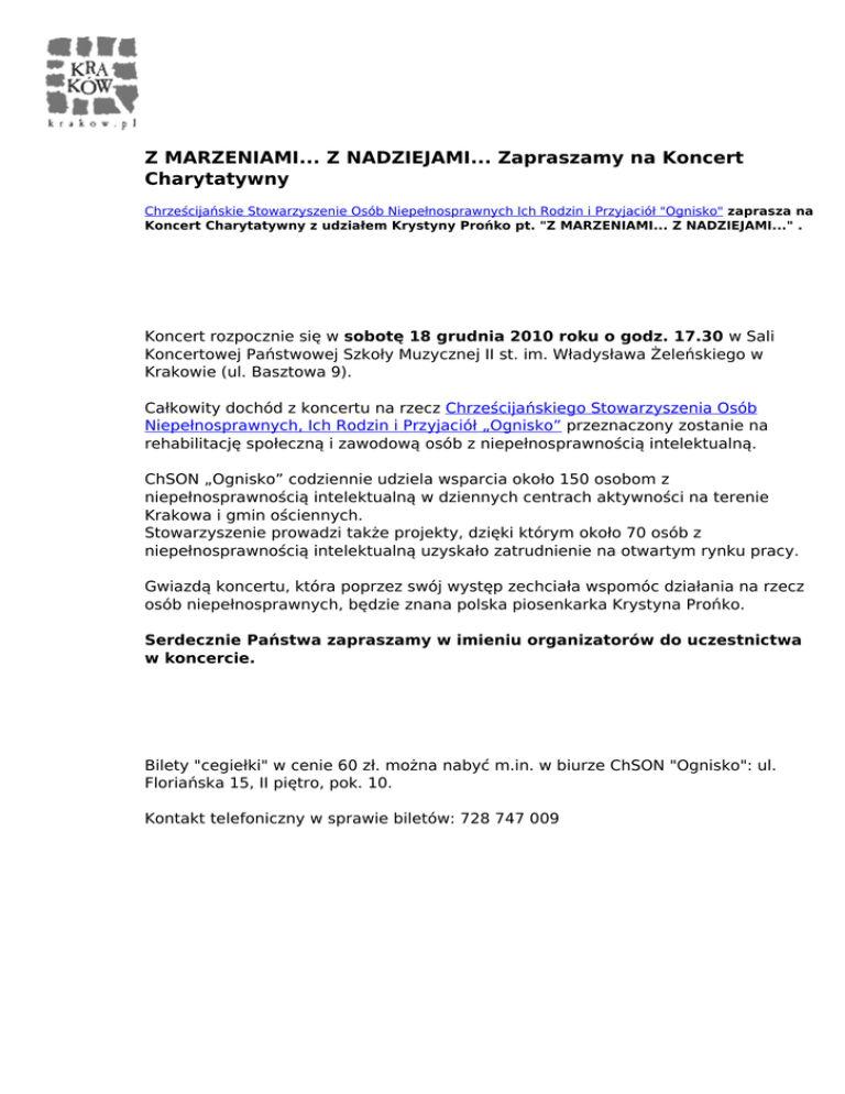 Z MARZENIAMI... Z NADZIEJAMI... Zapraszamy na Koncert Charytatywny Chrześcijańskie Stowarzyszenie Osób Niepełnosprawnych Ich Rodzin i Przyjaciół "Ognisko" zaprasza na Koncert Charytatywny z udziałem Krystyny Prońko pt. "Z MARZENIAMI... Z NADZIEJAMI..." . Koncert rozpocznie się w sobotę 18 grudnia 2010 roku o godz. 17.30 w Sali Koncertowej Państwowej Szkoły Muzycznej II st. im. Władysława Żeleńskiego w Krakowie (ul. Basztowa 9). Całkowity dochód z koncertu na rzecz Chrześcijańskiego Stowarzyszenia Osób Niepełnosprawnych, Ich Rodzin i Przyjaciół „Ognisko” przeznaczony zostanie na rehabilitację społeczną i zawodową osób z niepełnosprawnością intelektualną. ChSON „Ognisko” codziennie udziela wsparcia około 150 osobom z niepełnosprawnością intelektualną w dziennych centrach aktywności na terenie Krakowa i gmin ościennych. Stowarzyszenie prowadzi także projekty, dzięki którym około 70 osób z niepełnosprawnością intelektualną uzyskało zatrudnienie na otwartym rynku pracy. Gwiazdą koncertu, która poprzez swój występ zechciała wspomóc działania na rzecz osób niepełnosprawnych, będzie znana polska piosenkarka Krystyna Prońko. Serdecznie Państwa zapraszamy w imieniu organizatorów do uczestnictwa w koncercie. Bilety "cegiełki" w cenie 60 zł. można nabyć m.in. w biurze ChSON "Ognisko": ul. Floriańska 15, II piętro, pok. 10. Kontakt telefoniczny w sprawie biletów: 728 747 009 Powered by TCPDF (www.tcpdf.org)