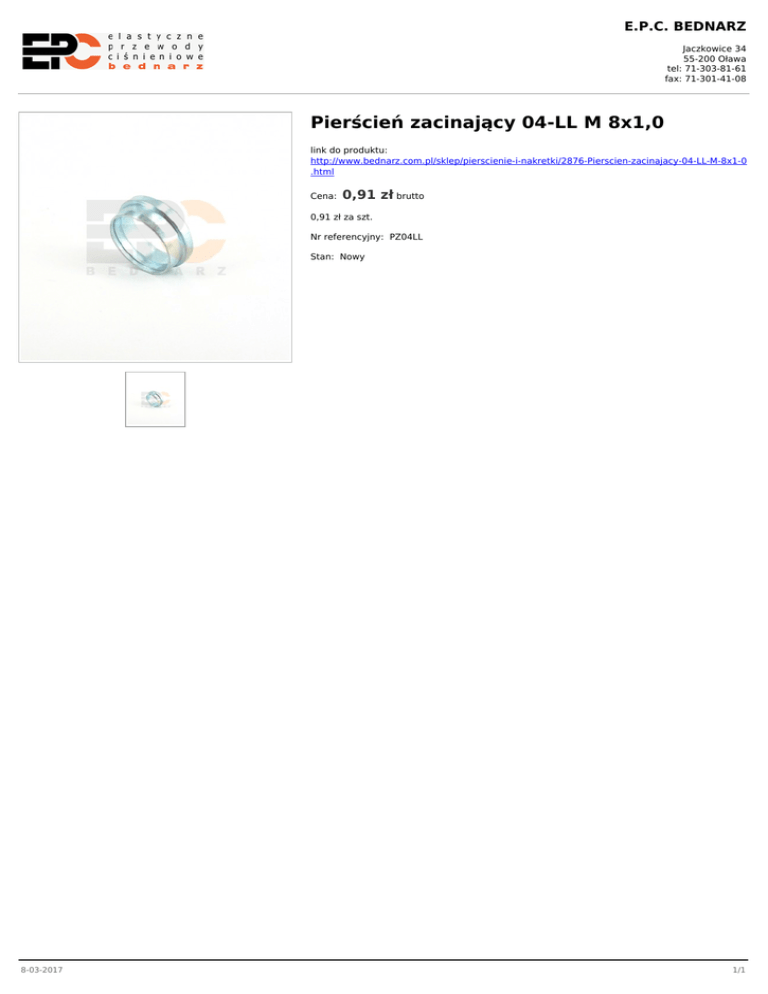E.P.C. BEDNARZ Jaczkowice 34 55-200 Oława tel: 71-303-81-61 fax: 71-301-41-08 Pierścień zacinający 04-LL M 8x1,0 link do produktu: http://www.bednarz.com.pl/sklep/pierscienie-i-nakretki/2876-Pierscien-zacinajacy-04-LL-M-8x1-0 .html Cena: 0,91 zł brutto 0,91 zł za szt. Nr referencyjny: PZ04LL Stan: Nowy 8-03-2017 1/1