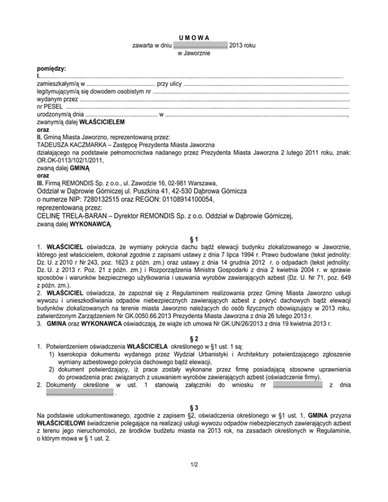 UMOWA zawarta w dniu ................................. 2013 roku w Jaworznie pomiędzy: I.......................................................................................................................................................................................... zamieszkałym/ą w .......................................... przy ulicy ..................................................................................................... legitymującym/ą się dowodem osobistym nr ........................................................................................................................ wydanym przez ..................................................................................................................................................................... nr PESEL ............................................................................................................................................................................. urodzonym/ą dnia ............................................ w ..............................................................................................................., zwanym/ą dalej WŁAŚCICIELEM oraz II. Gminą Miasta Jaworzno, reprezentowaną przez: TADEUSZA KACZMARKA – Zastępcę Prezydenta Miasta Jaworzna działającego na podstawie pełnomocnictwa nadanego przez Prezydenta Miasta Jaworzna 2 lutego 2011 roku, znak: OR.OK-0113/102/1/2011, zwaną dalej GMINĄ oraz III. Firmą REMONDIS Sp. z o.o., ul. Zawodzie 16, 02-981 Warszawa, Oddział w Dąbrowie Górniczej ul. Puszkina 41, 42-530 Dąbrowa Górnicza o numerze NIP: 7280132515 oraz REGON: 01108914100054, reprezentowaną przez: CELINĘ TRELA-BARAN – Dyrektor REMONDIS Sp. z o.o. Oddział w Dąbrowie Górniczej, zwaną dalej WYKONAWCĄ. §1 1. WŁAŚCICIEL oświadcza, że wymiany pokrycia dachu bądź elewacji budynku zlokalizowanego w Jaworznie, którego jest właścicielem, dokonał zgodnie z zapisami ustawy z dnia 7 lipca 1994 r. Prawo budowlane (tekst jednolity: Dz. U. z 2010 r Nr 243, poz. 1623 z późn. zm.) oraz ustawy z dnia 14 grudnia 2012 r. o odpadach (tekst jednolity: Dz. U. z 2013 r. Poz. 21 z późn. zm.) i Rozporządzenia Ministra Gospodarki z dnia 2 kwietnia 2004 r. w sprawie sposobów i warunków bezpiecznego użytkowania i usuwania wyrobów zawierających azbest (Dz. U. Nr 71, poz. 649 z późn. zm.). 2. WŁAŚCICIEL oświadcza, że zapoznał się z Regulaminem realizowania przez Gminę Miasta Jaworzno usługi wywozu i unieszkodliwiania odpadów niebezpiecznych zawierających azbest z pokryć dachowych bądź elewacji budynków zlokalizowanych na terenie miasta Jaworzno należących do osób fizycznych obowiązujący w 2013 roku, zatwierdzonym Zarządzeniem Nr GK.0050.66.2013 Prezydenta Miasta Jaworzna z dnia 26 lutego 2013 r. 3. GMINA oraz WYKONAWCA oświadczają, że wiąże ich umowa Nr GK.UN/26/2013 z dnia 19 kwietnia 2013 r. §2 1. Potwierdzeniem oświadczenia WŁAŚCICIELA określonego w §1 ust. 1 są: 1) kserokopia dokumentu wydanego przez Wydział Urbanistyki i Architektury potwierdzającego zgłoszenie wymiany azbestowego pokrycia dachowego bądź elewacji, 2) dokument potwierdzający, iż prace zostały wykonane przez firmę posiadającą stosowne uprawnienia do prowadzenia prac związanych z usuwaniem wyrobów zawierających azbest (oświadczenie firmy). 2. Dokumenty określone w ust. 1 stanowią załączniki do wniosku nr .............................. z dnia ......................................... . §3 Na podstawie udokumentowanego, zgodnie z zapisem §2, oświadczenia określonego w §1 ust. 1, GMINA przyzna WŁAŚCICIELOWI świadczenie polegające na realizacji usługi wywozu odpadów niebezpiecznych zawierających azbest z terenu jego nieruchomości, ze środków budżetu miasta na 2013 rok, na zasadach określonych w Regulaminie, o którym mowa w § 1 ust. 2. 1/2 §4 Niniejsza umowa jest podstawą finansowania przez GMINĘ kosztów wywozu i unieszkodliwienia odpadów niebezpiecznych zawierających azbest z terenu nieruchomości WŁAŚCICIELA w wysokości 80%, zgodnie ze złożonym wnioskiem oraz podstawą do obciążenia WŁAŚCICIELA 20% wartości usługi. §5 1. Faktura na 20% kosztów usługi określonej w §3 zostanie wystawiona przez WYKONAWCĘ po jej zrealizowaniu. Kwotę wynikającą z faktury WŁAŚCICIEL przeleje na wskazany na niej rachunek WYKONAWCY w terminie 14 dni od daty jej otrzymania. 2. Pozostałe 80% kosztów świadczonej usługi wywozu odpadów niebezpiecznych zawierających azbest z terenu nieruchomości WŁAŚCICIELA ponosi GMINA. §6 Za świadczoną usługę WŁAŚCICIEL zostaje obciążony kwotą, obliczoną w sposób określony szczegółowo w pkt 14 Regulaminu wskazanego w § 1 ust. 2 niniejszej umowy. §7 Dniem zapłaty faktury, o której mowa w §5 ust. 1 jest dzień wpływu środków pieniężnych na rachunek WYKONAWCY. §8 Niezapłacenie faktury, o której mowa w §5 ust. 1 w terminie spowoduje naliczenie odsetek ustawowych za każdy dzień zwłoki. §9 W sprawach nieuregulowanych zapisami niniejszej umowy mają zastosowanie przepisy Kodeksu Cywilnego oraz Regulaminu określonego w § 1 ust. 2. § 10 Umowa została sporządzona w trzech jednobrzmiących egzemplarzach, po jednym egzemplarzu dla każdej ze stron. GMINA WYKONAWCA ................................................ ................................................ - wypełnia Gmina 2/2 WŁAŚCICIEL .................................................
