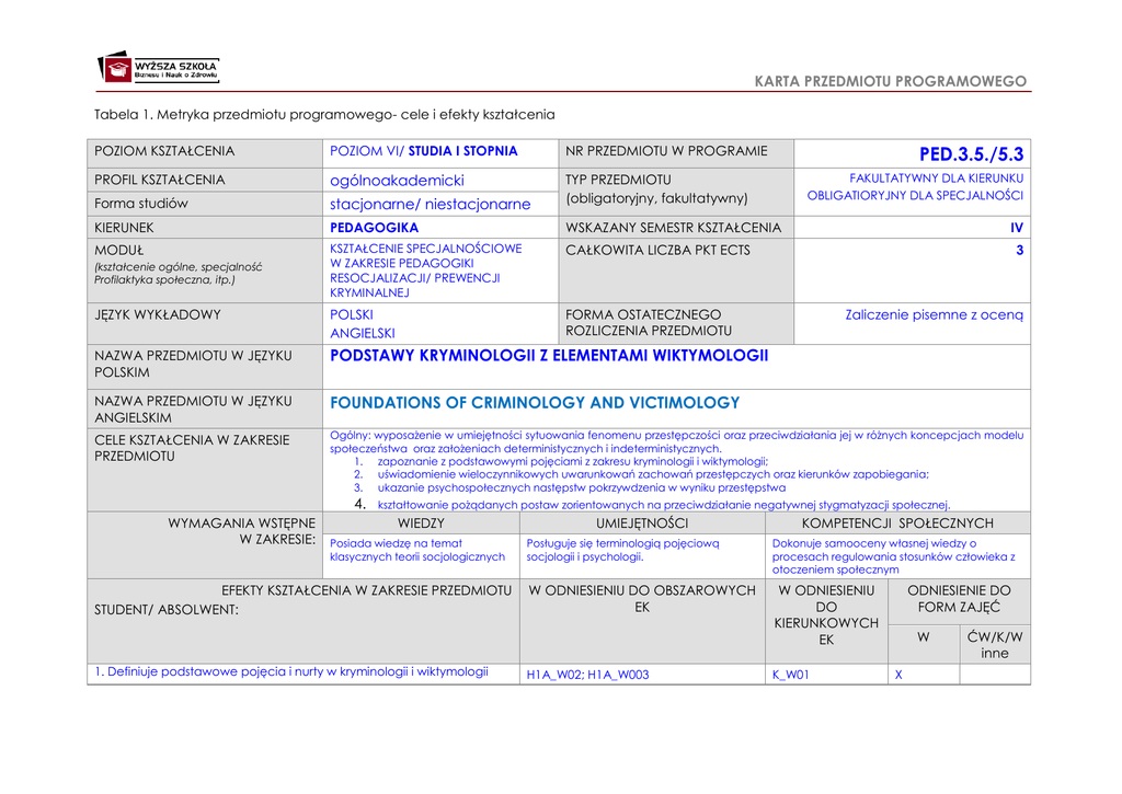 KARTA PRZEDMIOTU PROGRAMOWEGO Tabela 1. Metryka przedmiotu programowego- cele i efekty kształcenia PED.3.5./5.3 POZIOM KSZTAŁCENIA POZIOM VI/ STUDIA I STOPNIA NR PRZEDMIOTU W PROGRAMIE PROFIL KSZTAŁCENIA ogólnoakademicki Forma studiów stacjonarne/ niestacjonarne TYP PRZEDMIOTU (obligatoryjny, fakultatywny) KIERUNEK PEDAGOGIKA WSKAZANY SEMESTR KSZTAŁCENIA MODUŁ KSZTAŁCENIE SPECJALNOŚCIOWE W ZAKRESIE PEDAGOGIKI RESOCJALIZACJI/ PREWENCJI KRYMINALNEJ CAŁKOWITA LICZBA PKT ECTS JĘZYK WYKŁADOWY POLSKI ANGIELSKI FORMA OSTATECZNEGO ROZLICZENIA PRZEDMIOTU NAZWA PRZEDMIOTU W JĘZYKU POLSKIM PODSTAWY KRYMINOLOGII Z ELEMENTAMI WIKTYMOLOGII NAZWA PRZEDMIOTU W JĘZYKU ANGIELSKIM FOUNDATIONS OF CRIMINOLOGY AND VICTIMOLOGY CELE KSZTAŁCENIA W ZAKRESIE PRZEDMIOTU Ogólny: wyposażenie w umiejętności sytuowania fenomenu przestępczości oraz przeciwdziałania jej w różnych koncepcjach modelu społeczeństwa oraz założeniach deterministycznych i indeterministycznych. 1. zapoznanie z podstawowymi pojęciami z zakresu kryminologii i wiktymologii; 2. uświadomienie wieloczynnikowych uwarunkowań zachowań przestępczych oraz kierunków zapobiegania; 3. ukazanie psychospołecznych następstw pokrzywdzenia w wyniku przestępstwa (kształcenie ogólne, specjalność Profilaktyka społeczna, itp.) 4. WYMAGANIA WSTĘPNE W ZAKRESIE: FAKULTATYWNY DLA KIERUNKU OBLIGATIORYJNY DLA SPECJALNOŚCI IV 3 Zaliczenie pisemne z oceną kształtowanie pożądanych postaw zorientowanych na przeciwdziałanie negatywnej stygmatyzacji społecznej. WIEDZY Posiada wiedzę na temat klasycznych teorii socjologicznych EFEKTY KSZTAŁCENIA W ZAKRESIE PRZEDMIOTU STUDENT/ ABSOLWENT: 1. Definiuje podstawowe pojęcia i nurty w kryminologii i wiktymologii UMIEJĘTNOŚCI KOMPETENCJI SPOŁECZNYCH Posługuje się terminologią pojęciową socjologii i psychologii. Dokonuje samooceny własnej wiedzy o procesach regulowania stosunków człowieka z otoczeniem społecznym W ODNIESIENIU DO OBSZAROWYCH EK W ODNIESIENIU DO KIERUNKOWYCH EK H1A_W02; H1A_W003 K_W01 ODNIESIENIE DO FORM ZAJĘĆ W X ĆW/K/W inne KARTA PRZEDMIOTU PROGRAMOWEGO 2. Prezentuje teorie kryminologiczne H1A_W005; S1A_W005; K_W04 X zapobiegania S1A_U02; S1A_U01; S1A_U06; H1A_U04; S1P_U02 K_U02 X X 4. Wyjaśnia wieloczynnikowe uwarunkowania zachowań przestępczych H1A_U04; H1A_U06; S1A_U03; S1A_U08 K_U03 X X 5. Interpretuje psychospołeczne następstwa wiktymizacji w wyniku przestępstwa H1A_U01; H1A_U06; H1A_U11; H1A_U12; K_U06 3. Różnicuje kulturowo-społeczne uwarunkowania przestępczości i reakcji na przestępczość X Tabela 2. Walidacja i weryfikacja efektów kształcenia EFEKTY KSZTAŁCENIA- student Formy prezentacji EK Poziomy osiągnięcia EK i odpowiadające im oceny ndst (2) dst (3) db (4) bdb (5) Poprawnie rozpoznaje przedmiot badań oraz wylicza podstawowe pojęć z zakresu kryminologii i wiktymologii, jednak popełnia błędy w ich opisie. Poprawnie wymienia nurty w kryminologii bez precyzyjnego opisu założeń każdego z nich. Robi błędy podczas rozpoznawania klasyfikacji, genezy i założeń wybranych teorii kryminologicznych Poprawnie rozpoznaje przedmiot badań oraz wylicza podstawowe pojęcia z zakresu kryminologii i wiktymologii. Nieprecyzyjnie je opisuje. Poprawnie wymienia oraz opisuje nurty w kryminologii. Poprawnie rozpoznaje klasyfikacje, genezę i założenia najważniejszych teorii kryminologicznych Prawidłowo rozpoznaje przedmiot badań oraz wylicza wszystkie pojęcia z zakresu kryminologii i wiktymologii. Prawidłowo wymienia oraz wyczerpująco opisuje nurty w kryminologii. Wąsko i powierzchownie różnicuje kulturowo – społeczne uwarunkowania strategii działań zapobiegawczych i sformalizowanych oraz niesformalizowanych reakcji na przestępczość Poprawnie róznicuje kulturowo – społeczne uwarunkowania strategii działań zapobiegawczych i sformalizowanych oraz niesformalizowanych reakcji na przestępczość Prawidłowo i z odwołaniem do konkretnych teorii socjologicznych i psychologicznych różnicuje kulturowo – społeczne uwarunkowania strategii działań zapobiegawczych i sformalizowanych oraz niesformalizowanych reakcji na przestępczość 1. Definiuje podstawowe pojęcia i nurty w kryminologii i wiktymologii Pisemne, zadanie testowe (test wielokrotnego wyboru) Błędnie rozpoznaje przedmiot badań oraz nie wylicza podstawowych pojęć z zakresu kryminologii i wiktymologii oraz nie opisuje ich. Błędnie wymienia oraz opisuje nurty w kryminologii. 2. Prezentuje teorie kryminologiczne Pisemne, zadanie testowe (test wielokrotnego wyboru) Błędnie rozpoznaje klasyfikacje, genezę i założenia podstawowych teorii kryminologicznych 3. Różnicuje kulturowo-społeczne uwarunkowania zapobiegania przestępczości i reakcji na przestępczość Pisemne, zadanie testowe (test wielokrotnego wyboru) Nie uwzględnił czynników kulturowo – społecznych w różnicowaniu determinantów zapobiegania przestępczości i relokacji na przestępczość Prawidłowo rozpoznaje klasyfikacje, genezę i założenia poszczególnych teorii kryminologicznych KARTA PRZEDMIOTU PROGRAMOWEGO 4. Wyjaśnia wieloczynnikowe uwarunkowania zachowań przestępczych Pisemne, zadanie testowe (test wielokrotnego wyboru) Niepoprawnie dobiera teorie kryminologiczne podczas analizowania przyczyn przestępczości Poprawnie operuje teoriami kryminologicznymi dotyczącymi przyczyn przestępczości, popełnia błędy w analizie niektórych koncepcji i interpretacji Poprawnie operuje teoriami kryminologicznymi dotyczącymi przyczyn przestępczości, dokonuje analizy i interpretacji przyczyn przestępczości sięgając po elementy niektórych koncepcji Poprawnie operuje teoriami kryminologicznymi dotyczącymi przyczyn przestępczości, dokonuje wyczerpującej analizy i interpretacji przyczyn przestępczości sięgając po elementy najbardziej adekwatnych koncepcji 5. Interpretuje psychospołeczne następstwa wiktymizacji w wyniku przestępstwa Praca problemowa (typ