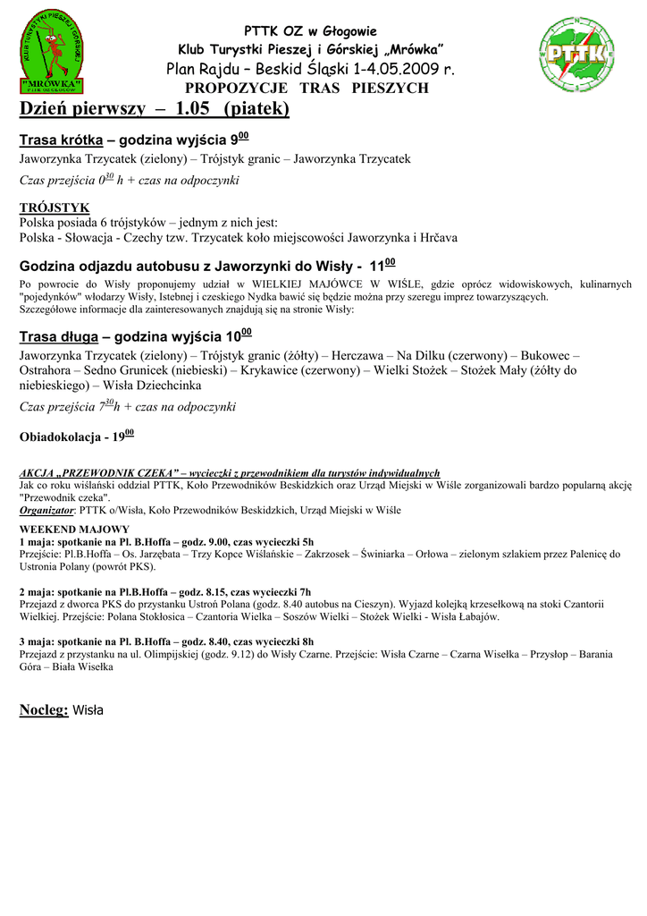 PTTK OZ w Głogowie Klub Turystki Pieszej i Górskiej „Mrówka” Plan Rajdu – Beskid Śląski 1-4.05.2009 r. PROPOZYCJE TRAS PIESZYCH Dzień pierwszy – 1.05 (piatek) Trasa krótka – godzina wyjścia 900 Jaworzynka Trzycatek (zielony) – Trójstyk granic – Jaworzynka Trzycatek Czas przejścia 030 h + czas na odpoczynki TRÓJSTYK Polska posiada 6 trójstyków – jednym z nich jest: Polska - Słowacja - Czechy tzw. Trzycatek koło miejscowości Jaworzynka i Hrčava Godzina odjazdu autobusu z Jaworzynki do Wisły - 1100 Po powrocie do Wisły proponujemy udział w WIELKIEJ MAJÓWCE W WIŚLE, gdzie oprócz widowiskowych, kulinarnych "pojedynków" włodarzy Wisły, Istebnej i czeskiego Nydka bawić się będzie można przy szeregu imprez towarzyszących. Szczegółowe informacje dla zainteresowanych znajdują się na stronie Wisły: Trasa długa – godzina wyjścia 1000 Jaworzynka Trzycatek (zielony) – Trójstyk granic (żółty) – Herczawa – Na Dilku (czerwony) – Bukowec – Ostrahora – Sedno Grunicek (niebieski) – Krykawice (czerwony) – Wielki Stożek – Stożek Mały (żółty do niebieskiego) – Wisła Dziechcinka Czas przejścia 730h + czas na odpoczynki Obiadokolacja - 1900 AKCJA „PRZEWODNIK CZEKA” – wycieczki z przewodnikiem dla turystów indywidualnych Jak co roku wiślański oddzial PTTK, Koło Przewodników Beskidzkich oraz Urząd Miejski w Wiśle zorganizowali bardzo popularną akcję "Przewodnik czeka". Organizator: PTTK o/Wisła, Koło Przewodników Beskidzkich, Urząd Miejski w Wiśle WEEKEND MAJOWY 1 maja: spotkanie na Pl. B.Hoffa – godz. 9.00, czas wycieczki 5h Przejście: Pl.B.Hoffa – Os. Jarzębata – Trzy Kopce Wiślańskie – Zakrzosek – Świniarka – Orłowa – zielonym szlakiem przez Palenicę do Ustronia Polany (powrót PKS). 2 maja: spotkanie na Pl.B.Hoffa – godz. 8.15, czas wycieczki 7h Przejazd z dworca PKS do przystanku Ustroń Polana (godz. 8.40 autobus na Cieszyn). Wyjazd kolejką krzesełkową na stoki Czantorii Wielkiej. Przejście: Polana Stokłosica – Czantoria Wielka – Soszów Wielki – Stożek Wielki - Wisła Łabajów. 3 maja: spotkanie na Pl. B.Hoffa – godz. 8.40, czas wycieczki 8h Przejazd z przystanku na ul. Olimpijskiej (godz. 9.12) do Wisły Czarne. Przejście: Wisła Czarne – Czarna Wisełka – Przysłop – Barania Góra – Biała Wisełka Nocleg: Wisła Dzień drugi - 02.05 (sobota) Śniadanie - godz. 700 Odjazd autobusu - godz. 730 Odjazd autobusu ze Szczyrku - godz. 1600 Odjazd autobusu z Wisła Czarne - godz. 1800 Obiadokolacja - 1900 Trasa krótka – godzina wyjścia 800 Przełęcz Salmopolska (czerwony) – Malinowska Skała (zielony) – Kopa Skrzyczeńska – Małe Skrzyczne – Skrzyczne (niebieski) – Szczyrk. Czas przejścia 335 h + czas na odpoczynki Przejazd autobusem ze Szczyrku (parking przy wyciągu na Skrzyczne) do Wisła Czarne: godz. 1600 Trasa długa – godzina wyjścia 830 Szczyrk (niebieski) – Skrzyczne (zielony) – Małe Skrzyczne – Malinowska Skała – Barania Góra (czerwony) – Przysłop (czarny) – Wisła Czarne (parking przy Domu Turysty PTTK ”Nad Zaporą”) Wycieczka przez najwyższe szczyty Beskidu Śląskiego. Między Baranią Góra a Skrzycznem grzbiet nie opada poniżej 1000 m n.p.m. To jedyna taka trasa w Beskidzie Śląskim! Czas przejścia 700 h + czas na odpoczynki Przełęcz Salmopolska, nazywana także Białym Krzyżem, jest jednym z najbardziej atrakcyjnych miejsc w okolicach Szczyrku. Na przełęczy znajduje się kilkumetrowej wysokości krzyż, a najbliższy szczyt w okolicy nosi nazwę Białego Krzyża (941 m n.p.m.). Przełęcz Salmopolska położona jest na wysokości 934 m n.p.m. i stanowi wspaniały punkt widokowy. Najwspanialszy widok podziwiać można jednak z pobliskiego szczytu Malinów (1117 m n.p.m.), na który podejść można czerwonym szlakiem prowadzącym na Malinowską Skałę. Jaskinia Malinowska położona jest w Beskidzie Śląskim pod szczytem góry Malinów. Otwór wejściowy znajduje się na wysokości 1080 m n.p.m. Jest jaskinią typu osuwiskowego. Powstała w tzw. zlepieńcach z Malinowskiej Skały i piaskowcach górnych warstw godulskich. Pionowe odcinki szczeliny są zabezpieczone metalowymi drabinami, które zastąpiły ustawiane tu niegdyś ostrewki i drabiny drewniane. Jaskinia rozwinięta jest w dwóch ciągach, zbudowanych z wąskich, wysokich szczelin, połączonych wąskimi, krętymi korytarzykami i kominkami. Zwiedzanie głównych partii jaskini - bez trudności. Możliwości pobłądzenia niewielkie. Aktualnie brak informacji o możliwych innych zagrożeniach. Niezbędna latarka i okrycie przeciwdeszczowe. Główny ciąg jest licznie odwiedzany przez turystów. Korona Beskidu Śląskiego - Skrzyczne Jako najwyższy szczyt Beskidu Śląskiego Skrzyczne należy do Korony Gór Polski. Ze Skrzycznego roztacza się przepiękny widok na Beskid Żywiecki, okolice Żywca i Jeziora Żywieckiego. Przy ładnej pogodzie pięknie widać Babią Górę, a nawet Tatry. Barania Góra liczy 1220 m n.p.m. i jest jednym z najpiękniejszych punktów widokowych w Beskidzie Śląskim. Na jej szczycie znajduje się ogólnodostępna (bezpłatna i zawsze otwarta) 15 metrowa wieża widokowa, z której roztacza się wspaniały widok na okoliczne szczyty i pasma górskie. Na Polanie Przysłop mieści się schronisko PTTK, Muzeum Turystyki w Beskidzie Śląskim czynne w weekendy, od maja do października. Zobaczyć w nim można bogaty zbiór pamiątek i dokumentów związanych z turystyką górską. Polana Przysłop stanowi duży węzeł szlaków turystycznych. Można z niej podążyć niebieskim szlakiem do Koniakowa (2 h 30 min), zielonym szlakiem do Istebnej (2 h), czerwonym, niebieskim i zielonym szlakiem na Baranią Górę (1 h), niebieskim szlakiem do Wisły Czarne (3 h), zielonym szlakiem na Skrzyczne (4 h 30 min), czerwonym szlakiem na Przełęcz Kubalonkę (2 h 15 min). Dzień trzeci - 03.05 (niedziela) Śniadanie - godz. 700