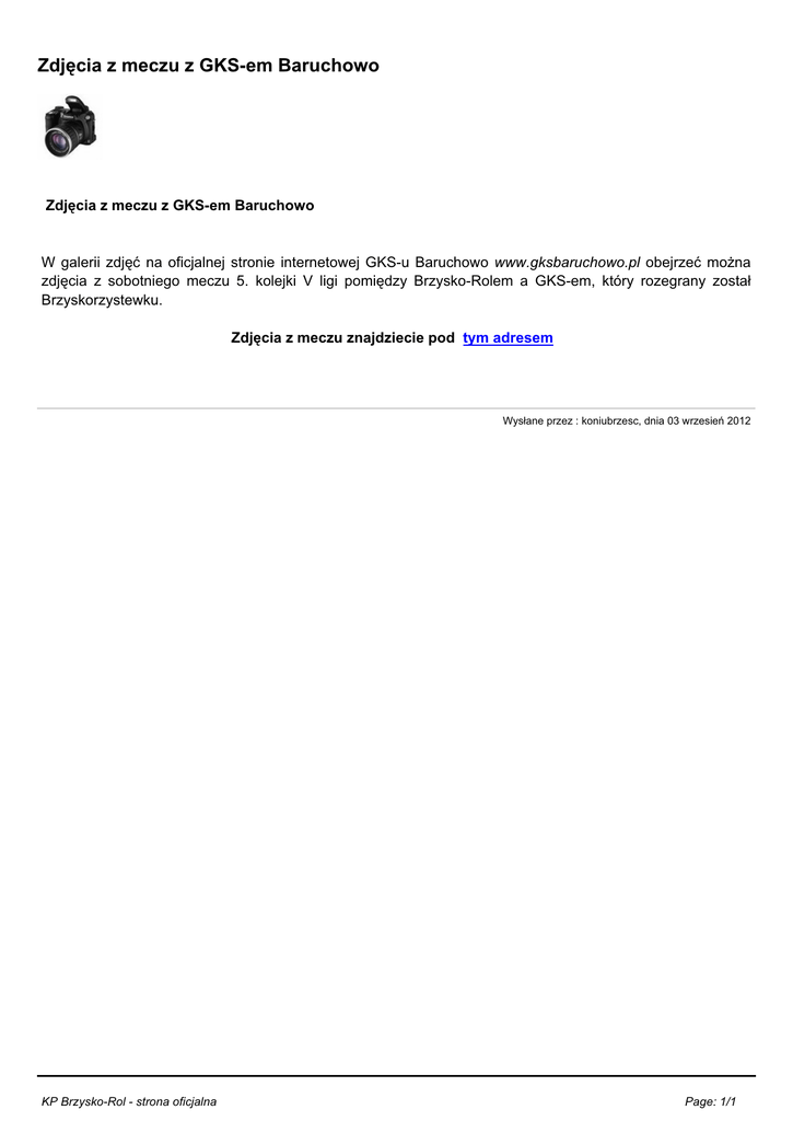 Zdjęcia z meczu z GKS-em Baruchowo Zdjęcia z meczu z GKS-em Baruchowo W galerii zdjęć na oficjalnej stronie internetowej GKS-u Baruchowo www.gksbaruchowo.pl obejrzeć można zdjęcia z sobotniego meczu 5. kolejki V ligi pomiędzy Brzysko-Rolem a GKS-em, który rozegrany został Brzyskorzystewku. Zdjęcia z meczu znajdziecie pod tym adresem Wysłane przez : koniubrzesc, dnia 03 wrzesień 2012 KP Brzysko-Rol - strona oficjalna Page: 1/1
