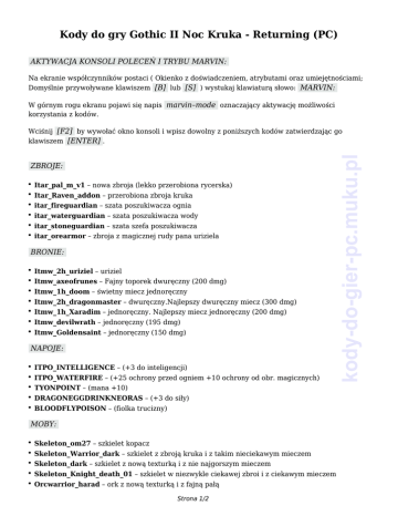 Kody do gry Gothic II Noc Kruka - Returning (PC) AKTYWACJA KONSOLI POLECEŃ I TRYBU MARVIN: Na ekranie współczynników postaci ( Okienko z doświadczeniem, atrybutami oraz umiejętnościami; Domyślnie przywoływane klawiszem [B] lub [S] ) wystukaj klawiaturą słowo: MARVIN: W górnym rogu ekranu pojawi się napis marvin–mode oznaczający aktywację możliwości korzystania z kodów. ZBROJE: ● Itar_pal_m_v1 – nowa zbroja (lekko przerobiona rycerska) ● Itar_Raven_addon – przerobiona zbroja kruka ● itar_fireguardian – szata poszukiwacza ognia ● itar_waterguardian – szata poszukiwacza wody ● itar_stoneguardian – szata szefa poszukiwacza ● itar_orearmor – zbroja z magicznej rudy pana uriziela BRONIE: ● Itmw_2h_uriziel – uriziel ● Itmw_axeofrunes – Fajny toporek dwuręczny (200 dmg) ● Itmw_1h_doom – świetny miecz jednoręczny ● Itmw_2h_dragonmaster – dwuręczny.Najlepszy dwuręczny miecz (300 dmg) ● Itmw_1h_Xaradim – jednoręczny. Najlepszy miecz jednoręczny (200 dmg) ● Itmw_devilwrath – jednoręczny (195 dmg) ● Itmw_Goldensaint – jednoręczny (150 dmg) NAPOJE: ● ITPO_INTELLIGENCE – (+3 do inteligencji) ● ITPO_WATERFIRE – (+25 ochrony przed ogniem +10 ochrony od obr. magicznych) ● TYONPOINT – (mana +10) ● DRAGONEGGDRINKNEORAS – (+3 do siły) ● BLOODFLYPOISON – (fiolka trucizny) MOBY: ● Skeleton_om27 – szkielet kopacz ● Skeleton_Warrior_dark – szkielet z zbroją kruka i z takim nieciekawym mieczem ● Skeleton_dark – szkielet z nową texturką i z nie najgorszym mieczem ● Skeleton_Knight_death_01 – szkielet w niezwykle ciekawej zbroi i z ciekawym mieczem ● Orcwarrior_harad – ork z nową texturką i z fajną pałą Strona 1/2 kody-do-gier-pc.muku.pl Wciśnij [F2] by wywołać okno konsoli i wpisz dowolny z poniższych kodów zatwierdzając go klawiszem [ENTER] . ● Orcwarrior_roam – ten nowy ork często spotykany ● orkelite_addon3_chkflg_18 – mocniejszy elita ● orc_8515_Nurshak – jeden z dowódców orków ● MINECRAWLER – pełzacz ● MINECRAWLERWARRIOR – pełzacz wojownik INNE: ● itwr_xardasdocs_1 – Kod na zapiski Xardasa w misji dla nekromantow ● itwr_xardasdocs_2 – Kod na zapiski Xardasa w misji dla nekromantow ITMI_ORCMAINTOTEM – działa jak ulu mulu, nie trzeba go zakładać, wystarczy, że mamy go w eq kody-do-gier-pc.muku.pl ● Strona 2/2