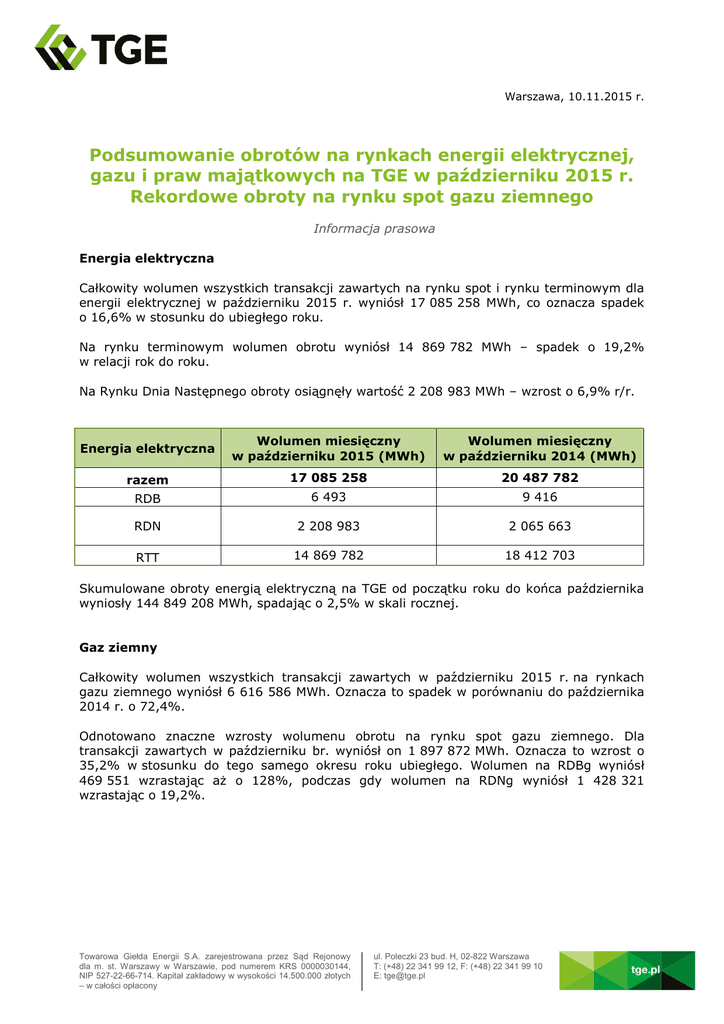 Warszawa, 10.11.2015 r. Podsumowanie obrotów na rynkach energii elektrycznej, gazu i praw majątkowych na TGE w październiku 2015 r. Rekordowe obroty na rynku spot gazu ziemnego Informacja prasowa Energia elektryczna Całkowity wolumen wszystkich transakcji zawartych na rynku spot i rynku terminowym dla energii elektrycznej w październiku 2015 r. wyniósł 17 085 258 MWh, co oznacza spadek o 16,6% w stosunku do ubiegłego roku. Na rynku terminowym wolumen obrotu wyniósł 14 869 782 MWh – spadek o 19,2% w relacji rok do roku. Na Rynku Dnia Następnego obroty osiągnęły wartość 2 208 983 MWh – wzrost o 6,9% r/r. Energia elektryczna Wolumen miesięczny w październiku 2015 (MWh) Wolumen miesięczny w październiku 2014 (MWh) razem 17 085 258 20 487 782 RDB 6 493 9 416 RDN 2 208 983 2 065 663 RTT 14 869 782 18 412 703 Skumulowane obroty energią elektryczną na TGE od początku roku do końca października wyniosły 144 849 208 MWh, spadając o 2,5% w skali rocznej. Gaz ziemny Całkowity wolumen wszystkich transakcji zawartych w październiku 2015 r. na rynkach gazu ziemnego wyniósł 6 616 586 MWh. Oznacza to spadek w porównaniu do października 2014 r. o 72,4%. Odnotowano znaczne wzrosty wolumenu obrotu na rynku spot gazu ziemnego. Dla transakcji zawartych w październiku br. wyniósł on 1 897 872 MWh. Oznacza to wzrost o 35,2% w stosunku do tego samego okresu roku ubiegłego. Wolumen na RDBg wyniósł 469 551 wzrastając aż o 128%, podczas gdy wolumen na RDNg wyniósł 1 428 321 wzrastając o 19,2%. Towarowa Giełda Energii S.A. zarejestrowana przez Sąd Rejonowy dla m. st. Warszawy w Warszawie, pod numerem KRS 0000030144, NIP 527-22-66-714. Kapitał zakładowy w wysokości 14.500.000 złotych – w całości opłacony ul. Poleczki 23 bud. H, 02-822 Warszawa T: (+48) 22 341 99 12, F: (+48) 22 341 99 10 E: [email protected] Gaz ziemny Wolumen miesięczny w październiku 2015 (MWh) Wolumen miesięczny w październiku 2014 (MWh) razem 6 616 586 23 990 245 RDBg 469 551 205 938 RDNg 1 428 321 1 197 771 RTT 4 718 714 22 586 536 Skumulowane obroty gazem ziemnym na TGE od początku roku do końca października wyniosły 93 102 274 MWh, wzrastając o 5,7% w skali rocznej. Rynek Praw Majątkowych Łączny wolumen obrotu prawami majątkowymi dla energii elektrycznej w październiku br. 3 730 468 MWh, wzrastając w skali roku o 26,0%. wyniósł razem Wolumen miesięczny w październiku 2015 (MWh) 3 730 468 Wolumen miesięczny w październiku 2014 (MWh) 2 961 634 zielone certyfikaty 2 131 835 2 271 529 obrót sesyjny RPM 841 371 513 619 obrót pozasesyjny RPM 1 290 464 1 757 910 żółte certyfikaty 642 468 48 655 obrót sesyjny RPM 119 139 30 296 obrót pozasesyjny RPM 523 329 18 358 czerwone certyfikaty 942 443 613 035 Prawa Majątkowe dla energii elektrycznej obrót sesyjny RPM 342 066 153 175 obrót pozasesyjny RPM 600 376 459 860 fioletowe certyfikaty 13 722 28 415 obrót sesyjny RPM 13 390 28 415 obrót pozasesyjny RPM 331 0 Praw Majątkowe dla efektywności energetycznej razem (białe certyfikaty) Wolumen miesięczny w październiku 2015 (MWh) Wolumen miesięczny w październiku 2014 (MWh) 1 264 0 obrót sesyjny RPM 1 264 0 obrót pozasesyjny RPM 0 0 Wolumen miesięczny w październiku 2015 (MWh) 7 919 Wolumen miesięczny w październiku 2014 (MWh) - Gwarancje Pochodzenia energii elektrycznej Gwarancje Pochodzenia Towarowa Giełda Energii S.A. zarejestrowana przez Sąd Rejonowy dla m. st. Warszawy w Warszawie, pod numerem KRS 0000030144, NIP 527-22-66-714. Kapitał zakładowy w wysokości 14.500.000 złotych – w całości opłacony ul. Poleczki 23 bud. H, 02-822 Warszawa T: (+48) 22 341 99 12, F: (+48) 22 341 99 10 E: [email protected] Nowi uczestnicy Obecnie status członka Rynku Towarów Giełdowych (RTG) ma 68 spółek. W październiku br. do grona członków RTG dołączyła Elektrociepłownia „Zielona Góra” S.A. W Rejestrze Świadectw Pochodzenia prowadzonym przez Towarową Giełdę Energii znajduje się obecnie 2415 członków rejestru. W październiku 2015 r. przybyło 24 kolejnych. Na Rynku Instrumentów Finansowych status członka RIF uzyskało siedem podmiotów: Dom Maklerski Banku Ochrony Środowiska S.A., Dom Maklerski Noble Securities S.A., PGE Dom Maklerski, IRL Polska Sp. z o.o., DUON Marketing and Trading S.A., Polskie Górnictwo Naftowe i Gazownictwo S.A. oraz ING Securities. *** Fakty o TGE: Towarowa Giełda Energii S.A. powstała pod koniec 1999 roku. Działalność operacyjną rozpoczęła 30 czerwca 2000 roku. Uruchomienie TGE było jednym z pierwszych działań w kierunku liberalizacji polskiego rynku energii elektrycznej i prywatyzacji sektora elektroenergetycznego. Jedyna licencjonowana giełda towarowa w Polsce, instytucja zaufania publicznego, stabilny właściciel – Giełda Papierów Wartościowych w Warszawie Członek europejskiego rynku Multi-Regional Coupling (MRC). Źródło transparentnych i aktualnych informacji o rynku energii. Jedyna instytucja, która agreguje całą ofertę dotyczącą rynku energii w kraju: energia elektryczna, gaz ziemny, świadectwa pochodzenia, gwarancje pochodzenia, uprawnienia do emisji CO2, rynek instrumentów finansowych. Najdynamiczniej rozwijająca się giełda towarowa w regionie - członek EUROPEX, APEx i AFM. Łączny wolumen obrotu na rynkach fizycznych energii elektrycznej TGE w 2014 r. wyniósł 186,8 TWh, co stanowi 119,4 % krajowej produkcji energii i 117,7 % jej zużycia w kraju. TGE znajduje się na opublikowanej przez ACER liście platform do raportowania danych transakcyjnych RRM TGE zgodnie z wymogami REMIT. Od grudnia 2010 TGE i Nord Pool Spot prowadzą połączone rynki dnia następnego na zasadach market coupling na połączeniu Swe-Pol Link łączącym Szwecję i Polskę, w 2016 r. zostanie uruchomione połączenie z Litwą. www.tge.pl Kontakt dla mediów: Towarowa Giełda Energii S.A.; Agata Samcik; [email protected], +48 885 885 645, +48 607 030 573, +48 661 878 769 Towarowa Giełda Energi