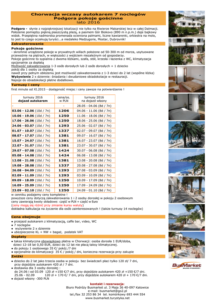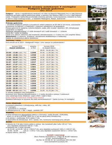 Chorwacja wczasy autokarem 7 noclegów Podgora pokoje gościnne lato 2016 Podgora - słynie z najpiękniejszej lokalizacji nie tylko na Riwierze Makarskiej lecz w całej Dalmacji. Położenie pomiędzy piękną piaszczystą plażą, a pasmem Gór Biokovo (890 m n.p.m.) daje bajkowy widok. Przepiękna nadmorska promenada ocieniona palmami, liczne kawiarenki, orkiestra na molo, to jest to czego oczekują turyści...a niedaleko Medżugorie, Mostar, Dubrovnik! Zakwaterowanie Pokoje gościnne - skromnie urządzone pokoje w prywatnych willach położone od 50-300 m od morza, usytuowane przeważnie na piętrach, w większości z wejściem niezależnym od gospodarzy. Pokoje gościnne to sypialnia z dwoma łóżkami, szafa, stół, krzesła i łazienka z WC, klimatyzacja opcjonalnie za dopłatą Możliwość zakwaterowania 1-3 osób dorosłych lub 2 osób dorosłych + 1 dziecko pokój dla 1 osoby za dopłatą nawet przy pełnym obłożeniu jest możliwość zakwaterowania z 1-3 dzieci do 2 lat (wspólne łóżka) Wyżywienie 2 x dziennie: śniadania i dwudaniowe obiadokolacje w restauracji. Napoje do obiadokolacji płatne dodatkowo. Turnusy i ceny first minute od XI.2015 - dostępność miejsc i ceny zawsze na potwierdzenie ! turnusy 2016 dojazd autokarem cena/os. w PLN turnusy 2016 na dojazd własny - 28.05 - 04.06 (8d / 7n) 03.06 - 12.06 (10d / 7n) 1206 04.06 - 11.06 (8d / 7n) 10.06 - 19.06 (10d / 7n) 1250 11.06 - 18.06 (8d / 7n) 17.06 - 26.06 (10d / 7n) 1250 18.06 - 25.06 (8d / 7n) 24.06 - 03.07 (10d / 7n) 1293 25.06 - 02.07 (8d / 7n) 01.07 - 10.07 (10d / 7n) 1337 02.07 - 09.07 (8d / 7n) 08.07 - 17.07 (10d / 7n) 1381 09.07 - 16.07 (8d / 7n) 15.07 - 24.07 (10d / 7n) 1381 16.07 - 23.07 (8d / 7n) 22.07 - 31.07 (10d / 7n) 1381 23.07 - 30.07 (8d / 7n) 29.07 - 07.08 (10d / 7n) 1424 30.07 - 06.08 (8d / 7n) 05.08 - 14.08 (10d / 7n) 1424 06.08 - 13.08 (8d / 7n) 12.08 - 21.08 (10d / 7n) 1381 13.08 - 20.08 (8d / 7n) 19.08 - 28.08 (10d / 7n) 1337 20.08 - 27.08 (8d / 7n) 26.08 - 04.09 (10d / 7n) 1293 27.08 - 03.09 (8d / 7n) 02.09 - 11.09 (10d / 7n) 1293 03.09 - 10.09 (8d / 7n) 09.09 - 18.09 (10d / 7n) 1250 10.09 - 17.09 (8d / 7n) 16.09 - 25.09 (10d / 7n) 1250 17.09 - 24.09 (8d / 7n) 23.09 - 02.10 (10d / 7n) 1250 24.09 - 01.10 (8d / 7n) - w cenniku podajemy ceny kompletne ! powyższe ceny dotyczą zakwaterowania 1 i 2 osoby dorosłej w pokoju 2 osobowym ceny zawierają kwoty składowe: część w PLN + część w Euro (ceny mogą się różnić przy zmianie kursu waluty) dokładna kalkulacja na życzenie dla osób zainteresowanych ! (także turnusy 14 noclegów) a Cena obejmuje ● ● ● ● przejazd autokarem z klimatyzacją, caffe bar, video, WC 7 noclegów wyżywienie 2 x dziennie ubezpieczenie KL + NW + bagaż, podatek VAT Dopłaty ● taksa klimatyczna obowiązkowo płatna w Chorwacji: osoba dorosła 1 EUR/doba, dzieci 12-18 lat 0,50 EUR, dzieci do 12 lat nie płacą taksy klimatycznej. ● do pokoju 1 osobowego 35 €/ pokój /7 dni ● opcjonalnie do klimatyzacji 35 € / pokój / dni, konieczna rezerwacja przy zakupie Zniżki ● dziecko do 2 lat jako trzecia osoba w pokoju bez świadczeń płaci tylko 120 zł/ 7 dni, przy dojeździe autokarem 420 zł / 7 dni. ● dostawka dla 3 osoby dorosłej : do 24.06 i od 03.09 120 zł +150 €/7 dni, przy dojeździe autokarem 420 zł +150 €/7 dni. 25.06 - 02.09 120 zł + 170 €/ 7 dni, przy dojeździe autokarem 420 zł + 170 €/7 dni. ● dojazd własny -300 PLN kontakt i rezerwacja: Biuro Podróży Busmarket ul. 3 Maja 36 40-097 Katowice e-mail: [email protected] tel./fax 32 253 86 34 tel. komórkowy 693 444 554 www.busmarket.turystyka.net Informacje dodatkowe Ceny składają się z części składowej w PLN i części w walucie Euro: 1. Kwota w złotych płatna jest w Polsce, kwota w EUR w Czarnogórze 2. Równowartość kwoty w EUR płatna w Polsce: - obowiązkowo przy dojeździe własnym lub gdy potrzebna jest faktura na całość, wtedy kwotę w EUR należy przeliczyć na zł wg kursu NBP tabela sprzedaż. 3. Wycieczki fakultatywne organizowane są przez lokalne biura podróży: Wodospady Rzeki Krka ok. 60 EUR Split ok. 45 EUR Dubrownik ok. 55 EUR Medjugorie ok. 45 EUR 4. Doba hotelowa rozpoczyna się o godz. 14:00 i kończy o godz. 9:00. Praktyczne informacje Najbliższa placówka dyplomatyczna: Ambasada RP, Krlezin Gvozd 3, 10000 Zagreb tel. (+385) 14834575, 4834579 fax. (+385)14834577 Wydział Konsularny tel/fax ( +385) 14899444 Obowiązująca waluta: 1 kuna (HRK) = 100 lip (1 EUR = ok. 7,2 kun) Program ramowy/dojazd autokarem 1 dzień Wyjazd z Polski zgodnie z rozkładem jazdy, przejazd przez Słowację (dla chętnych posiłek za opłatą ok. 8 €), Węgry i Chorwację. 2 dzień przyjazd do Chorwacji wg rozkładu jazdy, zakwaterowanie od godziny 14:00, nocleg. 2 – 8 dzień Wypoczynek, możliwość wykupienia wycieczek fakultatywnych. 9 dzień wykwaterowanie z pokoi do godz. 9:00. Wyjazd do Polski wg rozkładu jazdy, przejazd przez Chorwację, Węgry. 10 dzień Przejazd przez Słowację (dla chętnych posiłek za opłatą ok. 8 €). Przyjazd do Polski w godzinach południowych, orientacyjny przyjazd do Krakowa ok. godz. 14 Informacje transportowe wyjazdy autokaru w soboty, powroty w niedziele Miasto wyjazdu Bielsko Biała Miejsce wyjazdu Dworzec PKS dolna płyta Godzina wyjazdu Dopłata 14:40 20 zł Częstochowa stacja BP McDonalds kierunek Katowice 12:30 60 zł Gliwice ul.Pionierów 8, zajezdnia PKS Gliwice 12:45 20 zł Jawornik Stacja ORLEN kierunek Chyżne 17:00 0 Jabłonka parking przy Policji 18:40 0 Katowice Dworzec PKS ul.Piotra Skargi 13:30 20 zł Kielce parking przed Dworcem PKP 14:00 60 zł Kraków RDA ul.Bosacka górna płyta stanowisko 10-13 16:00 0 Łódź Łódź Kaliska stanowisko autobusowe 10:30 100 zł Opole parking przed Dworcem PKP 12:00 80 zł Radom Dworzec PKP parking przy zegarze 12:00 80 zł Tychy stacja Bliska przy trasie Katowice-Bielsko 14:00 20 zł Warszawa Pałac Kultury parking od ul.Marszałkowskiej 10:00 100 z