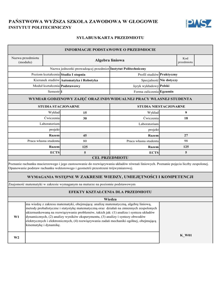 PAŃSTWOWA WYŻSZA SZKOŁA ZAWODOWA W GŁOGOWIE INSTYTUT POLITECHNICZNY SYLABUS/KARTA PRZEDMIOTU INFORMACJE PODSTAWOWE O PRZEDMIOCIE Nazwa przedmiotu (modułu) Kod przedmiotu Algebra liniowa Nazwa jednostki prowadzącej przedmiot Instytut Politechniczny Poziom kształcenia Studia I stopnia Profil studiów Praktyczny Kierunek studiów Automatyka i Robotyka Specjalność Nie dotyczy Moduł kształcenia Podstawowy Język wykładowy Polski Semestr I Forma zaliczenia Egzamin WYMIAR GODZINOWY ZAJĘĆ ORAZ INDYWIDUALNEJ PRACY WŁASNEJ STUDENTA STUDIA STACJONARNE STUDIA NIESTACJONARNE Wykład 15 Wykład 9 Ćwiczenia 30 Ćwiczenia 18 Laboratorium Laboratorium projekt projekt Razem 45 Razem 27 Praca własna studenta 80 Praca własna studenta 98 Razem 125 Razem 125 ECTS 5 ECTS 5 CEL PRZEDMIOTU Poznanie rachunku macierzowego i jego zastosowanie do rozwiązywania układów równań liniowych. Poznanie pojęcia liczby zespolonej. Opanowanie podstaw rachunku wektorowego i geometrii przestrzeni trójwymiarowej. WYMAGANIA WSTĘPNE W ZAKRESIE WIEDZY, UMIEJĘTNOŚCI I KOMPETENCJI Znajomość matematyki w zakresie wymaganym na maturze na poziomie podstawowym EFEKTY KSZTAŁCENIA DLA PRZEDMIOTU Wiedza W1 W2 ma wiedzę z zakresu matematyki, obejmującą: analizę matematyczną, algebrę liniową, metody probalistyczne i statystykę matematyczną oraz działań na zmiennych zespolonych ukiernunkowaną na rozwiązywanie problemów, takich jak: (1) analiza i synteza układów dynamicznych, (2) analizy wyników eksperymentu, (3) analizy i syntezy obwodów elektrycznych i elektronicznych, (4) rozwiązywania zadań mechaniki ogólnej, obejmującą kinematykę i dynamikę. K_W01 W3 U1 Umiejętności potrafi pozyskiwać informacje z takich źródeł jak: literatura, bazy danych i innych powszechnie dostępnych mediów przekazu informacji, jak również integrować je w celu interpretacji, a także wyciągać wnioski i formułować opinie K_U01 U2 U3 Kompetencje społeczne K1 świadomie odpowiada za pracę własną oraz przestrzega zasad określających pracę w zespole K_K01 K2 K3 TREŚCI KSZTAŁCENIA (PROGRAMOWE) STUDIA STACJONARNE Temat W Liczba godzin C L /P Macierze i wyznaczniki 4 8 Układy równań liniowych 2 4 Liczby zespolone, wielomiany i funkcje wymierne 4 8 Rachunek wektorowy 2 4 Geometria analityczna w przestrzeni 3 6 15 30 RAZEM 0 STUDIA NIESTACJONARNE Temat W Liczba godzin C L /P Macierze i wyznaczniki 3 6 Układy równań liniowych 1 2 Liczby zespolone, wielomiany i funkcje wymierne 2 4 Rachunek wektorowy 1 2 Geometria analityczna w przestrzeni 2 4 WERYFIKACJA EFEKTÓW KSZTAŁCENIA Egzamin/ Prace kontrolne Kod Opis W1 ma wiedzę z zakresu matematyki, obejmującą: analizę matematyczną, algebrę liniową, metody probalistyczne i statystykę matematyczną oraz działań na zmiennych zespolonych ukiernunkowaną W2 0 W3 0 U1 potrafi pozyskiwać informacje z takich źródeł jak: literatura, bazy danych i innych powszechnie dostępnych mediów przekazu informacji, jak również integrować je w celu interpretacji, a także U2 0 U3 0 K1 świadomie odpowiada za pracę własną oraz przestrzega zasad określających pracę w zespole K2 0 K3 0 Waga w werfikacji efektów kształcenia Projekty Aktywność na zajęciach 70% 30% OBCIĄŻENIE PRACĄ STUDENTA 1 2 Godziny zajęć dydaktycznych zgodnie z planem studiów Praca własna studenta Suma ECTS Stacjonarne Niestacjonarne 45 80 125 5 27 98 125 5 LITERATURA Podstawowa 1 T.Jurlewicz, Z.Skoczylas, Algebra z geometrią analityczną. Deficje, twierdzenia, wzory, Oficyna GiS, Wrocław 2008 2 T.Jurlewicz, Z.Skoczylas, Algebra z geometrią analityczną. Przykłady i zadania, Oficyna GiS, Wrocław 2008 Uzupełniajaca 1 R.Leitner, W.Maliszewski, Z.Rojek, Zadania z matematyki wyższej, cz.1, WNT,Warszawa 2000 2 W.Krysicki, L.Włodarski, Analiza matematyczna w zadaniach, cz.1, PWN, Warszawa 2001 PAŃSTWOWA WYŻSZA SZKOŁA ZAWODOWA W GŁOGOWIE INSTYTUT POLITECHNICZNY SYLABUS/KARTA PRZEDMIOTU INFORMACJE PODSTAWOWE O PRZEDMIOCIE Nazwa przedmiotu (modułu) Kod przedmiotu Analiza i modelowanie systemów Nazwa jednostki prowadzącej przedmiot Instytut Politechniczny Poziom kształcenia Studia I stopnia Profil studiów Praktyczny Kierunek studiów Automatyka i Robotyka Specjalność Nie dotyczy Moduł kształcenia Podstawowy Język wykładowy Polski Semestr II Forma zaliczenia Egzamin WYMIAR GODZINOWY ZAJĘĆ ORAZ INDYWIDUALNEJ PRACY WŁASNEJ STUDENTA STUDIA STACJONARNE Wykład STUDIA NIESTACJONARNE Wykład 15 Ćwiczenia Laboratorium 9 Ćwiczenia Laboratorium 30 projekt 18 projekt Razem 45 Razem 27 Praca własna studenta 55 Praca własna studenta 73 Razem 100 Razem 100 ECTS 4 ECTS 4 CEL PRZEDMIOTU Poznanie podstawowych pojęć rachunku różniczkowego i całkowego funkcji wielu zmienych. Wprowadzenie do teorii równań rózniczkowych zwyczajnych. Poznanie pojęcia transformat całkowych (Fouriera i Laplace'a). Stosowanie nabytej wiedzy do tworzenia i analizy modeli matematycznych służących do rozwiązywania problemów w praktyce inżynierskiej WYMAGANIA WSTĘPNE W ZAKRESIE WIEDZY, UMIEJĘTNOŚCI I KOMPETENCJI Znajomość podstaw rachunku różniczkowego i całkowego funkcji jednej zmiennej rzeczywistej EFEKTY KSZTAŁCENIA DLA PRZEDMIOTU Wiedza W1 W2 W3 ma wiedzę z zakresu matematyki, obejmującą: analizę matematyczną, algebrę liniową, metody probalistyczne i statystykę matematyczną oraz działań na zmiennych zespolonych ukiernunkowaną na rozwiązywanie problemów, takich jak: (1) analiza i synteza układów dynamicznych, (2) analizy wyników eksperymentu, (3) analizy i syntezy obwodów elektrycznych i elektronicznych, (4) rozwiązywania zadań mechaniki ogólnej, obejmującą kinematykę i dynamikę. K_W01 U1 potrafi pozyskiwać informacje z takich źródeł jak: literatura, bazy danych i innych powszechnie dostępnych mediów przekazu informacji, jak również integrować je w celu interpretacji, a także wyciągać wnioski i formułować opinie K_U01 U2 U3 Kompete