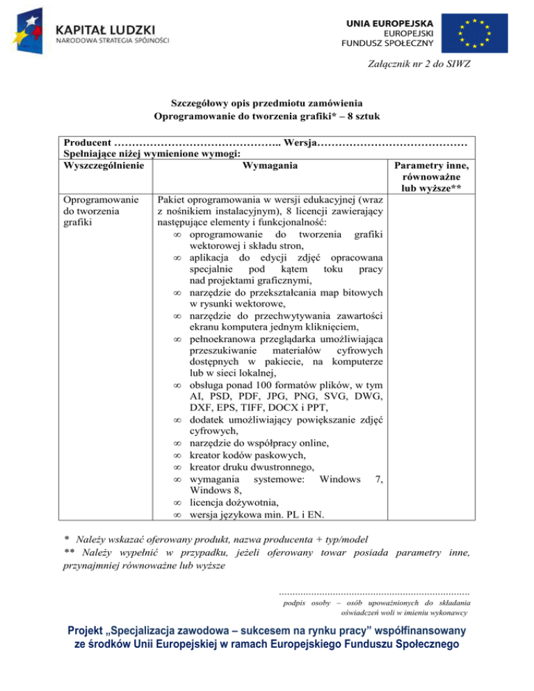 Załącznik nr 2 do SIWZ Szczegółowy opis przedmiotu zamówienia Oprogramowanie do tworzenia grafiki* – 8 sztuk Producent ……………………………………….. Wersja…………………………………… Spełniające niżej wymienione wymogi: Wyszczególnienie Wymagania Parametry inne, równoważne lub wyższe** Oprogramowanie Pakiet oprogramowania w wersji edukacyjnej (wraz do tworzenia z nośnikiem instalacyjnym), 8 licencji zawierający grafiki następujące elementy i funkcjonalność: • oprogramowanie do tworzenia grafiki wektorowej i składu stron, • aplikacja do edycji zdjęć opracowana specjalnie pod kątem toku pracy nad projektami graficznymi, • narzędzie do przekształcania map bitowych w rysunki wektorowe, • narzędzie do przechwytywania zawartości ekranu komputera jednym kliknięciem, • pełnoekranowa przeglądarka umożliwiająca przeszukiwanie materiałów cyfrowych dostępnych w pakiecie, na komputerze lub w sieci lokalnej, • obsługa ponad 100 formatów plików, w tym AI, PSD, PDF, JPG, PNG, SVG, DWG, DXF, EPS, TIFF, DOCX i PPT, • dodatek umożliwiający powiększanie zdjęć cyfrowych, • narzędzie do współpracy online, • kreator kodów paskowych, • kreator druku dwustronnego, • wymagania systemowe: Windows 7, Windows 8, • licencja dożywotnia, • wersja językowa min. PL i EN. * Należy wskazać oferowany produkt, nazwa producenta + typ/model ** Należy wypełnić w przypadku, jeżeli oferowany towar posiada parametry inne, przynajmniej równoważne lub wyższe ....................................................................... podpis osoby – osób upoważnionych do składania oświadczeń woli w imieniu wykonawcy Projekt „Specjalizacja zawodowa – sukcesem na rynku pracy” współfinansowany ze środków Unii Europejskiej w ramach Europejskiego Funduszu Społecznego