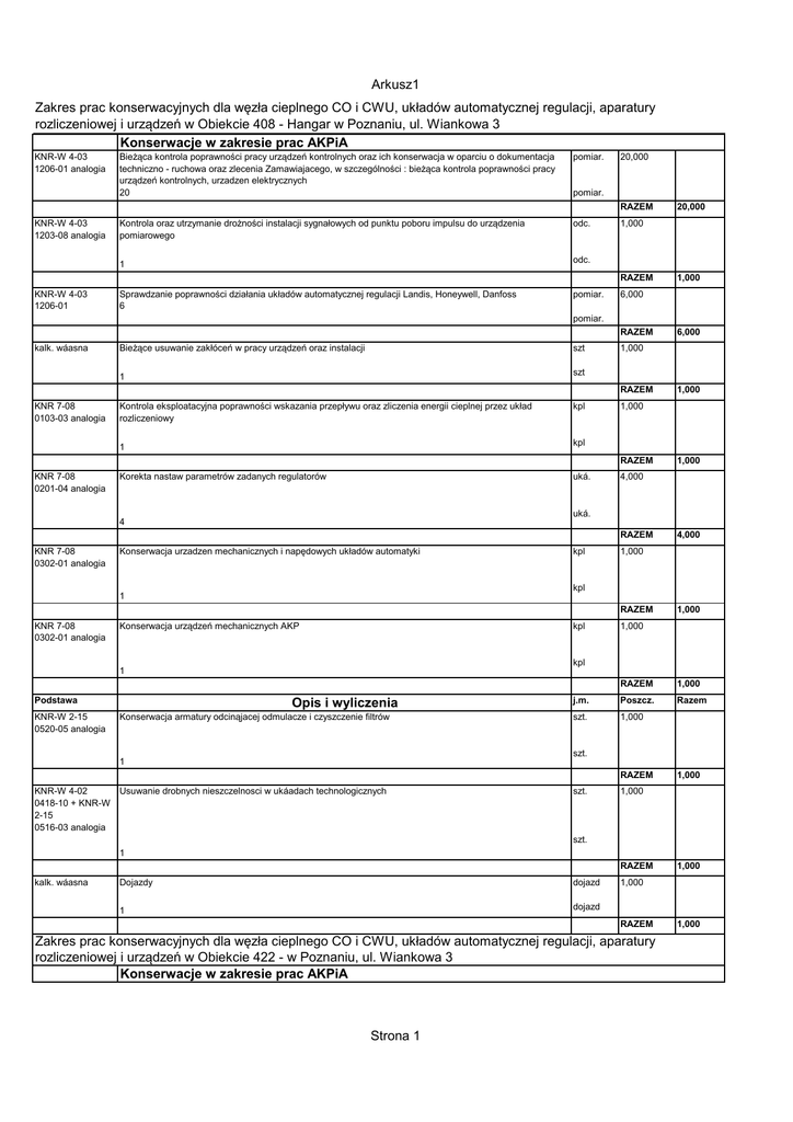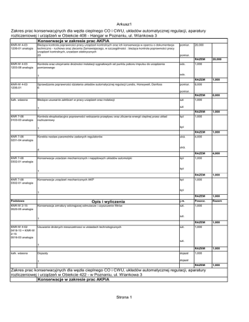 Arkusz1 Zakres prac konserwacyjnych dla węzła cieplnego CO i CWU, układów automatycznej regulacji, aparatury rozliczeniowej i urządzeń w Obiekcie 408 - Hangar w Poznaniu, ul. Wiankowa 3 Konserwacje w zakresie prac AKPiA KNR-W 4-03 1206-01 analogia Bieżąca kontrola poprawności pracy urządzeń kontrolnych oraz ich konserwacja w oparciu o dokumentacja techniczno - ruchowa oraz zlecenia Zamawiajacego, w szczególności : bieżąca kontrola poprawności pracy urządzeń kontrolnych, urzadzen elektrycznych 20 pomiar. Kontrola oraz utrzymanie drożności instalacji sygnałowych od punktu poboru impulsu do urządzenia pomiarowego odc. 1 odc. Sprawdzanie poprawności działania układów automatycznej regulacji Landis, Honeywell, Danfoss 6 pomiar. 20,000 pomiar. RAZEM KNR-W 4-03 1203-08 analogia RAZEM KNR-W 4-03 1206-01 20,000 1,000 1,000 6,000 pomiar. RAZEM kalk. wáasna Bieżące usuwanie zakłóceń w pracy urządzeń oraz instalacji szt 1 szt Kontrola eksploatacyjna poprawności wskazania przepływu oraz zliczenia energii cieplnej przez układ rozliczeniowy kpl 1 kpl Korekta nastaw parametrów zadanych regulatorów uká. RAZEM KNR 7-08 0103-03 analogia 1,000 1,000 RAZEM KNR 7-08 0201-04 analogia 6,000 1,000 1,000 4,000 uká. 4 RAZEM KNR 7-08 0302-01 analogia Konserwacja urzadzen mechanicznych i napędowych układów automatyki kpl 4,000 1,000 kpl 1 RAZEM KNR 7-08 0302-01 analogia Konserwacja urządzeń mechanicznych AKP kpl 1,000 1,000 kpl 1 Podstawa KNR-W 2-15 0520-05 analogia Opis i wyliczenia Konserwacja armatury odcinąjacej odmulacze i czyszczenie filtrów RAZEM 1,000 j.m. Poszcz. Razem szt. 1,000 szt. 1 RAZEM KNR-W 4-02 0418-10 + KNR-W 2-15 0516-03 analogia Usuwanie drobnych nieszczelnosci w ukáadach technologicznych szt. 1,000 1,000 szt. 1 RAZEM kalk. wáasna Dojazdy dojazd 1 dojazd RAZEM Zakres prac konserwacyjnych dla węzła cieplnego CO i CWU, układów automatycznej regulacji, aparatury rozliczeniowej i urządzeń w Obiekcie 422 - w Poznaniu, ul. Wiankowa 3 Konserwacje w zakresie prac AKPiA Strona 1 1,000 1,000 1,000 Arkusz1 KNR-W 4-03 1206-01 analogia Bieżąca kontrola poprawności pracy urządzeń kontrolnych oraz ich konserwacja w oparciu o dokumentacja techniczno - ruchowa oraz zlecenia Zamawiajacego, w szczególności : bieżąca kontrola poprawności pracy urządzeń kontrolnych, urzadzen elektrycznych 20 pomiar. Kontrola oraz utrzymanie droĪnoĞci instalacji sygnaáowych od punktu poboru impulsu do urządzenia pomiarowego odc. 1 odc. Sprawdzanie poprawnoĞci dziaáania ukáadów automatycznej regulacji Landis, Honeywell, Danfoss 6 pomiar. 20,000 pomiar. RAZEM KNR-W 4-03 1203-08 analogia RAZEM KNR-W 4-03 1206-01 20,000 1,000 1,000 6,000 pomiar. RAZEM kalk. wáasna BieĪące usuwanie zakáócen w pracy urzadzeĔ oraz instalacji szt 1 szt Kontrola eksploatacyjna poprawnoĞci wskazania przepáywu oraz zliczenia energii cieplnej przez ukáad rozliczeniowy kpl 1 kpl Korekta nastaw parametrów zadanych regulatorów uká. RAZEM KNR 7-08 0103-03 analogia 1,000 1,000 RAZEM KNR 7-08 0201-04 analogia 6,000 1,000 1,000 4,000 uká. 4 RAZEM KNR 7-08 0302-01 analogia Konserwacja urzadzen mechanicznych i napedowych ukáadów automatyki kpl 4,000 1,000 kpl 1 RAZEM KNR 7-08 0302-01 analogia Konserwacja urzadzeĔ mechanicznych AKP kpl 1,000 1,000 kpl 1 RAZEM KNR-W 2-15 0520-05 analogia Konserwacja armatury odcinąjacej odmulacze i czyszczenie filtrów szt. 1,000 1,000 szt. 1 RAZEM KNR-W 4-02 0418-10 + KNR-W 2-15 0516-03 analogia Usuwanie drobnych nieszczelnosci w ukáadach technologicznych szt. 1,000 1,000 szt. 1 RAZEM kalk. wáasna Dojazdy dojazd 1 dojazd 1,000 1,000 RAZEM 1,000 Zakres prac konserwacyjnych dla węzła cieplnego CO i CWU, układów automatycznej regulacji, aparatury rozliczeniowej i urządzeń w Obiekcie 302 – Wieża w Poznaniu, ul. Wiankowa 3 Konserwacje w zakresie prac AKPiA KNR-W 4-03 1206-01 analogia BieĪąca kontrola poprawnoĞci pracy urządzeĔ kontrolnych, urządzeĔ elektrycznych oraz ich konserwacja 20 pomiar. 20,000 pomiar. RAZEM Strona 2 20,000 Arkusz1 KNR-W 4-03 1206-01 Sprawdzanie poprawnoĞci dziaáania ukáadów automatycznej regulacji Danfoss pomiar. 6 pomiar. RAZEM 6,000 j.m. Poszcz. Razem BieĪące usuwanie zakáócen w pracy urzadzeĔ oraz instalacji szt 1,000 1 szt Kontrola eksploatacyjna poprawnoĞci wskazania przepáywu oraz zliczenia energii cieplnej przez ukáad rozliczeniowy kpl 1 kpl Korekta nastaw parametrów zadanych regulatorów uká. Podstawa kalk. wáasna 6,000 Opis i wyliczenia RAZEM KNR 7-08 0103-03 analogia RAZEM KNR 7-08 0201-04 analogia 1,000 1,000 1,000 4,000 uká. 4 RAZEM KNR 7-08 0302-01 analogia Konserwacja urzadzeĔ mechanicznych i napĊdowych ukáadów automatyki kpl 4,000 1,000 kpl 1 RAZEM KNR 7-08 0302-01 analogia Konserwacja urzadzeĔ mechanicznych AKP kpl 1,000 1,000 kpl 1 RAZEM KNR-W 2-15 0520-05 analogia Konserwacja armatury odcinąjacej odmulacze i czyszczenie filtrów szt. 1,000 1,000 szt. 1 RAZEM KNR-W 4-02 0418-10 + KNR-W 2-15 0516-03 analogia Usuwanie drobnych nieszczelnosci w ukáadach technologicznych szt. 1,000 1,000 szt. 1 RAZEM kalk. wáasna Dojazdy dojazd 1 dojazd RAZEM Strona 3 1,000 1,000 1,000