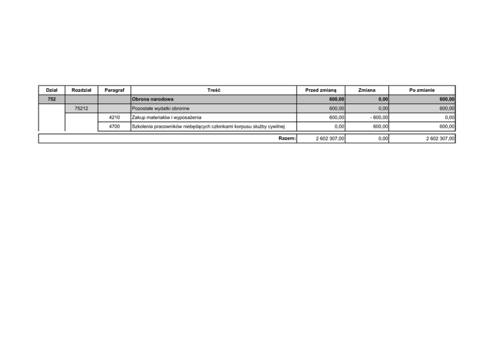 Dział Rozdział Treść Paragraf 752 Przed zmianą Zmiana Po zmianie Obrona narodowa 600,00 0,00 600,00 Pozostałe wydatki obronne 600,00 0,00 600,00 4210 Zakup materiałów i wyposażenia 600,00 - 600,00 0,00 4700 Szkolenia pracowników niebędących członkami korpusu służby cywilnej 0,00 600,00 600,00 2 602 307,00 0,00 2 602 307,00 75212 Razem: