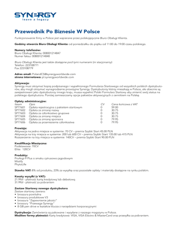 Przewodnik Po Biznesie W Polsce Funkcjonowanie firmy w Polsce jest wspierane przez polskojęzyczne Biuro Obsługi Klienta. Godziny otwarcia Biura Obsługi Klienta: od poniedziałku do piątku od 11:00 do 19:00 czasu polskiego. Numery telefonów: Biuro Obsługi Klienta: 008001214847 Numer faksu: 008001214848 Biuro Obsługi Klienta jest także dostępne pod tymi numerami (nr stacjonarny): Telefon: 223108771 Fax 223108779 Adres email: [email protected] strona internetowa: pl.synergyworldwide.com Aktywacja: Synergy musi otrzymać kopię podpisanego i wypełnionego Formularza Startowego od wszystkich polskich dystrybutorów, aby mogli otrzymać wynagrodzenie prowizyjne Synergy. Dystrybutorzy którzy mieszkają w Polsce, ale obecnie są zarejestrowani jako dystrybutorzy innego kraju, musza wypełnić Polski Formularz Startowy aby zmienić swój status na polskiego dystrybutora. Poniżej zamieszczamy opcje pakietów aktywacyjnych z cennikiem na Polskę. Opłaty administracyjne: Iteam Opis SP77601 Opłata rejestracyjna z pakietem startowym SP77602 Opłata za zmianę nazwy SP77603 Opłata za członkostwo grupowe SP77604 Opłata za zmianę miejsca SP77605 Opłata za zmianę sponsora SP77606 Opłata za przeniesienie członkostwa CV 0 0 0 0 0 0 Cena końcowa z VAT 59.00 30.75 30.75 30.75 79.95 79.95 Prowizje: Aktywacja na jedno miejsce w systemie: 70 CV – premia Szybki Start 45.00 PLN Aktywacja na trzy miejsca w systemie: 200 lub 600 CV – premia Szybki Start 135.00 lub 415 PLN Rozszerzenie na trzy miejsca w systemie: 140CV – premia Szybki Start 90.00 PLN Kwalifikacja Miesięczna: Podstawowa: 70CV Elite: 120CV Produkty: ProArgi-9 Plus o smaku cytrusowo-jagodowym Mistify PhytoLife Stawka VAT: 8% od produktu, 23% za wysyłkę oraz pozostałe opłaty i materiały dostępne na rynku polskim. Koszty wysyłki (z VAT): 21.99zł - płatność kartą kredytową lub debetową 31.99zł - płatność za pobraniem Zestaw Startowy nowego dystrybutora Zestaw startowy zawiera: • broszura powitalna • broszury produktowe V3 • broszura "Zapewnienie jakości" • broszury "Przewaga Synergy" • 8 GB pen drive w kształcie klucza z narzędziami korporacyjnymi Dystrybucja: Zamówienia są pakowane i wysyłane z naszego magazynu w Polsce. Możliwe formy płatności: Karty kredytowe: VISA, VISA Electro & MasterCard oraz przesyłka za pobraniem. How To Do Business In Poland Poland is supported in Poland by our Polish Customer Service Team. Customer Service hours of operations: 11.00 to 19.00 local time Phone numbers: Customer service: 008001214847 Fax number for customer service: 008001214848 Customer service is also available on these numbers (not toll free): Phone: 223108771 Fax: 223108779 Customer Service e-mail address: [email protected] Website: pl.synergyworldwide.com Activation: Synergy must receive a signed and completed copy of the Getting Started form for all Polish Team Members in order to pay commissions to them.. Existing Team Members who live in Poland and are currently enrolled in other Synergy markets will have to submit a Getting Started Form to change their account over to Poland. Below you will find the different activation options and price list for Poland. Fee's and CS SKU's: Item Description SP77601 Starter Kit and online business fee SP77602 Name Change Fee SP77603 Group Membership Fee SP77604 Placement Change Fee SP77605 Sponsor Change Fee SP77606 Transfer of Team Membership Fee CV 0 0 0 0 0 0 Price with VAT 59.00 30.75 30.75 30.75 79.95 79.95 Commissions: Activation CV for 1 TC: 70CV – FSB zł45.00 Activation CV for 3 TC: 200 or 600cv – FSB 135 or 415zł Upgrade CV: 140CV – FSB zł90.00 Monthly Qualification: Standard: 70CV Elite: 120CV Products: ProArgi-9 Plus Citrus Berry Mistify PhytoLife VAT rate: 8% on product and 23% on shipping and other none CV items. Shipping rates (VAT included): 21.99zl - credit and debit card payments 31.99zl - Cash On Delivery (COD) payments New Member Starter kit Starter kits include: • Welcome Brochure • V3 Product Brochures • Quality Assurance Brochure • Synergy Advantage Tear Off Pad • 8 GB key shape pen drive with corporate tools Distribution: Orders will be picked, packed, and shipped from our Poland warehouse. Payment methods: Credit cards: VISA, VISA Electro, MasterCard, and Cash On Delivery (COD)