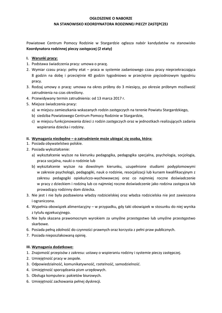 OGŁOSZENIE O NABORZE NA STANOWISKO KOORDYNATORA RODZINNEJ PIECZY ZASTĘPCZEJ Powiatowe Centrum Pomocy Rodzinie w Stargardzie ogłasza nabór kandydatów na stanowisko Koordynatora rodzinnej pieczy zastępczej (2 etaty) I. Warunki pracy: 1. Podstawa świadczenia pracy: umowa o pracę. 2. Wymiar czasu pracy: pełny etat – praca w systemie zadaniowego czasu pracy nieprzekraczająca 8 godzin na dobę i przeciętnie 40 godzin tygodniowo w przeciętnie pięciodniowym tygodniu pracy. 3. Rodzaj umowy o pracę: umowa na okres próbny do 3 miesięcy, po okresie próbnym możliwość zatrudnienia na czas określony. 4. Przewidywany termin zatrudnienia: od 13 marca 2017 r. 5. Miejsce świadczenia pracy: a) w miejscu zamieszkania wskazanych rodzin zastępczych na terenie Powiatu Stargardzkiego, b) siedziba Powiatowego Centrum Pomocy Rodzinie w Stargardzie, c) w miejscu funkcjonowania dzieci z rodzin zastępczych oraz w jednostkach realizujących zadania wspierania dziecka i rodziny. II. Wymagania niezbędne – o zatrudnienie może ubiegać się osoba, która: 1. Posiada obywatelstwo polskie. 2. Posiada wykształcenie: a) wykształcenie wyższe na kierunku pedagogika, pedagogika specjalna, psychologia, socjologia, praca socjalna, nauki o rodzinie lub b) wykształcenie wyższe na dowolnym kierunku, uzupełnione studiami podyplomowymi w zakresie psychologii, pedagogiki, nauk o rodzinie, resocjalizacji lub kursem kwalifikacyjnym z zakresu pedagogiki opiekuńczo-wychowawczej oraz co najmniej roczne doświadczenie w pracy z dzieckiem i rodziną lub co najmniej roczne doświadczenie jako rodzina zastępcza lub prowadzący rodzinny dom dziecka. 3. Nie jest i nie była pozbawiona władzy rodzicielskiej oraz władza rodzicielska nie jest zawieszona i ograniczona. 4. Wypełnia obowiązek alimentacyjny – w przypadku, gdy taki obowiązek w stosunku do niej wynika z tytułu egzekucyjnego. 5. Nie była skazana prawomocnym wyrokiem za umyślne przestępstwo lub umyślne przestępstwo skarbowe. 6. Posiada pełną zdolność do czynności prawnych oraz korzysta z pełni praw publicznych. 7. Posiada nieposzlakowaną opinię. III. Wymagania dodatkowe: 1. Znajomość przepisów z zakresu: ustawy o wspieraniu rodziny i systemie pieczy zastępczej. 2. Umiejętność pracy w zespole. 3. Odpowiedzialność, komunikatywność, rzetelność, samodzielność. 4. Umiejętność sporządzania pism urzędowych. 5. Obsługa komputera: pakietów biurowych. 6. Umiejętność zachowania pełnej dyskrecji. IV. Do zadań koordynatora rodzinnej pieczy zastępczej będzie należało w szczególności: 1. Udzielanie pomocy rodzinom zastępczym i prowadzącym rodzinne domy dziecka w realizacji zadań wynikających z pieczy zastępczej; 2. Przygotowanie, we współpracy z odpowiednio rodziną zastępczą lub prowadzącym rodzinny dom dziecka oraz asystentem rodziny, a w przypadku gry rodzinie nie został przydzielony asystent rodziny – we współpracy z podmiotem organizującym pracę z rodziną, planu pomocy dziecku. 3. Pomoc rodzinom zastępczym oraz prowadzącym rodzinne domy dziecka w nawiązaniu wzajemnego kontaktu. 4. Zapewnianie rodzinom zastępczym oraz prowadzącym rodzinne domy dziecka dostępu do specjalistycznej pomocy dla dzieci, w tym psychologicznej, reedukacyjnej i rehabilitacyjnej. 5. Zgłaszanie do ośrodków adopcyjnych informacji o dzieciach z uregulowaną sytuacją prawną, w celu poszukiwania dla nich rodzin przysposabiających. 6. Udzielanie wsparcia pełnoletnim wychowankom rodzinnych form pieczy zastępczej. 7. Przedstawianie corocznego sprawozdania z efektów pracy organizatorowi rodzinnej pieczy zastępczej. 8. Dokonywanie okresowej oceny sytuacji dzieci przebywających w pieczy zastępczej i przekładanie jej organizatorowi rodzinnej pieczy zastępczej. 9. Wykonywanie pozostałych zadań zgodnie z ustawą o wspieraniu rodziny i systemie pieczy zastępczej. 10.Wykonywanie innych zadań zleconych przez Dyrektora PCPR. V. Wymagane dokumenty (w przypadku kopii powinny one zostać potwierdzone za zgodność kserokopii z oryginałem): 1. Podanie o przyjęcie na stanowisko objęte naborem. 2. Curriculum Vitae (CV) z opisem dotychczasowego przebiegu pracy zawodowej. 3. Kopie dokumentów potwierdzających wymagane wykształcenie, o którym mowa w pkt II ppkt 2 ogłoszenia o naborze. 4. Kserokopie dokumentów potwierdzających doświadczenie zawodowe. 5. Kserokopie innych dodatkowych dokumentów o posiadanych kwalifikacjach, umiejętnościach. 6. Oświadczenia kandydata: a) oświadczenie o stanie zdrowia pozwalające na zatrudnienie na danym stanowisku, b) oświadczenie o posiadaniu pełnej zdolności do czynności prawnych i korzystaniu z pełni praw publicznych, c) oświadczenie, że kandydat nie jest i nie był pozbawiony władzy rodzicielskiej oraz władza rodzicielska nie jest mu zawieszona ani ograniczona, d) oświadczenie o wypełnianiu obowiązku alimentacyjnego – w przypadku gdy taki obowiązek w stosunku do niego wynika z tytułu egzekucyjnego lub oświadczenie, że na kandydacie nie ciąży obowiązek alimentacyjny wynikający z tytułu egzekucyjnego, e) oświadczenie, że kandydat nie był skazany prawomocnym wyrokiem za umyślne przestępstwo lub umyślne przestępstwo skarbowe, f) oświadczenie o nie toczącym się postępowaniu karnym o umyślne przestępstwo ścigane z oskarżenia publicznego, g) oświadczenie o wyrażeniu zgody na przetwarzanie danych osobowych w procesie naboru kandydatów zgodnie z ustawą z dnia 29 sierpnia 1997 r. o ochronie danych osobowych (Dz. U. z 2016 r. poz. 922), h) osoba wybrana do zatrudnienia będzie zobowiązana do przedstawienia oryginału aktualnego „Zapytania o udzielenie informacji o osobie” z Krajowego Rejestru Karnego. VI. Procedura składania i oceny dokumentów: 1. Ofertę wraz z załączonymi dokumentami należy składać osobiście w pokoju 019 lub za pośrednictwem poczty pod adresem: Powiatowe Centrum Pomocy Rodzinie w Stargardzie, ul. Skarbowa 1, 73
