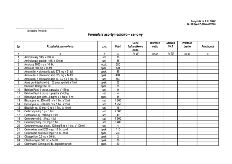 Załącznik nr 3 do SIWZ Nr:SPSW-NZ-2266-46/2008 ............................................................................. (pieczątka firmowa) Formularz asortymentowo – cenowy Lp x 1 2 3 4 5 6 7 8 9 10 11 12 13 14 15 16 17 18 19 20 21 22 23 24 25 Przedmiot zamowienia x Aminokwasy 10% x 500 ml Aminokwasy pediatr. 10% x 100 ml Amotaks 1000 mg x 16 tbl. Amotaks 500 mg x 16 tbl. Amoxicilini + clavulanic acid 375 mg x 21 tbl. Amoxicilini + clavulanic acid 625 mg x 14 tbl. Amoxicilini + clavulanic acid inj. 2,2 g x 1 but. inf. Aqua pro injectione inj. 100 amp. (poliet) a’ 5 ml Baclofen 10 mg x 50 tbl. Bebilon Pepti 1 prosz. x puszka a’ 450 g Bebilon Pepti 2 prosz. x puszka a’ 450 g Biodacyna gutt. opht. 3 mg/ml x 1 but.a’ 5 ml Biodacyna inj. 250 ml/2 ml x 1 fiol. a’ 2 ml Biodacyna inj. 500 ml/2 ml x 1 fiol. a’ 2 ml Biodribin inj. 10 mg/10 ml x 1 fiol. a’ 10 ml Ceftazydym inj. 1 g x 1 fiol. Ceftriakson inj. 250 mg x 1 fiol. Cefuroksym inj. 1,5 g x 1 fiol. Cefuroksym inj. 750 mg x 1 fiol. Cefuroksym zaw. doust. 125 mg/5 ml x 1 but. a’ 100 ml Cefuroxime axetil 250 mg x 10 tbl. powl. Cefuroxime axetil 500 mg x 10 tbl. powl. Cilazaprilum 0,5 mg x 30 tbl. Clarithromycin 500 mg x 14 tbl. Clotrimazol 100 mg x 6 tbl. dopochwowych J.m. Ilość x szt. szt. opak. opak. opak. opak. szt. opak. opak. szt. szt. opak. szt. szt. szt. szt. szt. szt. szt. szt. opak. opak. opak. opak. opak. x 18 35 280 170 85 460 560 52 35 9 4 45 1 200 1 750 18 2 300 40 7 500 6 400 4 110 230 2 18 50 Cena jednostkowa netto /w zł/ Wartość netto Stawka VAT Wartość brutto Producent /w zl/ /w %/ /w zł/ x 26 27 28 29 30 31 32 33 34 35 36 37 38 39 40 41 42 43 44 45 46 47 48 49 50 51 52 53 54 55 56 57 58 59 60 Clotrimazolum 1% krem x 1 tuba a’20 g Curosurf zaw. 120 mg/1,5 ml x 2 fiol. a’1,5 ml Darbepoetyna alfa inj. 500 µg x 1 amp-strz. Dysport inj. 500 j.m. x 1 fiol. Eltroxin 50 µg x 100 tbl. Emulsja tłuszczowa 10% x 100 ml Emulsja tłuszczowa 20% x 100 ml Entocort 3 mg x 100 kaps. Erytropoetyna beta 10 tys. j.m. x 1 amp-strz. Erytropoetyna beta 30 tys. j.m. x 1 amp-strz. Esmeron inj. 50 mg/5 ml x 12 amp. a’5 ml Fraxiparyna inj. 2850 j.m./0,3 ml x 1 amp-strz. Fraxiparyna inj. 3800 j.m./0,4 ml x 1 amp-strz. Fraxiparyna inj. 5700 j.m./0,6 ml x 1 amp-strz. Fraxiparyna inj. 7600 j.m./0,8 ml x 1 amp-strz. Furosemidum 40 mg x 30 tbl. Furosemidum inj. 20 mg/2 ml x 5 amp. Inj. Magnesii sulfurici 20% inj. 2 g/10 ml x 10 amp. Intralipid 10% a’ 500 ml Ketoprofenum 50 mg x 24 kaps. Lacipil 4 mg x 28 tbl. Marcaine 0,5% inj. 5 mg/ml x 5 fiol. a’ 20 ml Marcaine Spinal 0,5% Heavy inj. 5 mg/ml x 5 fiol. a’ 4 ml Metocard 50 mg x 30 tbl. Metoclopramid 10 mg x 50 tbl. Metoclopramid inj. 10 mg/2 ml x 5 amp. Metoprolol succinate 47,5 mg x 28 tbl. o przedł. uwal. Mivacron inj. 10 mg/5 ml x 5 amp. a’ 5 ml Natr. chloratum 0,9% inj. 100 amp. (poliet) a’ 10 ml Natr. chloratum 10% inj. 100 amp. (poliet) a’ 10 ml Nimbex inj. 2 mg/ml x 5 amp. a’ 2,5 ml Nimbex inj. 2 mg/ml x 5 amp. a’ 5 ml Nivalin inj. 2,5 mg/ml x 10 amp. a’ 1 ml Ondansetron inj. 8 mg/4 ml x 5 amp. a’ 4 ml Oxaliplatin inj. 100 mg/20 ml x 1 fiol. szt. opak. szt. szt. opak. szt. szt. opak. szt. szt. opak. szt. szt. szt. szt. opak. opak. opak. szt. opak. opak. opak. opak. opak. opak. opak. opak. opak. opak. opak. opak. opak. opak. opak. szt. 35 3 8 30 4 20 27 6 35 15 2 4 200 3 240 1 450 1 260 350 730 800 170 225 4 24 110 150 50 570 65 14 350 28 84 84 22 350 18 61 62 63 64 65 66 67 68 69 70 71 72 73 74 75 76 77 78 79 Oxaliplatin inj. 50 mg/10 ml x 1 fiol. Oxytocin inj. 5 j.m./ml x 5 amp. a’ 1 ml Pyralgin 500 mg x 10 tbl. Pyralgin inj. 1 g/2 ml x 5 amp. a’ 2 ml Pyralgin inj. 2,5 g/5 ml x 5 amp. a’ 5 ml Ranigast 150 mg x 60 tbl. Ranigast inj. 50 mg/100 ml x 1 flakon a’ 100 ml Simvastatinum 20 mg x 28 tbl. Simvastatinum 40 mg x 28 tbl. Smecta proszek x 1 opak. a’ 30 saszet. Syntarpen inj. 500 mg x 1 fiol. Tazocin 4,5 g x 1 fiol. Ticarcilin+clavulanic acid inj. 1,6 g x 10 fiol. Ticarcilin+clavulanic acid inj. 3,2 g x 10 fiol. Ultiva inj. 1 mg x 5 fiol. Ultravist 300 inj. 300 mg x 1 fiol. a’ 20 ml Ultravist 300 inj. 300 mg x 1 fiol. a’ 50 ml Urografin 76% inj. 760 mg/ml x 1 amp. a’ 20 ml Xylocaine 2% inj. 20 mg/ml x 5 fiol. a’ 50 ml szt. opak. opak. opak. opak. opak. szt. opak. opak. opak. szt. szt. opak. opak. opak. szt. szt. szt. opak. 35 155 295 560 860 140 1 450 52 20 45 1 750 55 9 7 38 84 85 1 500 190 suma: x x Słownie wartość brutto: Część opisowo-informacyjna dla Wykonawców: 1. Poszczególne pozycje należy wypełnić dokładnie i czytelnie zgodnie z tytułami kolumn. 2. W przypadku konieczności dokonania poprawek należy dokonać ich poprzez przekreślenie wadliwej treści, złożenie parafki oraz wpisanie daty, następnie wpisanie obok treści właściwej. 3. Wartości muszą być podane w zł. 4. Dotyczy poz. 18 (Cefuroksym inj. 1,5 g x 1 fiol) i poz. 19 (Cefuroksym inj. 750 mg x 1 fiol.) – Zamawiający wymaga, aby preparaty z w/w pozycji posiadały rejestrację stosowania u pacjentów od urodzenia. ……………………………………… dnia ……………….. 2008 r. …………………………………………….. (podpis Wykonawcy)