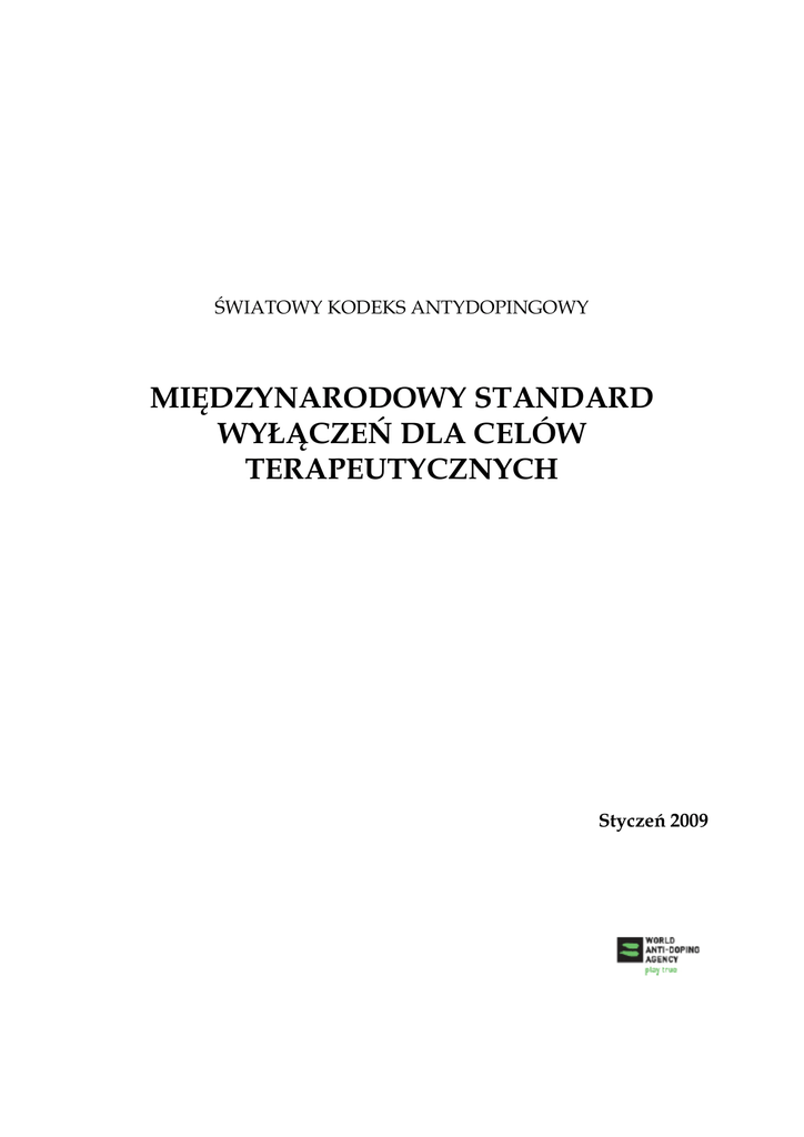 ŚWIATOWY KODEKS ANTYDOPINGOWY MIĘDZYNARODOWY STANDARD WYŁĄCZEŃ DLA CELÓW TERAPEUTYCZNYCH Styczeń 2009 Międzynarodowy Standard Wyłączeń dla Celów Terapeutycznych Międzynarodowy Standard Wyłączeń dla Celów Terapeutycznych został przyjęty po raz pierwszy w roku 2004 i wszedł w życie w roku 2005. Poniższy dokument jest wersją 3.0 Standardu i zawiera poprawki do Międzynarodowego Standardu Wyłączeń dla Celów Terapeutycznych przyjęte przez Komitet Wykonawczy Światowej Agencji Antydopingowej 10 maja i 20 września 2008 r. Zmieniony Międzynarodowy Standard Wyłączeń dla Celów Terapeutycznych obowiązuje od 1 stycznia 2009 r. Opublikowany 1 października 2008 r. przez: World Anti-Doping Agency Stock Exchange Tower 800 Place Victoria (Suite 1700) PO Box 120 Montreal, Quebec Canada H4Z 1B7 URL: www.wada-ama.org Tel.: +1 514 904 9232 Faks: +1 514 904 8650 E-mail: [email protected] Międzynarodowy Standard Wyłączeń dla Celów Terapeutycznych Styczeń 2009 r. 2 PREAMBUŁA Międzynarodowy Standard Wyłączeń dla Celów Terapeutycznych Światowego Kodeksu Antydopingowego (TUE) jest międzynarodowym standardem szczebla 2 opracowanym w ramach Światowego Programu Zwalczania Dopingu. Podstawą do opracowania Międzynarodowego Standardu TUE był przegląd różnych procedur i protokołów federacji międzynarodowych, Międzynarodowego Komitetu Olimpijskiego, Krajowych Agencji Antydopingowych oraz odpowiednich rozdziałów poprawionego Międzynarodowego Standardu Kontroli Dopingowej (International Standard for Doping Control – ISDC). Dokument został oceniony, omówiony i przygotowany przez szeroką grupę ekspertów powołanych przez WADA po przeprowadzeniu wszechstronnych konsultacji. Tekst oficjalny Międzynarodowego Standardu Wyłączeń dla Celów Terapeutycznych znajduje się w WADA i został opublikowany w języku angielskim i francuskim. W razie jakiejkolwiek sprzeczności między wersją angielską i francuską, wersją obowiązującą jest wersja w języku angielskim. Międzynarodowy Standard TUE (wersja 3.0) wchodzi w życie 1 stycznia 2009 r. Międzynarodowy Standard Wyłączeń dla Celów Terapeutycznych Styczeń 2009 r. 3 SPIS TREŚCI CZĘŚĆ PIERWSZA: WSTĘP, POSTANOWIENIA KODEKSU I DEFINICJE 5 1.0 Wstęp i zakres 5 2.0 Postanowienia Kodeksu 5 3.0 Pojęcia i definicje 8 3.1 Pojęcia zdefiniowane w Kodeksie 3.2 Pojęcia zdefiniowane w Międzynarodowym Standardzie TUE CZĘŚĆ DRUGA: STANDARDY UDZIELANIA WYŁĄCZEŃ NA STOSOWANIE SUBSTANCJI I METOD ZABRONIONYCH DLA CELÓW TERAPEUTYCZNYCH 8 11 12 4.0 Kryteria udzielania wyłączeń dla celów terapeutycznych 12 5.0 Poufność informacji 13 6.0 Komisje ds. Wyłączeń dla Celów Terapeutycznych (TUEC) 14 7.0 Proces wnioskowania o wyłączenia dla celów terapeutycznych 14 8.0 Proces zgłaszania użycia 16 9.0 Biuro informacji o TUE 17 10.0 Postanowienia przejściowe 17 ANEKS 1 Minimalne wymagania dla kartoteki medycznej w procesie TUE w przypadku astmy i jej klinicznych odmian: ANEKS 2 Formularz wniosku o wyłączenie z przyczyn terapeutycznych Międzynarodowy Standard Wyłączeń dla Celów Terapeutycznych Styczeń 2009 r. 18 18 19 19 4 CZĘŚĆ PIERWSZA: WSTĘP, POSTANOWIENIA KODEKSU I DEFINICJE 1.0 Wstęp i zakres Zasadniczym celem Międzynarodowego Standardu Wyłączeń dla Celów Terapeutycznych (TUE) jest zharmonizowanie procesu udzielania zgody na stosowanie substancji i metod zabronionych dla celów terapeutycznych we wszystkich sportach i we wszystkich krajach. Kodeks zezwala sportowcom i ich lekarzom na stosowanie wyłączeń dla celów terapeutycznych, tzn. używanie, dla celów terapeutycznych, substancji zabronionych i metod zabronionych, których używanie jest w innych sytuacjach zabronione. Międzynarodowy Standard TUE zawiera kryteria udzielania zgody na wyłączenia dla celów terapeutycznych, poufności informacji, tworzenia Komisji ds. Wyłączeń dla Celów Terapeutycznych oraz procesu stosowania TUE. Niniejszy standard stosuje się do wszystkich sportowców zdefiniowanych przez i podlegających Kodeksowi, tzn. sportowców pełnosprawnych oraz sportowców z upośledzeniami. Światowy Program Zwalczania Dopingu obejmuje wszystkie elementy niezbędne do zapewnienia optymalnej harmonizacji i najlepszych praktyk w międzynarodowych i krajowych programach zwalczania dopingu. Do głównych elementów tych programów należą Kodeks (Szczebel 1), standardy międzynarodowe (Szczebel 2) oraz Modele Najlepszych Praktyk (Szczebel 3). We wstępie do Kodeksu cele i wdrożenie międzynarodowych standardów opisano w następujący sposób: „Standardy międzynarodowe dotyczące różnych obszarów technicznych i operacyjnych w programie zwalczania dopingu są opracowywane w porozumieniu z sygnatariuszami i rządami oraz zatwierdzane przez WADA. Celem standardów międzynarodowych jest zharmonizowanie działań prowadzonych przez organizacje antydopingowe odpowiedzialne za konkretne techniczne i operacyjne części programów zwalczania dopingu. Zgodnie z Kodeksem, przestrzeganie standardów międzynarodowych jest obowiązkowe. Standardy międzynarodowe mogą być okresowo poprawiane przez Komitet Wykonawczy WADA po uzasadnionych konsultacjach z sygnatariuszami i rządami. Jeśli w Kodeksie nie postanowiono inaczej, standardy międzynarodowe oraz wszystkie poprawki wchodzą w życie w dniu podanym w standardzie międzynarodowym lub poprawce.”. Zgodność ze standardem międzynarodowym (w przeciwieństwie do innego alternatywnego standardu, praktyki lub procedury) wystarcza do stwierdzenia, że procedury objęte standardem międzynarodowym zostały wykonane poprawnie. Pojęcia zdefiniowane w Kodeksie, które zostały włączone do niniejszego standardu, zostały wymienione w Punkcie 3.1. Pojęcia, które definiowane są tylko w niniejszym Międzynarodowym Standardzie TUE, zostały wymienione w Punkcie 3.2. Międzynarodowy Standard Wyłączeń dla Celów Terapeutycznych Styczeń 2009 r. 5 2.0 Postanowi