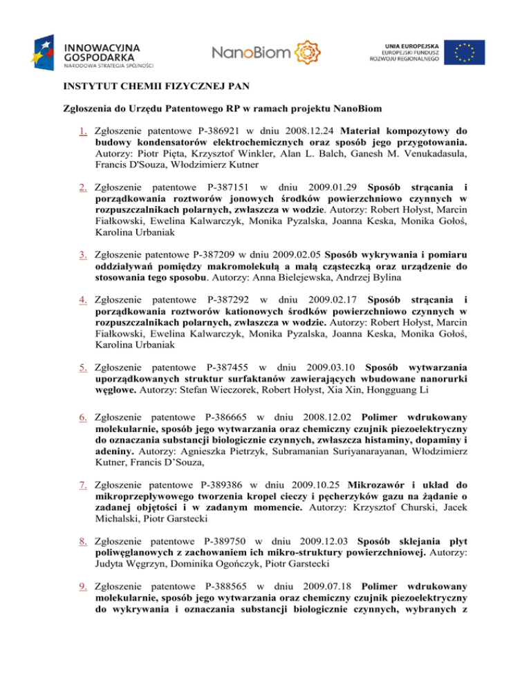 INSTYTUT CHEMII FIZYCZNEJ PAN Zgłoszenia do Urzędu Patentowego RP w ramach projektu NanoBiom 1. Zgłoszenie patentowe P-386921 w dniu 2008.12.24 Materiał kompozytowy do budowy kondensatorów elektrochemicznych oraz sposób jego przygotowania. Autorzy: Piotr Pięta, Krzysztof Winkler, Alan L. Balch, Ganesh M. Venukadasula, Francis D'Souza, Włodzimierz Kutner 2. Zgłoszenie patentowe P-387151 w dniu 2009.01.29 Sposób strącania i porządkowania roztworów jonowych środków powierzchniowo czynnych w rozpuszczalnikach polarnych, zwłaszcza w wodzie. Autorzy: Robert Hołyst, Marcin Fiałkowski, Ewelina Kalwarczyk, Monika Pyzalska, Joanna Keska, Monika Gołoś, Karolina Urbaniak 3. Zgłoszenie patentowe P-387209 w dniu 2009.02.05 Sposób wykrywania i pomiaru oddziaływań pomiędzy makromolekułą a małą cząsteczką oraz urządzenie do stosowania tego sposobu. Autorzy: Anna Bielejewska, Andrzej Bylina 4. Zgłoszenie patentowe P-387292 w dniu 2009.02.17 Sposób strącania i porządkowania roztworów kationowych środków powierzchniowo czynnych w rozpuszczalnikach polarnych, zwłaszcza w wodzie. Autorzy: Robert Hołyst, Marcin Fiałkowski, Ewelina Kalwarczyk, Monika Pyzalska, Joanna Keska, Monika Gołoś, Karolina Urbaniak 5. Zgłoszenie patentowe P-387455 w dniu 2009.03.10 Sposób wytwarzania uporządkowanych struktur surfaktanów zawierających wbudowane nanorurki węglowe. Autorzy: Stefan Wieczorek, Robert Hołyst, Xia Xin, Hongguang Li 6. Zgłoszenie patentowe P-386665 w dniu 2008.12.02 Polimer wdrukowany molekularnie, sposób jego wytwarzania oraz chemiczny czujnik piezoelektryczny do oznaczania substancji biologicznie czynnych, zwłaszcza histaminy, dopaminy i adeniny. Autorzy: Agnieszka Pietrzyk, Subramanian Suriyanarayanan, Włodzimierz Kutner, Francis D’Souza, 7. Zgłoszenie patentowe P-389386 w dniu 2009.10.25 Mikrozawór i układ do mikroprzepływowego tworzenia kropel cieczy i pęcherzyków gazu na żądanie o zadanej objętości i w zadanym momencie. Autorzy: Krzysztof Churski, Jacek Michalski, Piotr Garstecki 8. Zgłoszenie patentowe P-389750 w dniu 2009.12.03 Sposób sklejania płyt poliwęglanowych z zachowaniem ich mikro-struktury powierzchniowej. Autorzy: Judyta Węgrzyn, Dominika Ogończyk, Piotr Garstecki 9. Zgłoszenie patentowe P-388565 w dniu 2009.07.18 Polimer wdrukowany molekularnie, sposób jego wytwarzania oraz chemiczny czujnik piezoelektryczny do wykrywania i oznaczania substancji biologicznie czynnych, wybranych z grupy amin biogenicznych zwłaszcza melaminy. Autorzy: Agnieszka Pietrzyk, Raghu Chitta, Francesco Sanicolo, Patrizia R. Mussini 10. Zgłoszenie patentowe numer P-392411 Sposób modyfikacji powierzchni mikrokanałów wykonanych w obiekcie poliwęglanowym i obiekt poliwęglanowy zawierający mikrokanał zmodyfikowany tym sposobem. Autorzy: P. Jankowski, D. Ogończyk, P. Garstecki 11. Zgłoszenie patentowe numer P-392467 Sposób modyfikacji powierzchni poliwęglanu i powierzchnia poliwęglanu zmodyfikowana tym sposobem. Autorzy: Jankowski, L. Derzsi, P. Garstecki 12. Zgłoszenie patentowe numer P-391456 w dniu 11.06.2010. Sposób osadzania nanocząstek metalu na powierzchni oraz powierzchnia otrzymana tym sposobem. Autorzy: Joanna Niedziółka-Jonsson, Izabela Kamińska, Marcin Opałło 13. Zgłoszenie patentowe numer P-392364 w dniu 14.09.2010. Sposób osadzania nanocząstek metalu na powierzchni oraz powierzchnia otrzymana tym sposobem i jej zastosowanie. Autorzy: Joanna Niedziółka-Jonsson, Izabela Kamińska, Marcin Opałło, Agnieszka Kamińska, Robert Hołyst 14. Zgłoszenie patentowe numer P-392614 w dniu 11.10.2010. Pułapka feromonowa i system do automatycznego zliczania owadów w pułapce feromonowej. Autor: Jan Zasłona 15. Zgłoszenie patentowe numer P-392705 w dniu 20.10.2010. Ogniwo cynkowotlenowe i jego zastosowanie. Autorzy: Wojciech Nogala, Ewa Roźniecka, Marcin Opałło 16. Zgłoszenie patentowe numer P-393196 w dniu 10.12.2010. Biokatoda, sposób wykonania biokatody i ogniwo cynkowo-tlenowe obejmujące biokatodę. Autorzy: Ewa Roźniecka, Marcin Opałło, Martin Jönsson-Niedziółka, Joanna NiedziółkaJönsson, Katarzyna Szot 17. Zgłoszenie patentowe numer P-393311 w dniu 16.12.2010. Elektroda wielowarstwowa i jej zastosowanie. Autorzy: Anna Celebańska, Marcin Opałło, Adam Leśniewski, Dorota Tomaszewska 18. Zgłoszenie patentowe numer P- 393843 w dniu 03.02.2011. Nanoczastki pokryte ligandami hydrofilowymi, warstwa takich nanoczastek i powierzchnia pokryta taka warstwa. Autorzy: Sashuk Volodymyr, Marcin Fiałkowski, Robert Hołyst 19. Zgłoszenie patentowe numer P-393956 w dniu 18.02.2011. Materiał kompozytowy, zwłaszcza do budowy kondensatorów elektrochemicznych i kondensator elektrochemiczny. Autorzy: P. Pieta, I. Obraztsov, J. Sobczak, K. Winkler, A. L. Balch, S. Das, F. D’Souza, W. Kutner 20. Zgłoszenie patentowe numer P-395009 w dniu 25.05.2011. Sposób pokrywania powierzchni ciała stałego nanocząstkami i powierzchnia ciała stałego pokryta tym sposobem. Autorzy: J. Paczesny, 21. Zgłoszenie patentowe numer P-398219 w dniu 24.02.2012. „Pochodne bis(2,2’bitienylo)metanu, molekularnie wydrukowany polimer utworzony za pomocą polimeryzacji pochodnych bis(2,2’-bitienylo)metanu i zastosowanie warstwy tego polimeru do selektywnego oznaczania i uwalniania adrenaliny”, T.-P. Huynh, W. Lisowski, W. Kutner, K. C. Bikram, F. D'Souza. 22. Zgłoszenie patentowe numer P-398275 w dniu 29.02.2012. „Pochodne tiofenu, molekularnie wydrukowany polimer utworzony za pomocą polimeryzacji pochodnych tiofenu i zastosowanie tego polimeru do selektywnego oznaczania i kontrolowanego uwalniania adenozyno 5'-trifosforanu (ATP)”, T.-P. Huynh, A. Pietrzyk-Le, K. C. Bikram, K. Noworyta, J. W. Sobczak, F. D'Souza, W. Kutner. 23. Zgłoszenie patentowe P-402675 w dniu 12.02.2013. Bis(2,2’-bitienylo)metan podstawiony zasadą nukleinową i sposób jego wytwarzania, warstwa molekularnie wdrukowanego polimeru i sposób jej wytwa