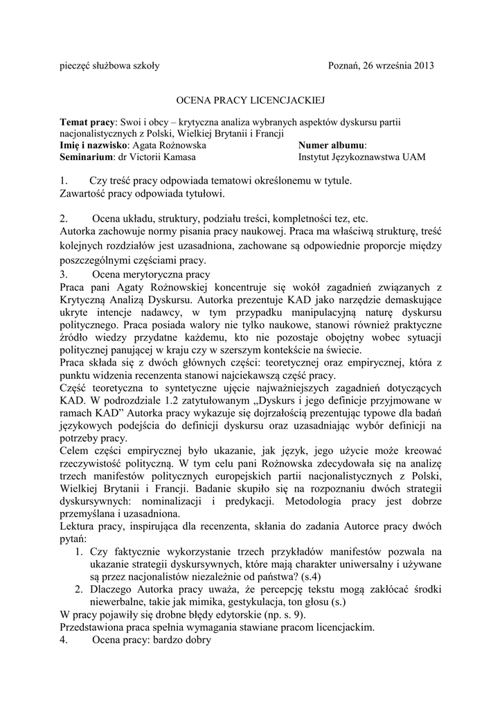pieczęć służbowa szkoły Poznań, 26 września 2013 OCENA PRACY LICENCJACKIEJ Temat pracy: Swoi i obcy – krytyczna analiza wybranych aspektów dyskursu partii nacjonalistycznych z Polski, Wielkiej Brytanii i Francji Imię i nazwisko: Agata Rożnowska Numer albumu: Seminarium: dr Victorii Kamasa Instytut Językoznawstwa UAM 1. Czy treść pracy odpowiada tematowi określonemu w tytule. Zawartość pracy odpowiada tytułowi. 2. Ocena układu, struktury, podziału treści, kompletności tez, etc. Autorka zachowuje normy pisania pracy naukowej. Praca ma właściwą strukturę, treść kolejnych rozdziałów jest uzasadniona, zachowane są odpowiednie proporcje między poszczególnymi częściami pracy. 3. Ocena merytoryczna pracy Praca pani Agaty Rożnowskiej koncentruje się wokół zagadnień związanych z Krytyczną Analizą Dyskursu. Autorka prezentuje KAD jako narzędzie demaskujące ukryte intencje nadawcy, w tym przypadku manipulacyjną naturę dyskursu politycznego. Praca posiada walory nie tylko naukowe, stanowi również praktyczne źródło wiedzy przydatne każdemu, kto nie pozostaje obojętny wobec sytuacji politycznej panującej w kraju czy w szerszym kontekście na świecie. Praca składa się z dwóch głównych części: teoretycznej oraz empirycznej, która z punktu widzenia recenzenta stanowi najciekawszą część pracy. Część teoretyczna to syntetyczne ujęcie najważniejszych zagadnień dotyczących KAD. W podrozdziale 1.2 zatytułowanym „Dyskurs i jego definicje przyjmowane w ramach KAD” Autorka pracy wykazuje się dojrzałością prezentując typowe dla badań językowych podejścia do definicji dyskursu oraz uzasadniając wybór definicji na potrzeby pracy. Celem części empirycznej było ukazanie, jak język, jego użycie może kreować rzeczywistość polityczną. W tym celu pani Rożnowska zdecydowała się na analizę trzech manifestów politycznych europejskich partii nacjonalistycznych z Polski, Wielkiej Brytanii i Francji. Badanie skupiło się na rozpoznaniu dwóch strategii dyskursywnych: nominalizacji i predykacji. Metodologia pracy jest dobrze przemyślana i uzasadniona. Lektura pracy, inspirująca dla recenzenta, skłania do zadania Autorce pracy dwóch pytań: 1. Czy faktycznie wykorzystanie trzech przykładów manifestów pozwala na ukazanie strategii dyskursywnych, które mają charakter uniwersalny i używane są przez nacjonalistów niezależnie od państwa? (s.4) 2. Dlaczego Autorka pracy uważa, że percepcję tekstu mogą zakłócać środki niewerbalne, takie jak mimika, gestykulacja, ton głosu (s.) W pracy pojawiły się drobne błędy edytorskie (np. s. 9). Przedstawiona praca spełnia wymagania stawiane pracom licencjackim. 4. Ocena pracy: bardzo dobry