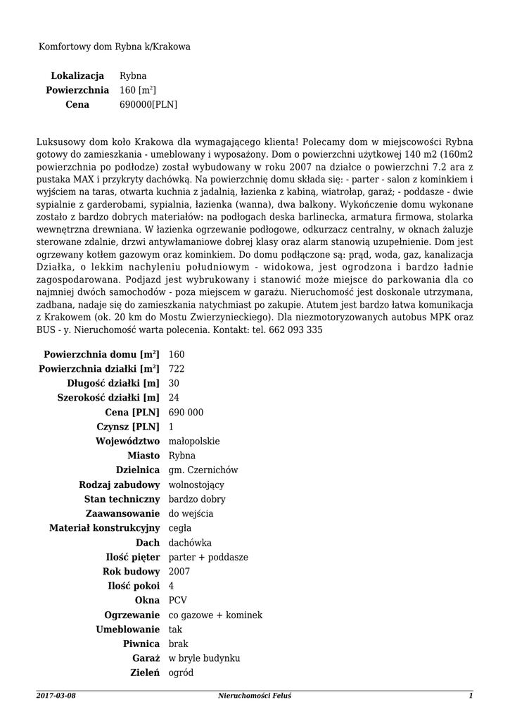 Komfortowy dom Rybna k/Krakowa Lokalizacja Rybna Powierzchnia Cena 160 [m2] 690000[PLN] Luksusowy dom koło Krakowa dla wymagającego klienta! Polecamy dom w miejscowości Rybna gotowy do zamieszkania - umeblowany i wyposażony. Dom o powierzchni użytkowej 140 m2 (160m2 powierzchnia po podłodze) został wybudowany w roku 2007 na działce o powierzchni 7.2 ara z pustaka MAX i przykryty dachówką. Na powierzchnię domu składa się: - parter - salon z kominkiem i wyjściem na taras, otwarta kuchnia z jadalnią, łazienka z kabiną, wiatrołap, garaż; - poddasze - dwie sypialnie z garderobami, sypialnia, łazienka (wanna), dwa balkony. Wykończenie domu wykonane zostało z bardzo dobrych materiałów: na podłogach deska barlinecka, armatura firmowa, stolarka wewnętrzna drewniana. W łazienka ogrzewanie podłogowe, odkurzacz centralny, w oknach żaluzje sterowane zdalnie, drzwi antywłamaniowe dobrej klasy oraz alarm stanowią uzupełnienie. Dom jest ogrzewany kotłem gazowym oraz kominkiem. Do domu podłączone są: prąd, woda, gaz, kanalizacja Działka, o lekkim nachyleniu południowym - widokowa, jest ogrodzona i bardzo ładnie zagospodarowana. Podjazd jest wybrukowany i stanowić może miejsce do parkowania dla co najmniej dwóch samochodów - poza miejscem w garażu. Nieruchomość jest doskonale utrzymana, zadbana, nadaje się do zamieszkania natychmiast po zakupie. Atutem jest bardzo łatwa komunikacja z Krakowem (ok. 20 km do Mostu Zwierzynieckiego). Dla niezmotoryzowanych autobus MPK oraz BUS - y. Nieruchomość warta polecenia. Kontakt: tel. 662 093 335 Powierzchnia domu [m2] 160 Powierzchnia działki [m2] 722 Długość działki [m] 30 Szerokość działki [m] 24 Cena [PLN] 690 000 Czynsz [PLN] 1 Województwo małopolskie Miasto Rybna Dzielnica gm. Czernichów Rodzaj zabudowy wolnostojący Stan techniczny bardzo dobry Zaawansowanie do wejścia Materiał konstrukcyjny cegła Dach dachówka Ilość pięter parter + poddasze Rok budowy 2007 Ilość pokoi 4 Okna PCV Ogrzewanie co gazowe + kominek Umeblowanie tak Piwnica brak Garaż w bryle budynku Zieleń ogród 2017-03-08 Nieruchomości Feluś 1 Zobacz wszystkie oferty z działu: Domy Kraków 2017-03-08 Nieruchomości Feluś 2