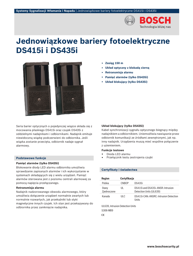 Systemy Sygnalizacji Włamania i Napadu | Jednowiązkowe bariery fotoelektryczne DS415i i DS435i Jednowiązkowe bariery fotoelektryczne DS415i i DS435i ▶ Zasięg 150 m ▶ Układ optyczny z blokadą cierną ▶ Retransmisja alarmu ▶ Pamięć alarmów (tylko DS435i) ▶ Układ blokujący (tylko DS435i) Seria barier optycznych o pojedynczej wiązce składa się z mocowania płaskiego DS415i oraz czujek DS435i z oddzielnymi nadajnikami i odbiornikami. Nadajnik emituje niewidoczną wiązkę podczerwieni do odbiornika. Jeśli wiązka zostanie przecięta, odbiornik nadaje sygnał alarmowy. Podstawowe funkcje Układ blokujący (tylko DS435i) Kabel synchronizacji sygnału optycznego biegnący między nadajnikiem a odbiornikiem. Uniemożliwia nawiązanie przez odbiornik komunikacji ze źródłami zewnętrznymi, jak np. inny nadajnik. Urządzenia muszą mieć wspólne połączenie z uziemieniem. Funkcje testowe • Dioda LED alarmu • Przełącznik testu zestrojenia czujki Pamięć alarmów (tylko DS435i) Blokowanie diody LED alarmu odbiornika umożliwia sprawdzanie zapisanych alarmów i ich wykorzystanie w systemach składających się z wielu urządzeń. Pamięć alarmów sterowana jest z poziomu centrali alarmowej za pomocą napięcia przełączanego. Retransmisja alarmu Nadajnik nadzorowanego obwodu alarmowego, który umożliwia dołączenie urządzeń normalnie zwartych lub normalnie rozwartych, jak przekaźniki lub styki magnetyczne innych czujek. Ich stan jest przekazywany do odbiornika przez zamknięcie nadajnika. Certyfikaty i świadectwa Region Certyfikacja Polska CNBOP DS435i Stany Zjednoczone UL DS415i and DS435i: ANSR: Intrusion Detection Units (UL639) Kanada ULC DS415i-CAN: ANSRC: Intrusion Detection Units UL639, Intrusion Detection Units S306-M89 X www.boschsecurity.pl 2 | Jednowiązkowe bariery fotoelektryczne DS415i i DS435i Dane techniczne Zamówienia - informacje Wiązka podczerwieni Zasięg DS415i: 150 m Zasięg DS435i: 150 m Obudowa Wymiary: 16,2 x 7,7 x 6,6 cm Materiał: pokrywa z udaroodpornego tworzywa Lexan®, podstawa z odlewu cynkowego Parametry środowiskowe Temperatura pra- -18°C do +49°C W przypadku instalacji z certyfikatem UL cy zakres temperatur pracy wynosi od 0°C do +49°C w pomieszczeniach. Instalacja Lokalizacja: montaż powierzchniowy Kierunkowość: ±90° w poziomie, ±20° w pionie Zasilanie Moc wejściowa: 8 do 14,5 VDC lub 12 VAC DS415i Czujka Bariera zasilana prądem stałym i przemiennym lub z akumulatora awaryjnego. Zawiera akumulator rezerwowy P333. Zasięg wynosi 150 m. DS415i DS415iDC Czujka Bariera zasilana wyłącznie prądem stałym. Zasięg wynosi 150 m. DS415iDC DS435i Bariera wysokiej klasy Bariera zasilana wyłącznie prądem stałym, wyposażona w pamięć alarmów i układ blokujący. Zasięg wynosi 150 m. DS435i Sprzęt P333 Akumulator Akumulator niklowo-kadmowy 3,6 V, 0,65 Ah P333 TC6000 Przewód testowy Przewód testowy do podłączenia styków testowych zgodnej czujki do woltomierza. Jego długość wynosi 4,6 m. TC6000 TR12 Transformator Transformator 12 VAC, 0,93 A TR12 Pobór prądu przez nadajnik 8 mA przy napięciu 12 VDC, 68 mA RMS przy bariery DS415i: zasilaniu z akumulatora Pobór prądu przez odbior- 33 mA przy napięciu 12 VDC, 95 mA RMS przy nik bariery DS415i: zasilaniu z akumulatora Pobór prądu przez nadajnik 8 mA przy napięciu 12 VDC bariery DS435i: Pobór prądu przez odbior- 20 mA przy napięciu 12 VDC nik bariery DS435i: Wyjście alarmowe: styki typu C o obciążalności 3,0 W, obciążenie rezystancyjne 125 mA przy napięciu 28 VDC Wyjście tampera: styk typu A o obciążalności 125 mA przy napięciu 28 VDC Znaki towarowe Lexan® jest znakiem towarowym lub zastrzeżonym znakiem towarowym firmy General Electric Company w Stanach Zjednoczonych i innych krajach. Poland Robert Bosch Sp. z o.o. Jutrzenki 105 str. 02-231 Warszawa Phone: +48 22 715 4101 Fax: +48 22 715 4105 [email protected] www.boschsecurity.pl © Robert Bosch Sp. z o.o./ Security Systems 2009 | Zastrzega się możliwość wprowadzania zmian T1171564299 | Cur: pl-PL, V7, 28 Sep 2009 | Src: en-US, V0, 26 Mar 2007 Represented by