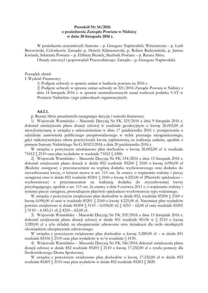Protokół Nr 34/2016 z posiedzenia Zarządu Powiatu w Nidzicy w dniu 30 listopada 2016 r. W posiedzeniu uczestniczyli: Starosta – p. Grzegorz Napiwodzki, Wicestarosta – p. Lech Brzozowski, Członkowie Zarządu: p. Henryk Klimaszewski, p. Robert Radzymiński, p. Janusz Kwiatek, Sekretarz Powiatu – p. Elżbieta Bieniek, Skarbnik Powiatu – p. Renata Mróz. Obrady otworzył i poprowadził Przewodniczący Zarządu – p. Grzegorz Napiwodzki. Porządek obrad: I. Wydział Finansowy: 1) Podjęcie uchwały w sprawie zmian w budżecie powiatu na 2016 r. 2) Podjęcie uchwały w sprawie zmian uchwały nr 221/2016 Zarządu Powiatu w Nidzicy z dnia 14 listopada 2016 r. w sprawie scentralizowanych zasad rozliczeń podatku VAT w Powiecie Nidzickim i jego jednostkach organizacyjnych. Ad.I.1. p. Renata Mróz przedstawiła następujące decyzje i wnioski finansowe: 1) Wojewoda Warmińsko – Mazurski Decyzją Nr FK 323/2016 z dnia 9 listopada 2016 r. dokonał zmniejszenia planu dotacji celowej w rozdziale geodezyjnym o kwotę 26.002,00 zł niewykorzystaną w związku z unieważnieniem w dniu 17 października 2016 r. postępowania o udzielenie zamówienia publicznego przeprowadzonego w trybie przetargu nieograniczonego, gdyż najkorzystniejsza oferta przewyższała kwotę zaplanowaną na realizację zadania, zgodnie z pismem Starosty Nidzickiego Nr G.3032.9.2016 z dnia 20 października 2016 r. W związku z powyższym zmniejszono plan dochodów o kwotę 26.002,00 zł w rozdziale 71012 § 2110 oraz plan wydatków w rozdziale 71012 § 4300. 2) Wojewoda Warmińsko – Mazurski Decyzją Nr FK 334/2016 z dnia 15 listopada 2016 r. dokonał zwiększenia planu dotacji w dziale 852 rozdziale 85204 § 2160 o kwotę 6.096,00 zł (Rodziny zastępcze) z przeznaczeniem na wypłatę dodatku wychowawczego oraz dodatku do zryczałtowanej kwoty, o którym mowa w art. 115 ust. 2a ustawy o wspieraniu rodziny i pieczy zastępczej oraz w dziale 852 rozdziale 85201 § 2160 o kwotę 4.225,00 zł (Placówki opiekuńczo – wychowawcze) z przeznaczeniem na realizację dodatku do zryczałtowanej kwoty przysługującego, zgodnie z art. 115 ust. 2a ustawy z dnia 9 czerwca 2011 r. o wspieraniu rodziny i systemu pieczy zastępcze, prowadzącym placówki opiekuńczo-wychowawcze typu rodzinnego. W związku z powyższym zwiększono plan dochodów w dziale 852, rozdziale 85204 § 2160 o kwotę 6.096,00 zł oraz w rozdziale 85201 § 2160 o kwotę 4.225,00 zł. Natomiast plan wydatków powiatu zwiększono w dziale 85204 § 3110 – 6.034,00 zł; § 4210 – 62,00 zł oraz rozdziale 85201 § 3110 – 4.183,11 zł; § 4210 – 62,00 zł. 3) Wojewoda Warmińsko - Mazurski Decyzją Nr FK 335/2016 z dnia 15 listopada 2016 r. dokonał zwiększenia planu dotacji celowej w dziale 851 rozdziale 85156 w § 2110 o kwotę 3.289,00 zł z tyłu składek na ubezpieczenie zdrowotne oraz świadczeń dla osób nieobjętych obowiązkiem ubezpieczenia zdrowotnego. W związku z powyższym zwiększono plan dochodów o kwotę 3.289,00 zł – w dziale 851 rozdziale 85156 § 2110 oraz plan wydatków w w/w rozdziale § 4130. 4) Wojewoda Warmińsko – Mazurski Decyzją Nr FK 346/2016 dokonał zwiększenia planu dotacji celowej w dziale 852 rozdziale 85203 § 2110 o kwotę 17.232,00 zł z tytułu pomocy dla Środowiskowego Domu Społecznej. W związku z powyższym zwiększono plan dochodów o kwotę 17.232,00 zł w dziale 852 rozdziale 85203 § 2110 oraz plan wydatków w dziale 852 rozdziale 85203 § 2820. 5) Powiatowy Urząd Pracy w Nidzicy wnioskuje o: - zmniejszenie środków w rozdziale 85333 w § 4300 o kwotę 1.500,00 zł; - zwiększenie środków w rozdziale 85333 w § 4270 o kwotę 200,00 zł (zakup usług remontowych) i w § 4700 o kwotę 1300,00 zł (szkolenia pracowników). 6) Komenda Powiatowej Państwowej Straży Pożarnej w Nidzicy wnioskuje o następujące zmiany w planie wydatków budżetowych w dziale 754 rozdziale 75411: - zmniejszenie wydatków: § 4040 (dodatkowe wynagrodzenie roczne) o kwotę 294,96 zł; §4050 (uposażenia żołnierzy zawodowych oraz funkcjonariuszy) o kwotę 3.201,74 zł; § 4070 (dodatkowe uposażenie roczne dla żołnierzy zawodowych oraz nagrody roczne dla funkcjonariuszy) o kwotę 5.661,01 zł; § 4110 (składki na ubezpieczenia społeczne) o kwotę 450,00 zł; §4120 (składki na Fundusz Pracy) o kwotę 800,00 zł; § 4180 (Równoważniki pieniężne i ekwiwalenty dla żołnierzy i funkcjonariuszy oraz pozostałe należności) o kwotę 5.078,30 zł; § 4280 (zakup usług zdrowotnych) o kwotę 1.500,00 zł; § 4360 (opłaty z tytułu usług telekomunikacyjnych) o kwotę 1000,00 zł; § 4430 (różne opłaty i składki) o kwotę 2.000,00 zł – łącznie o kwotę 19.986,01 zł; - zwiększenie wydatków: § 4060 (inne należności żołnierzy zawodowych oraz funkcjonariuszy zaliczane do wynagrodzeń) o kwotę 5.002,00 zł; § 4210 (zakup materiałów i wyposażenia) o kwotę 14.724,01 zł; § 4410 (podróże służbowe krajowe) o kwotę 260,00 zł – łącznie o kwotę 19.986,01 zł. Zaoszczędzone środki finansowe w §§ 4040, 4050, 4070, 4110, 4120, 4180, 4280, 4360, 4430 zostaną przeznaczone na wydatki bieżące, w tym m.in. na: - fundusz nagród funkcjonariuszy (§ 4060)-z.), z § 4050 – 3.201,74 zł, z § 4070 – 1.800,26 zł. - delegacje funkcjonariuszy podnoszących kwalifikacje w szkołach pożarniczych (§ 4410), - zakup paliwa, materiałów łączności oraz wyposażenia specjalnego dla funkcjonariuszy (§ 4210). Następnie Skarbnik omówiła zmiany w planach budżetów poszczególnych jednostek oświatowych:: 1) Poradnia Psychologiczno – Pedagogiczna w Nidzicy wnioskuje o dokonanie następujących zmian w planie wydatków budżetowych: - zmniejszenie wydatków o kwotę 8.019,00 zł; - zwiększenie wydatków o kwotę 21.566,00 zł. Powyższe zmiany uzasadnia się tym, iż zmniejszenie w § 4040 wynika z mniejszej w stosunku do planowanej wypłaty dodatkowego wynagrodzenia rocznego za 2015 r. Oszczędn