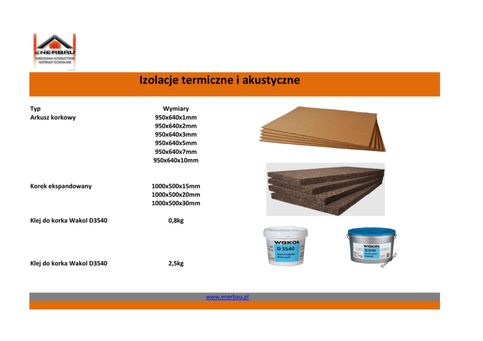 Izolacje termiczne i akustyczne Typ Arkusz korkowy Wymiary 950x640x1mm 950x640x2mm 950x640x3mm 950x640x5mm 950x640x7mm 950x640x10mm Korek ekspandowany 1000x500x15mm 1000x500x20mm 1000x500x30mm Klej do korka Wakol D3540 0,8kg Klej do korka Wakol D3540 2,5kg www.enerbau.pl