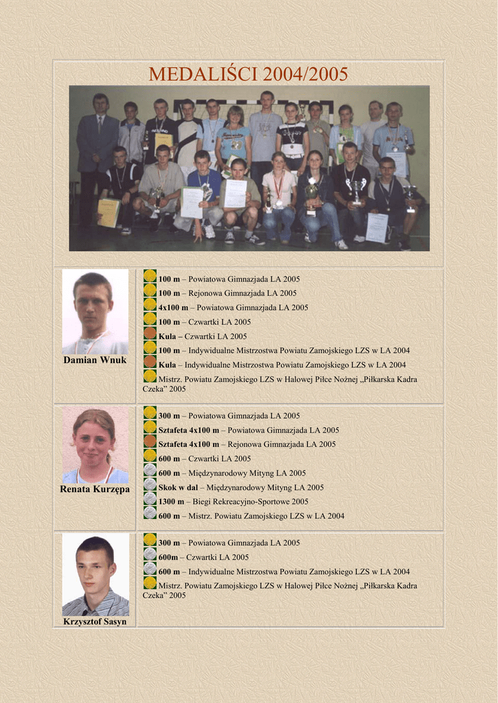 MEDALIŚCI 2004/2005 100 m – Powiatowa Gimnazjada LA 2005 100 m – Rejonowa Gimnazjada LA 2005 4x100 m – Powiatowa Gimnazjada LA 2005 100 m – Czwartki LA 2005 Kula – Czwartki LA 2005 100 m – Indywidualne Mistrzostwa Powiatu Zamojskiego LZS w LA 2004 Damian Wnuk Kula – Indywidualne Mistrzostwa Powiatu Zamojskiego LZS w LA 2004 Mistrz. Powiatu Zamojskiego LZS w Halowej Piłce Nożnej „Piłkarska Kadra Czeka” 2005 300 m – Powiatowa Gimnazjada LA 2005 Sztafeta 4x100 m – Powiatowa Gimnazjada LA 2005 Sztafeta 4x100 m – Rejonowa Gimnazjada LA 2005 600 m – Czwartki LA 2005 600 m – Międzynarodowy Mityng LA 2005 Renata Kurzępa Skok w dal – Międzynarodowy Mityng LA 2005 1300 m – Biegi Rekreacyjno-Sportowe 2005 600 m – Mistrz. Powiatu Zamojskiego LZS w LA 2004 300 m – Powiatowa Gimnazjada LA 2005 600m – Czwartki LA 2005 600 m – Indywidualne Mistrzostwa Powiatu Zamojskiego LZS w LA 2004 Mistrz. Powiatu Zamojskiego LZS w Halowej Piłce Nożnej „Piłkarska Kadra Czeka” 2005 Krzysztof Sasyn Skok w dal – Powiatowa Gimnazjada LA 2005 Sztafeta 4x100 m – Powiatowa Gimnazjada LA 2005 Skok w dal – Czwartki LA 2005 100 m – Międzynarodowy Mityng LA 2005 Skok w dal – Międzynarodowy Mityng LA 2005 Marcin Kuśmierz 2000 m - Powiatowa Gimnazjada LA 2005 2000 m - Rejonowa Gimnazjada LA 2005 600 m – Międzynarodowy Mityng LA 2005 Mateusz Rozkres 100 m – Powiatowa Gimnazjada LA 2005 Sztafeta 4x100 m – Powiatowa Gimnazjada LA 2005 100 m – Rejonowa Gimnazjada LA 2005 Sztafeta 4x100 m – Rejonowa Gimnazjada LA 2005 Agnieszka Skraban 600 m – Indywidualne Mistrzostwa Powiatu Zamojskiego LZS w LA 2005 Sztafeta 4x100 m – Powiatowa Gimnazjada LA 2005 Mistrz. Powiatu Zamojskiego LZS w Halowej Piłce Nożnej „Piłkarska Kadra Czeka” 2005 Stanisław Bodys Skok w dal – Indywidualne Mistrzostwa Powiatu Zamojskiego LZS w LA 2004 Skok w dal – Czwartki LA 2005 Edyta Firek Sztafeta 4x100 m – Powiatowa Gimnazjada LA 2005 Sztafeta 4x100 m – Rejonowa Gimnazjada LA 2005 600 m – Indywidualne Mistrzostwa Powiatu Zamojskiego LZS w LA 2004 Ewelina Pejda Oszczep – Indywidualne Mistrzostwa Powiatu Zamojskiego LZS w LA 2005 Ewa Bodziuch Kula – Indywidualne Mistrzostwa Powiatu Zamojskiego LZS w LA 2005 Sylwia Albingier Sztafeta 4x100 m – Powiatowa Gimnazjada LA 2005 Sztafeta 4x100 m – Rejonowa Gimnazjada LA 2005 Ewa Bondyra 1000 m – Indywidualne Mistrzostwa Powiatu Zamojskiego LZS w LA 2004 Radosław Żuk 600 m – Indywidualne Mistrzostwa Powiatu Zamojskiego LZS w LA 2004 Radosław Pańczyk 600 m – Międzynarodowy Mityng La 2005 Piotr Batalia Oszczep – Czwartki LA 2005 Rafał Prass Mistrz. Powiatu Zamojskiego LZS w Halowej Piłce Nożnej „Piłkarska Kadra Czeka” 2005 Paweł Pilipczuk Mistrz. Powiatu Zamojskiego LZS w Halowej Piłce Nożnej „Piłkarska Kadra Czeka” 2005 Damian Kowalczuk Kula – Powiatowa Gimnazjada LA 2005 Kula – Czwartki LA 2005 Kula – Międzynarodowy Mityng LA 2005 Kula – Indywidualne Mistrzostwa Powiatu Zamojskiego LZS w LA 2004 Anna Cirut Kula – Międzynarodowy Mityng LA 2005 Łukasz Ćwierz Sztafeta 4x100 m – Powiatowa Gimnazjada LA 2005 Szczepan Kania Powiatowa Gimnazjada SZS w Sztafetowych Biegach Przełajowych Zbigniew Podkański nauczyciel w-f Grzegorz Pyś Stanisław Bodys Krzysztof Sasyn Damian Wnuk Krzysztof Pyś Bartłomiej Bajaka Radosław Żuk Mateusz Rozkres Adrian Korneluk Radosław Pańczyk 2004 I miejsce