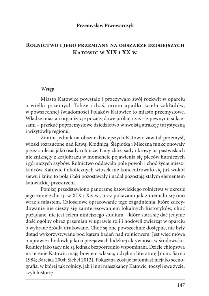 Przemysław Piwowarczyk Rolnictwo i jego przemiany na obszarze dzisiejszych Katowic w XIX i XX w. Wstęp Miasto Katowice powstało i przeżywało swój rozkwit w oparciu o wielki przemysł. Także i dziś, mimo upadku wielu zakładów, w powszechnej świadomości Polaków Katowice to miasto przemysłowe. Władze miasta i organizacje pozarządowe próbują zaś – z pewnymi sukcesami – przekuć poprzemysłowe dziedzictwo w swoistą atrakcję turystyczną i wizytówkę regionu. Zanim jednak na obszar dzisiejszych Katowic zawitał przemysł, wioski rozrzucone nad Rawą, Kłodnicą, Ślepiotką i Mleczną funkcjonowały przez stulecia jako osady rolnicze. Łany zbóż, sady i krowy na pastwiskach nie zniknęły z krajobrazu w momencie pojawienia się pieców hutniczych i górniczych szybów. Rolnictwo oddawało pole powoli i choć życie mieszkańców Katowic i okolicznych wiosek nie koncentrowało się już wokół siewu i żniw, to pola i łąki pozostawały i nadal pozostają stałym elementem katowickiej przestrzeni. Poniżej przedstawiono panoramę katowickiego rolnictwa w okresie jego zmierzchu tj. w XIX i XX w., oraz pokazano jak zmieniało się ono wraz z miastem. Całościowe opracowanie tego zagadnienia, które zdecydowanie nie cieszy się zainteresowaniem lokalnych historyków, choć pożądane, nie jest celem niniejszego studium – które stara się dać jedynie dość ogólny obraz przemian w uprawie roli i hodowli zwierząt w oparciu o wybrane źródła drukowane. Choć są one powszechnie dostępne, nie były dotąd wykorzystywane pod kątem badań nad rolnictwem. Jest więc mówa o uprawie i hodowli jako o przejawach ludzkiej aktywności w środowisku. Rolnicy jako tacy nie są jednak bezpośrednio wspominani. Dzieje chłopstwa na terenie Katowic mają bowiem własną, odrębną literaturę [m.in. Sarna 1984; Barciak 2004; Siebel 2012]. Pokazana zostaje natomiast niejako scenografia, w której tak rolnicy, jak i inni mieszkańcy Katowic, toczyli swe życie, czyli historię. 147 Vademecum Śląsk: badania śląskoznawcze Uprawa roli Podstawowym pytaniem, które należy sobie postawić badając dzieje rolnictwa na obszarze dzisiejszych Katowic, jest pytanie o areał upraw i strukturę zasiewów, oraz o ich zmienność w czasie. Aby stwierdzić, jak zmieniał się krajobraz miasta i okolic, a pośrednio jaką rolę w ich życiu gospodarczym odgrywała uprawa roli, najłatwiej obliczyć stosunek różnego typu użytków rolnych w miejscowościach wchodzących dziś w skład Katowic do obszaru współczesnego miasta. Tego typu próba została już podjęta. Stanisław Czaja [1995: 7] przedstawił zmiany sposobu zagospodarowania gruntów na obszarze dzisiejszych Katowic w ostatnich dwóch stuleciach, które obrazuje poniższa tabela. Tabela 1. Zmiany w użytkowaniu ziemi na obszarze dzisiejszych Katowic [Czaja 1995: 7]. Rok 1801 1860 1910 1960 1985 grunty orne km2 % 28,5 17,4 32,97 20,1 30,53 18,6 21,33 13,0 11,91 7,3 łąki i pastwiska km2 % 16,5 10,1 9,3 5,67 9,8 6,0 9,2 5,6 8,41 5,1 lasy km2 103,3 113,1 108,6 83,0 73,9 % 67,3 69,0 66,3 50,6 45,1 Wyniki badań Czai pokazują stały spadek powierzchni gruntów ornych począwszy od połowy XIX w., a zwłaszcza w XX w., przy niewielkich tylko wahaniach powierzchni łąk i pastwisk. Czaja nie podaje niestety podstaw swych wyliczeń, ale można podejrzewać – opierając się na podanej przez niego literaturze, że korzystał ze źródeł kartograficznych. W tym miejscu trzeba powiedzieć, że są one bardzo nieprecyzyjne. Zwłaszcza dla przełomu XIX w. możemy mówić jedynie o szacunkach. Jak trudne do oszacowania są te liczby pokazują zmiany w wyliczeniach, które Stanisław Czaja wniósł ponad 25 lat później, nie wyjaśniając jednak przyczyn rozbieżności względem swych wcześniejszych badań: 148 CZĘŚĆ I: Śląsk w perspektywie nauk społecznych 1 Tabela 2. Zmiany w użytkowaniu ziemi na obszarze dzisiejszych Katowic [Absalon, Czaja, Jankowski 2012: 73]. rok 1801 1910 20001 grunty orne łąki i pastwiska km2 % km2 % 41,0 24,8 22,3 13,5 57,3 34,7 10,6 6,4 22,9 km2 13,9% lasy km2 94,3 87,1 75,5 % 57,2 52,8 45,8 W opartych na kartografii pracach Czai bardzo cenne jest wskazanie obszarów koncentracji aktywności rolniczej. Dla XIX i początku XX w. to, przede wszystkim, północne i południowo-zachodnie obszary Katowic. Na przełomie XX i XXI w. uprawa roli zanikła natomiast niemal zupełnie w dzielnicach północnych, za wyjątkiem wyspowych upraw na obszarze Dąbrówki Małej i Roździenia. Znacząca ilość upraw występuje jednak nadal na krańcach południowo-zachodnich miasta – w Podlesiu, Zarzeczu i Kostuchnie [Absalon, Czaja, Jankowski 2012: 72]. Poniżej podjęta zostanie próba weryfikacji obliczeń Czai dla połowy XIX w., w oparciu o dane pochodzące z innego źródła niż kartografia. Takim wyjątkowym źródłem do całościowego zbadania areałów upraw (a także hodowli zwierząt) na obszarze dzisiejszych Katowic jest Topographisches Handbuch von Oberschlesien, opracowane na zlecenie władz rejencji opolskiej przez asesora tej rejencji – Feliksa Triesta. Dzieło to oparte jest zarówno na oficjalnych danych statystycznych, jak i na informacjach uzyskanych od urzędników, policjantów i prywatnych osób [Triest 1864: IV]. Stąd dane te często są niejednorodne i z trudem dają się ze sobą porównywać. Niemniej są niezastąpione, jeśli idzie o zbadanie charakteru rolnictwa na interesującym nas terenie. Triest rozdziela w swoich opisach grunta dworskie i gminne (stosując dla jednych i drugich rozmaite nazwy). Ogólnie rzecz biorąc, grunta gminne leżały na obszarach podległych samorządom wiejskim, utworzonym w efekcie pruskiej reformy uwłaszczeniowej z pierwszej połowy XIX w., grunty dworskie znajdowały się na obszarach dworskich, będących swoistymi reliktami feudalizmu. Nie funkcjonowały w nich żadne formy samorządu, a rolę naczelników pełnili właściciele majątków. N
